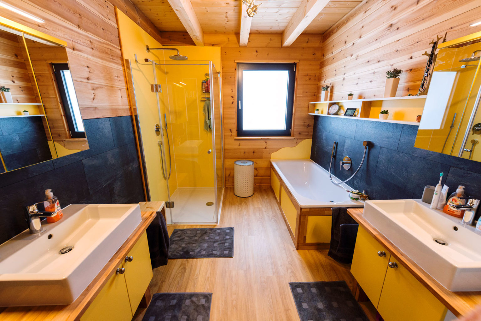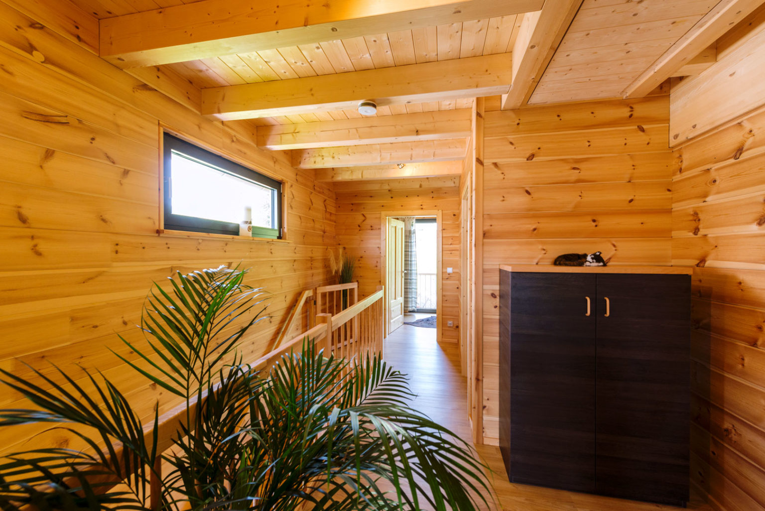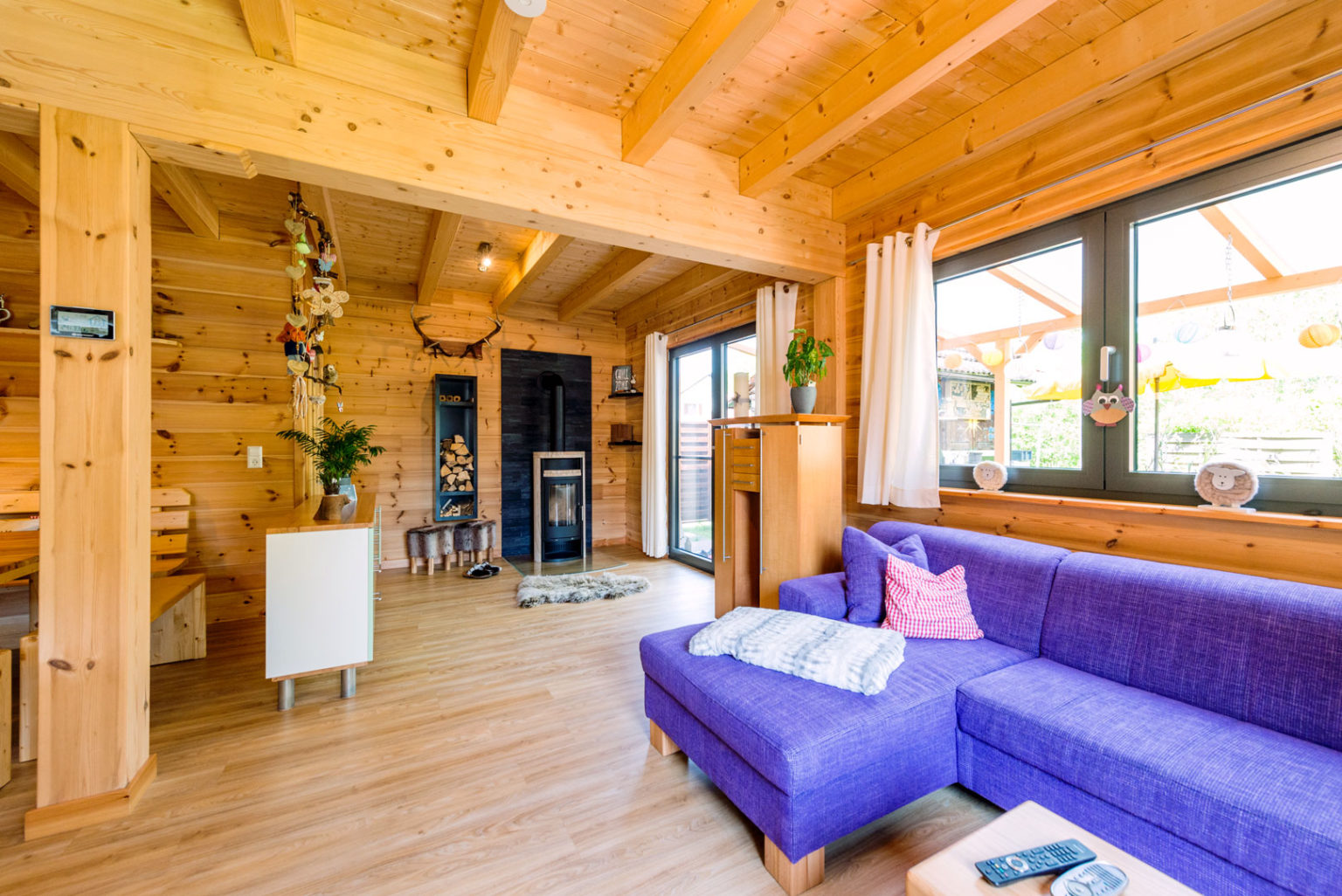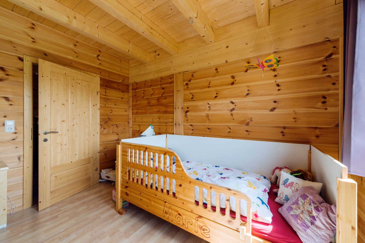 Das Dachgeschoss von Holzhaus „am Urbach“ beherbergt zwei Kinderzimmer, ein Bad, ein separates WC und ein Schlafzimmer; alle Räume sind vom Flur aus zu erreichen. „Einen Keller haben wir nicht, aber einen großen Dachboden, auf dem wir viel deponieren können. Außerdem gibt es einen Geräteschuppen im Garten.“, erklärt der Hausherr. Über die niedrigen Heizkosten freut sich die Familie besonders, vor allem, da der errechnete U-Wert einen höheren Verbrauch vermuten ließe. „Die Holzwände sind immer warm, wenn man darüber streicht. Auch im Winter. Das wirkt sich positiv auf die gefühlte Temperatur aus.“, vermutet die Dame des Hauses. Die Heizung wird mit einer Luft-Wärmepumpe betrieben und für besonders behagliche Strahlungswärme sorgt ein Holz-Kaminofen im Wohnbereich. „Die einzigen Gewerke, die wir an Fachfirmen vergeben haben, sind Elektrik und Flaschner. Und bei den Fenstern haben wir uns ausnahmsweise nicht für Holz entschieden, sondern anthrazit farbiges Alu gewählt. Farblich passend zum Hausdach und den Pflastersteinen.“, ergänzt Stefan Bügler. Rundum wohl fühlt sich das glückliche Paar in seinem individuellen klassischen Holzhaus und freut sich immer aufs nachhause kommen.