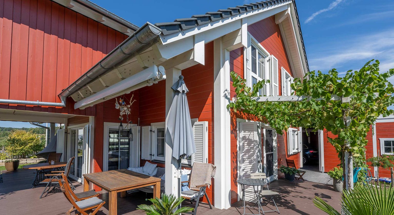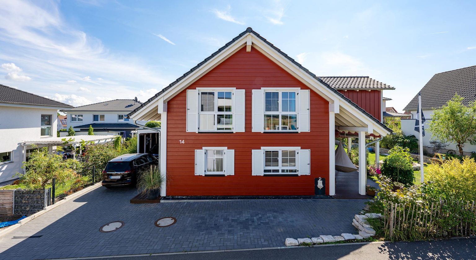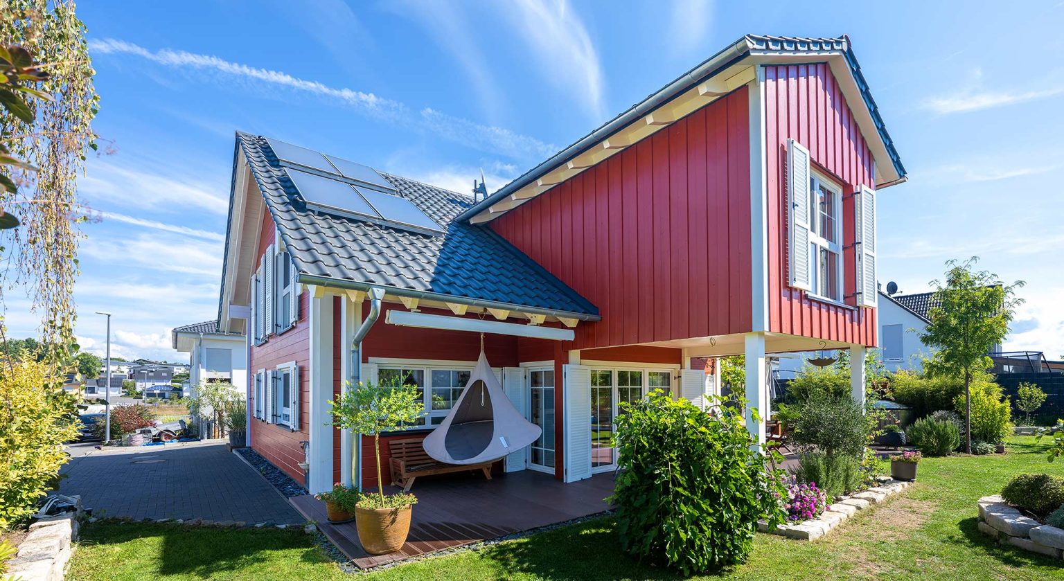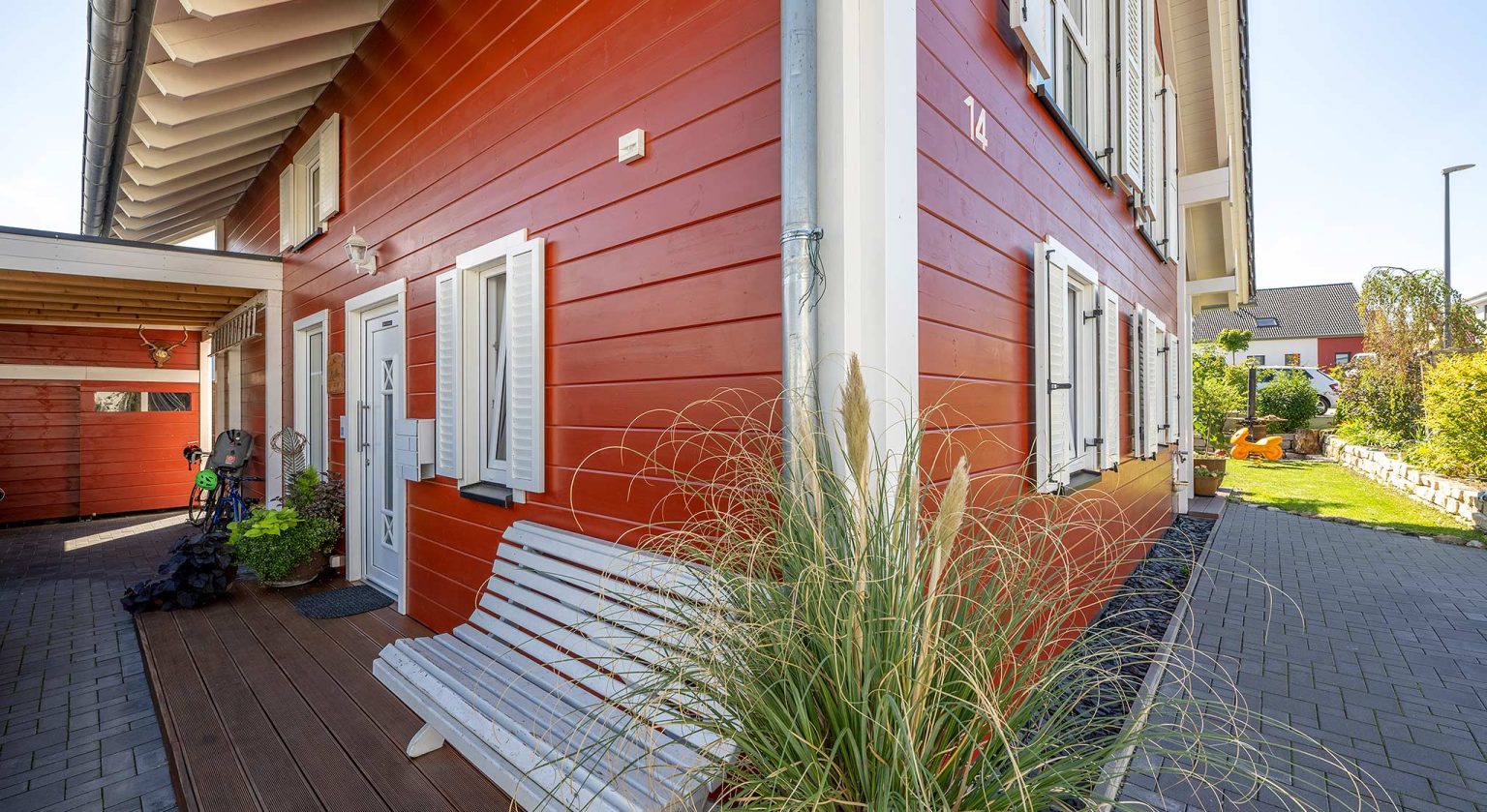 Als die Eigentümer von Holzhaus „an der Aisch“ zu Fullwood Wohnblockhaus kamen, waren sie noch offen für alle Bauweisen – danach nicht mehr, ein einschaliges Holzhaus musste es dann aber nicht sein. Damit das Holz nicht vergraut oder nach ein paar Jahren nachgestrichen werden muss, entschied man sich für einen deckenden Anstrich in „Schwedenrot“. In Kombination mit weißen Elementen, wie Sprossenfenstern und Fensterläden wirkt das Ganze sehr frisch und einladend.