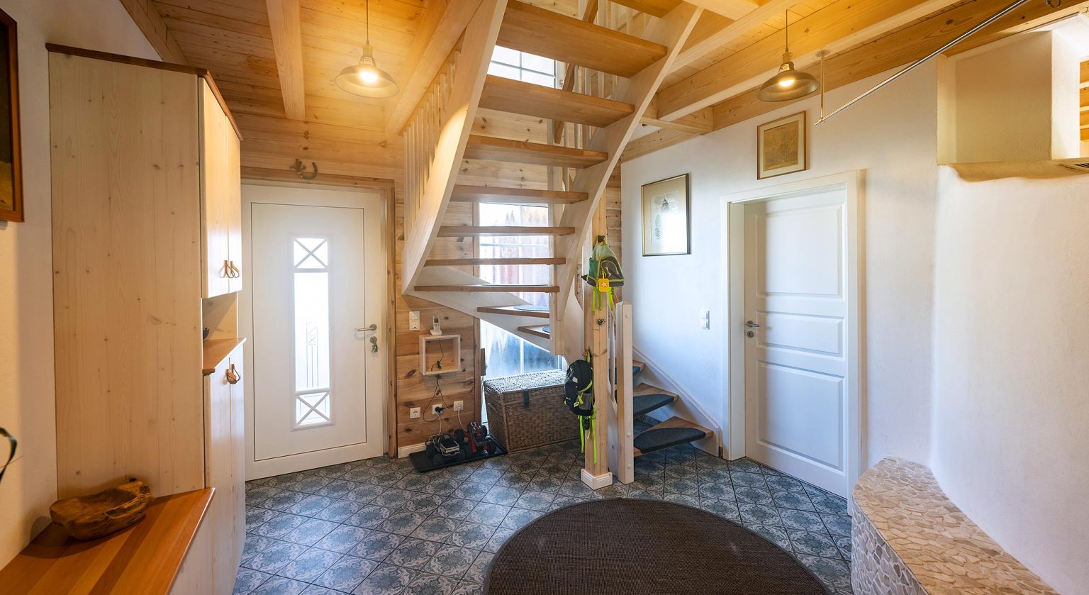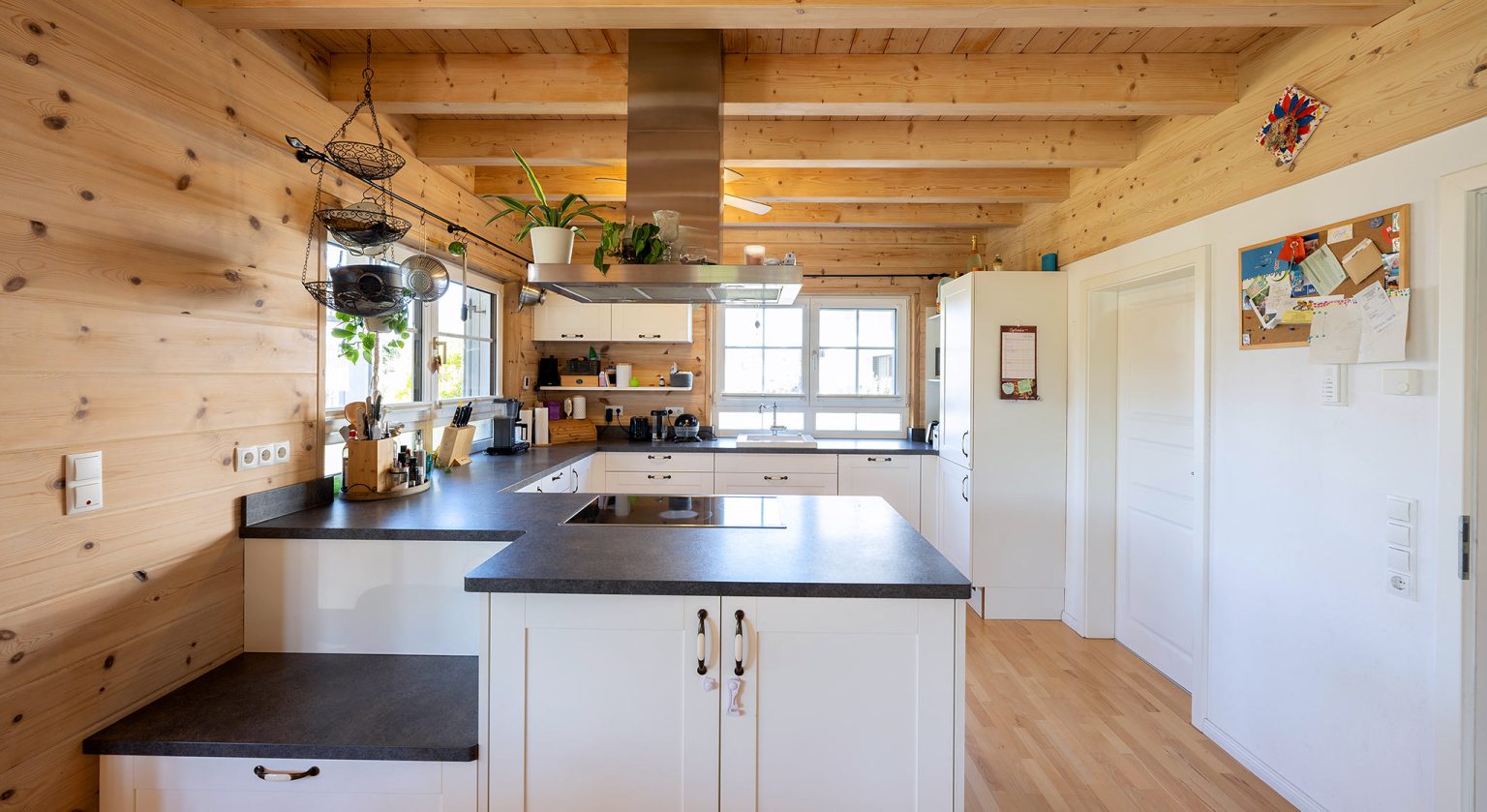 Sein Holzhaus ließ das Eigentümerpaar komplett von Fullwood aufbauen, inklusive Dach und Fenstern. Für Elektrik, Wasser und Heizung engagierte man regionale Fachhandwerker und erledigte den Rest tatkräftig selbst. Die Hausplanung erfolgte im Vorfeld gemeinsam mit dem Holzhausspezialisten ganz nach den eigenen Wünschen. Nachträglich baute man später noch mit einer ortsansässigen befreundeten Firma an und ergänzte die horizontale Balkenoptik der Fullwood-Wände mit vertikalen Holzverkleidungen. Priorität hatte bei der Planung eine zum Wohnzimmer hin offene Küche, eine Sichtbalkendecke sowie die gestalterisch im Innenbereich flexible Kombiblockwand. Zwei gleichgroße Kinderzimmer mussten sein, das dritte Kind war zu dem Zeitpunkt nicht eingeplant und im Nachhinein der Grund für den Anbau im Obergeschoss. Des Weiteren wollten die Eigentümer von Holzhaus „an der Aisch“ große Dachüberstände und weiß verschalte Dachschrägen im Dachgeschoss. Da das Gebäude nicht unterkellert ist, brauchte man unbedingt einen Dachboden.