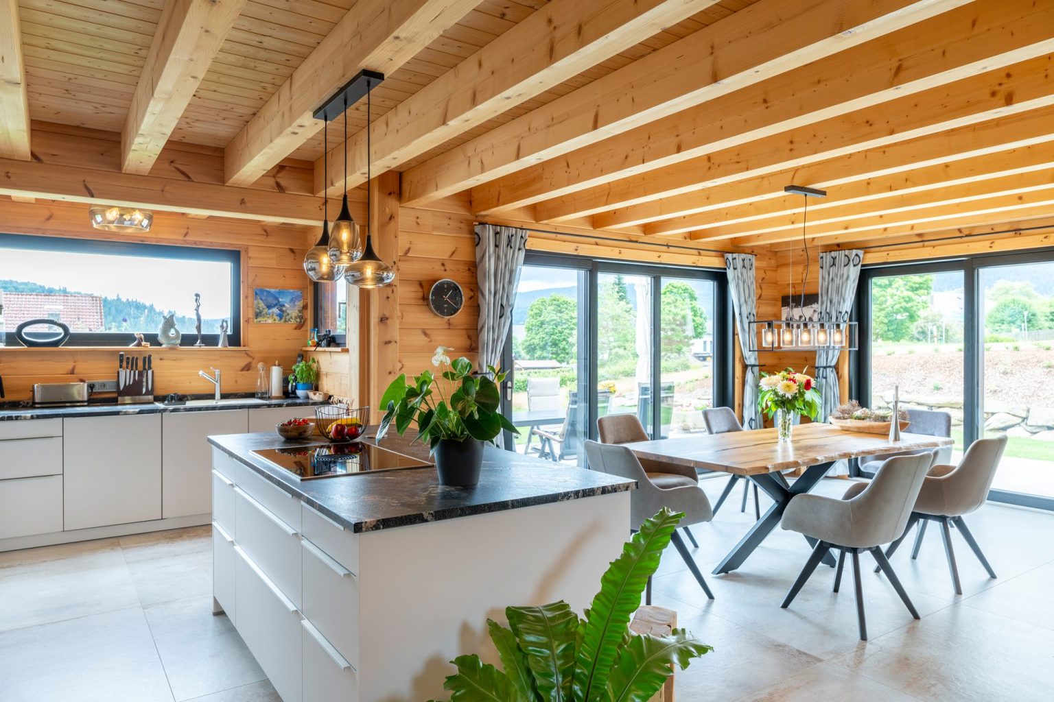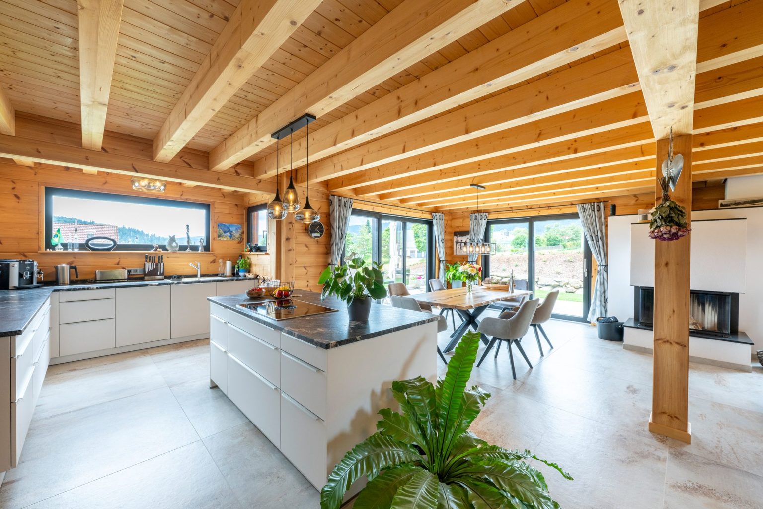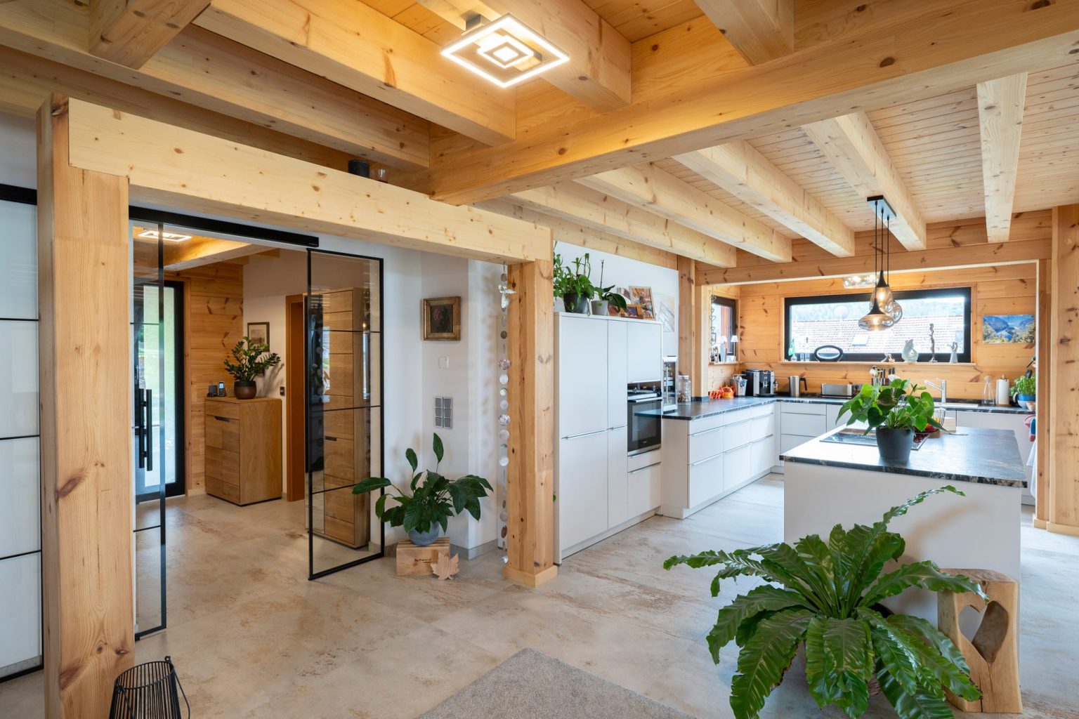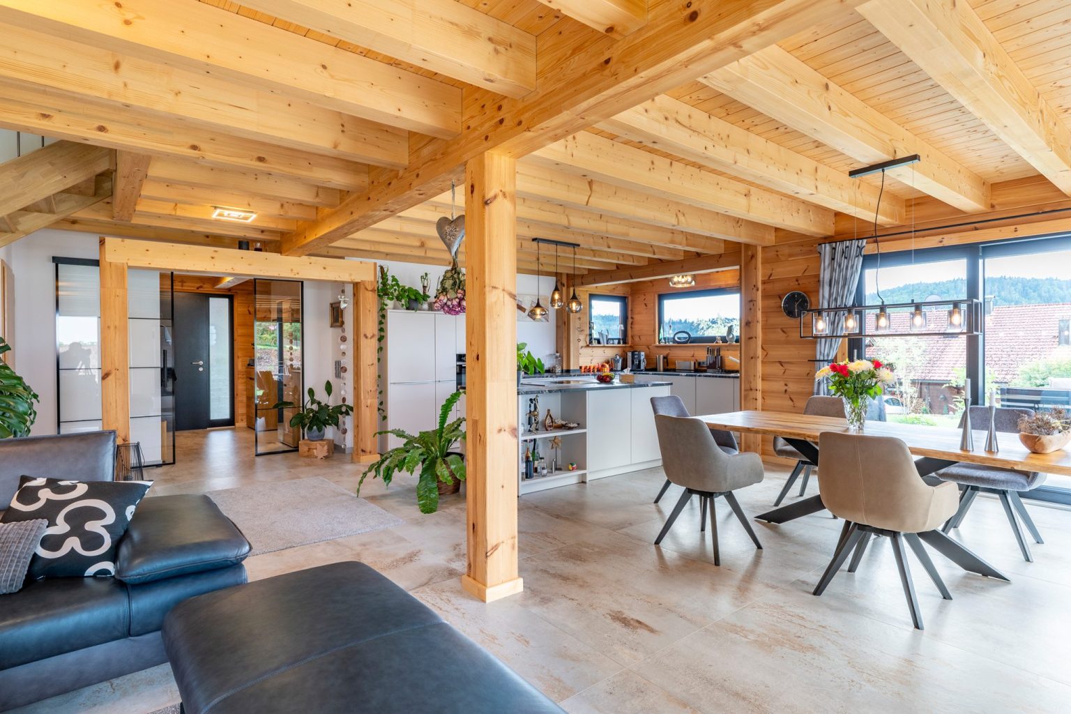 „Das Klima in unserem Holzhaus ist immer behaglich und sehr angenehm, egal zu welcher Jahreszeit.“, stellt der Hausherr fest. Die ungedämmten Blockwände aus echtem Polarkiefernholz isolieren sehr gut und lassen weder Hitze noch Kälte eindringen. Sie duften nicht nur dezent nach Kiefernwald, sondern fühlen sich stets handwarm an und haben einen ganz besonderen Effekt auf die Psyche: In einer Umgebung aus Holz fühlt man sich schon bei niedrigerer Zimmertemperatur wohlig warm und sogar entspannter als zwischen weißen Betonwänden. Es muss also weniger geheizt werden im Winter. Außerdem ist das Bauholz aller Fullwood Wohnblockhäuser chemisch unbehandelt und somit jedes Holzhaus ausdünstungsfrei, sofern man alle Ausbaumaterialien darauf abstimmt. Die Blockwände sind diffusionsoffen und gleichzeitig winddicht, sodass es sich im Holzhaus „Arberblick“ stets ohne Zugluft durchatmen lässt. „Ausschließlich Holz wollten wir nicht, das wäre uns zu viel gewesen. Deshalb verputzten wir alle Trennwände (leichte Ständerbauweise) glatt weiß und wählten sandfarbene Bodenfliesen im Erdgeschoss.“, erklärt Andrea Treml. So schufen sie und ihr Mann ein helles, ruhiges Zuhause, das Dank bodentiefer Fenster mit natürlichem Licht durchflutet ist. Äußerlich kommt Holzhaus „Arberblick“ hingegen dunkler und gesetzter daher mit seinem warmen, mittelbraunen Außenanstrich, den schwarzen Fenstern und den anthrazitfarbenen Dachziegeln. Umso überraschter ist man, wenn man das helle, offen gestaltete Innere des Holzhauses betritt.