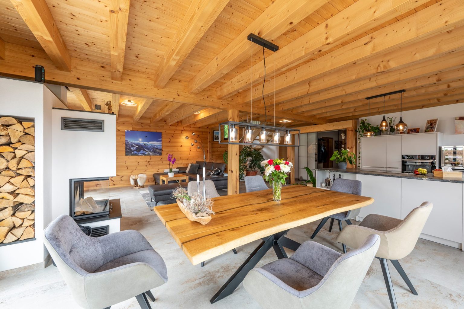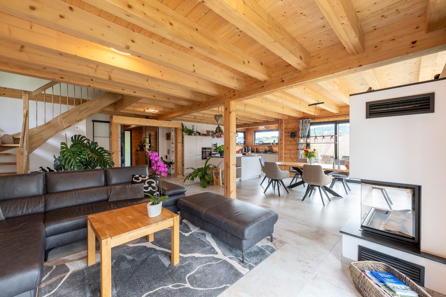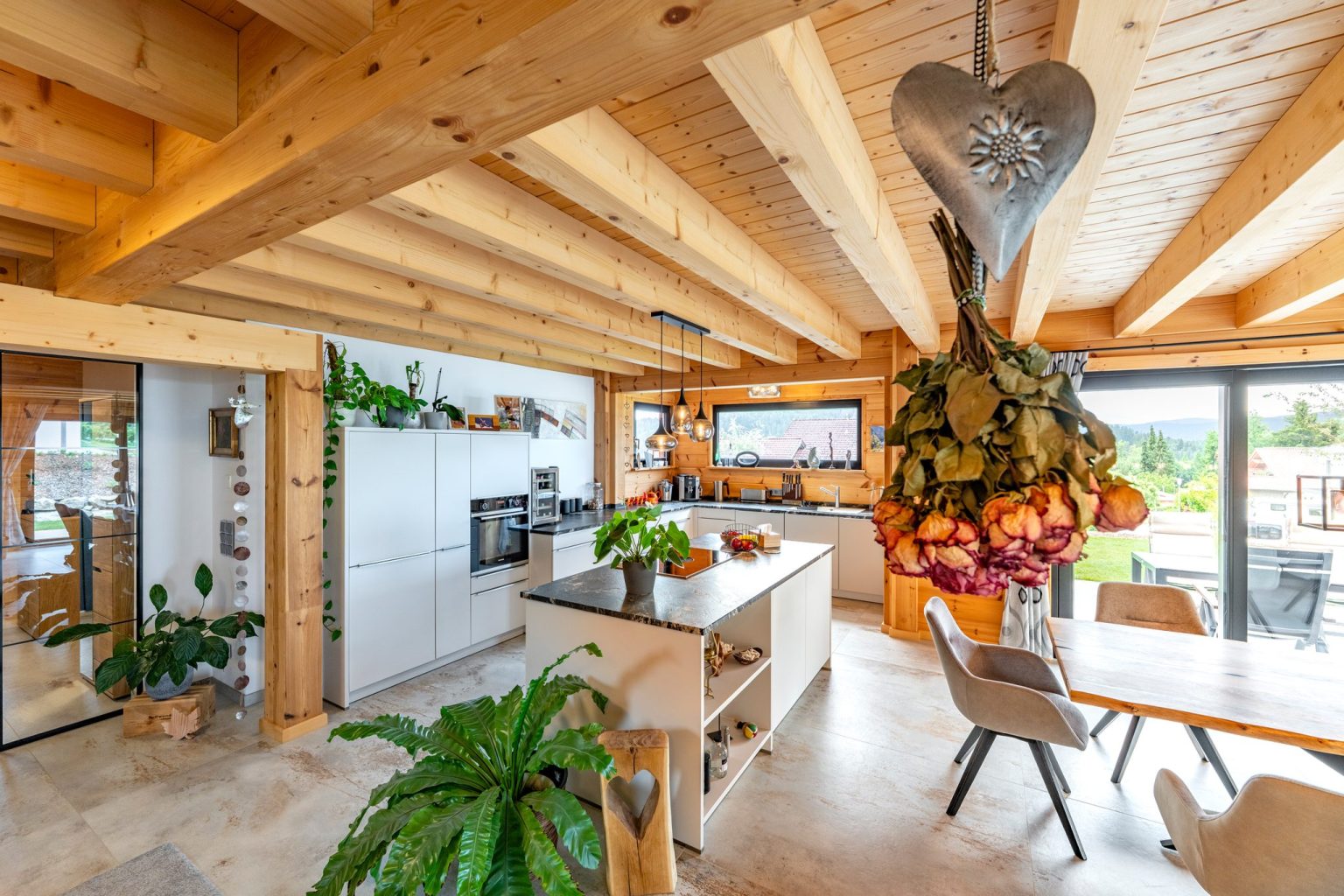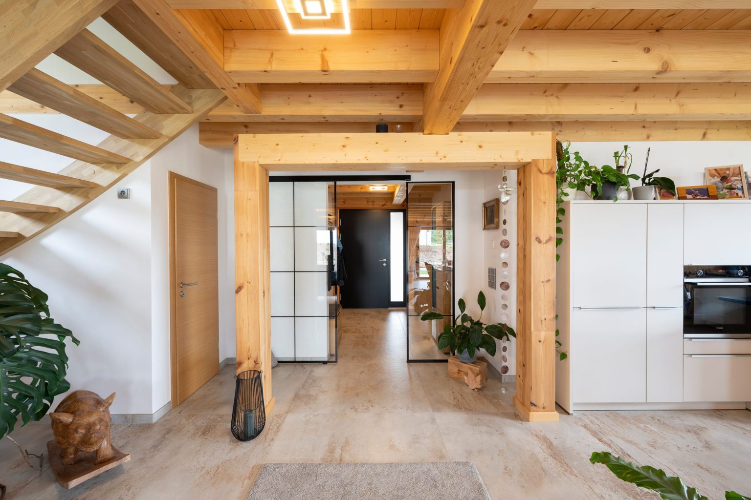 „Das Klima in unserem Holzhaus ist immer behaglich und sehr angenehm, egal zu welcher Jahreszeit.“, stellt der Hausherr fest. Die ungedämmten Blockwände aus echtem Polarkiefernholz isolieren sehr gut und lassen weder Hitze noch Kälte eindringen. Sie duften nicht nur dezent nach Kiefernwald, sondern fühlen sich stets handwarm an und haben einen ganz besonderen Effekt auf die Psyche: In einer Umgebung aus Holz fühlt man sich schon bei niedrigerer Zimmertemperatur wohlig warm und sogar entspannter als zwischen weißen Betonwänden. Es muss also weniger geheizt werden im Winter. Außerdem ist das Bauholz aller Fullwood Wohnblockhäuser chemisch unbehandelt und somit jedes Holzhaus ausdünstungsfrei, sofern man alle Ausbaumaterialien darauf abstimmt. Die Blockwände sind diffusionsoffen und gleichzeitig winddicht, sodass es sich im Holzhaus „Arberblick“ stets ohne Zugluft durchatmen lässt. „Ausschließlich Holz wollten wir nicht, das wäre uns zu viel gewesen. Deshalb verputzten wir alle Trennwände (leichte Ständerbauweise) glatt weiß und wählten sandfarbene Bodenfliesen im Erdgeschoss.“, erklärt Andrea Treml. So schufen sie und ihr Mann ein helles, ruhiges Zuhause, das Dank bodentiefer Fenster mit natürlichem Licht durchflutet ist. Äußerlich kommt Holzhaus „Arberblick“ hingegen dunkler und gesetzter daher mit seinem warmen, mittelbraunen Außenanstrich, den schwarzen Fenstern und den anthrazitfarbenen Dachziegeln. Umso überraschter ist man, wenn man das helle, offen gestaltete Innere des Holzhauses betritt.