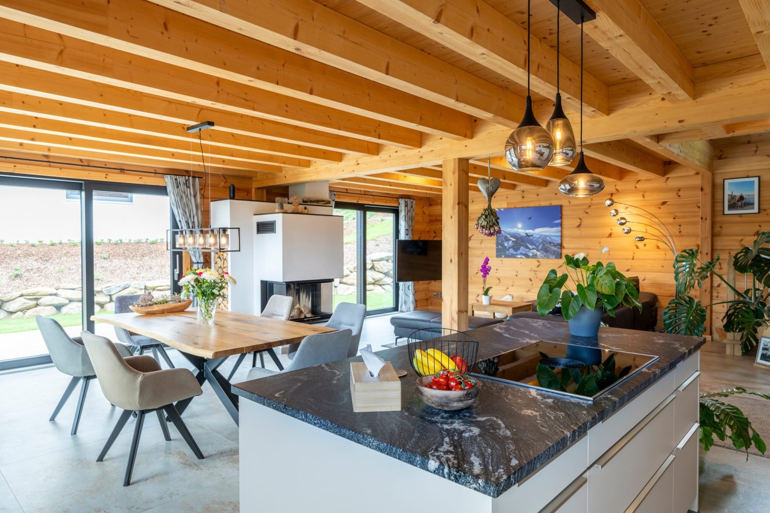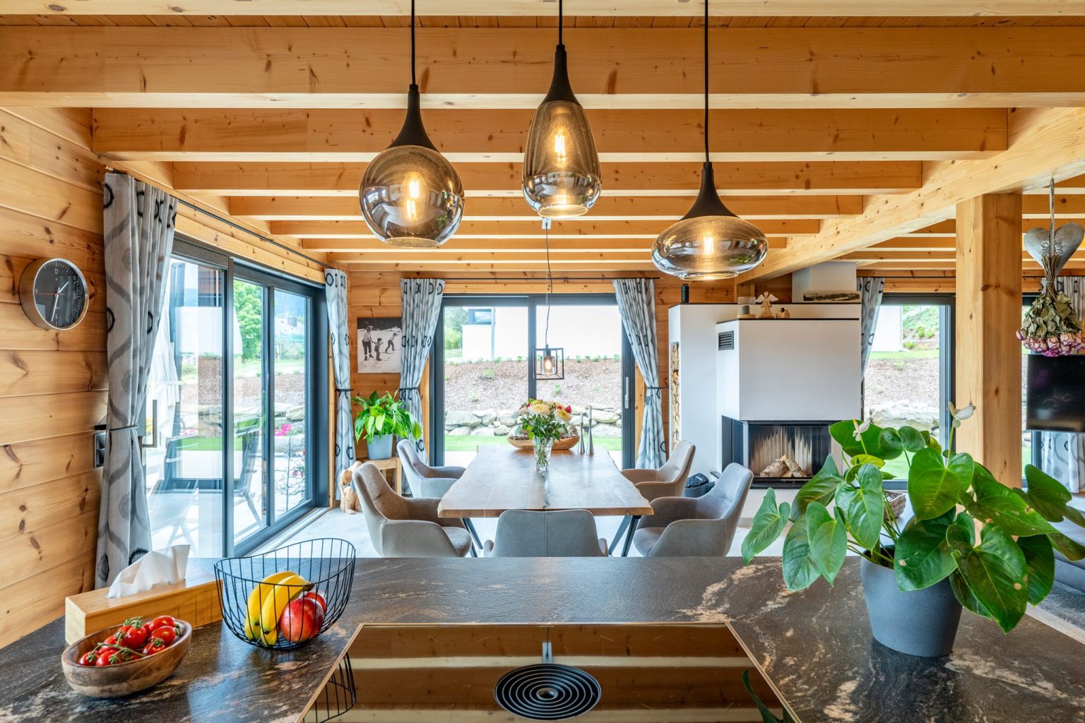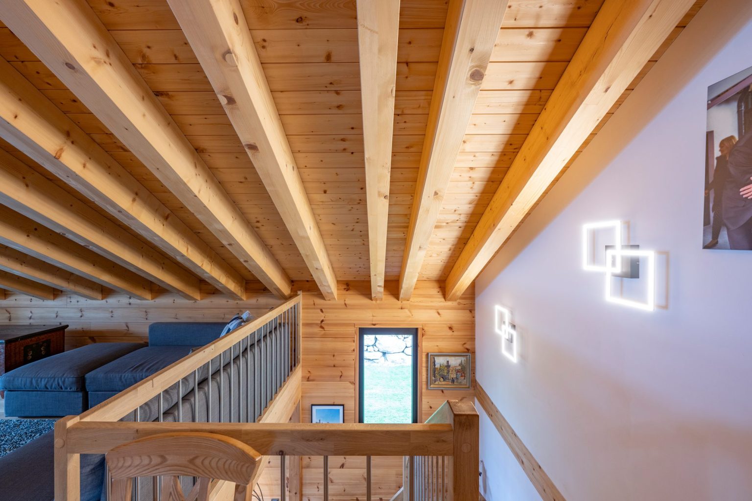 „Unser Holzhaus haben wir in Richtmeistermontage gebaut. Innerhalb von 14 Tagen montierte der Richtmeister von Fullwood zusammen mit zwei Helfern die fertig angelieferten Wand-, Bau- und Dachstuhlelemente, inklusive Fenster. Danach kam ein örtlicher Dachdecker. Ich half die ganze Zeit kräftig beim Hausbau mit.“, berichtet der Hausherr stolz. „Es war ein tolles Erlebnis den Hausbau zu verfolgen! Wie die großen Wände am Kran durch die Luft flogen. Das hatte was von Lego.“, meint Andrea. Für den Innenausbau wollten die Hauseigentümer gerne ortsansässige Fachfirmen engagieren, was mit Fullwood problemlos möglich war. Den Außenanstrich erledigten sie sogar eigenhändig, genau wie das Einölen der Wände und Balkendecken im Hausinnern, was ein Nachdunkeln des hellen Kiefernholzes verhindert. „Die Statik verlangte einen Eisenträger in unserem offenen Wohnbereich im Erdgeschoss. Den haben wir mit Kiefernholz verkleidet, damit er ins Bild passt.“, so Václav. Holzhaus „Arberblick“ steht in einer schneereichen Gegend, weshalb das Dach größere Last aufnehmen können muss. Beheizt wird das Gebäude mit einer Fußbodenheizung, die per Luft-Wärmepumpe betrieben wird und einem modernen Kaminofen im Wohnbereich. „Die Bedienung der Wärmepumpe erfolgt übers Handy, ansonsten wollten wir weder digitale Technik für die Haussteuerung noch künstliche Belüftungssysteme etc. installieren.“, sagt die Hausherrin.