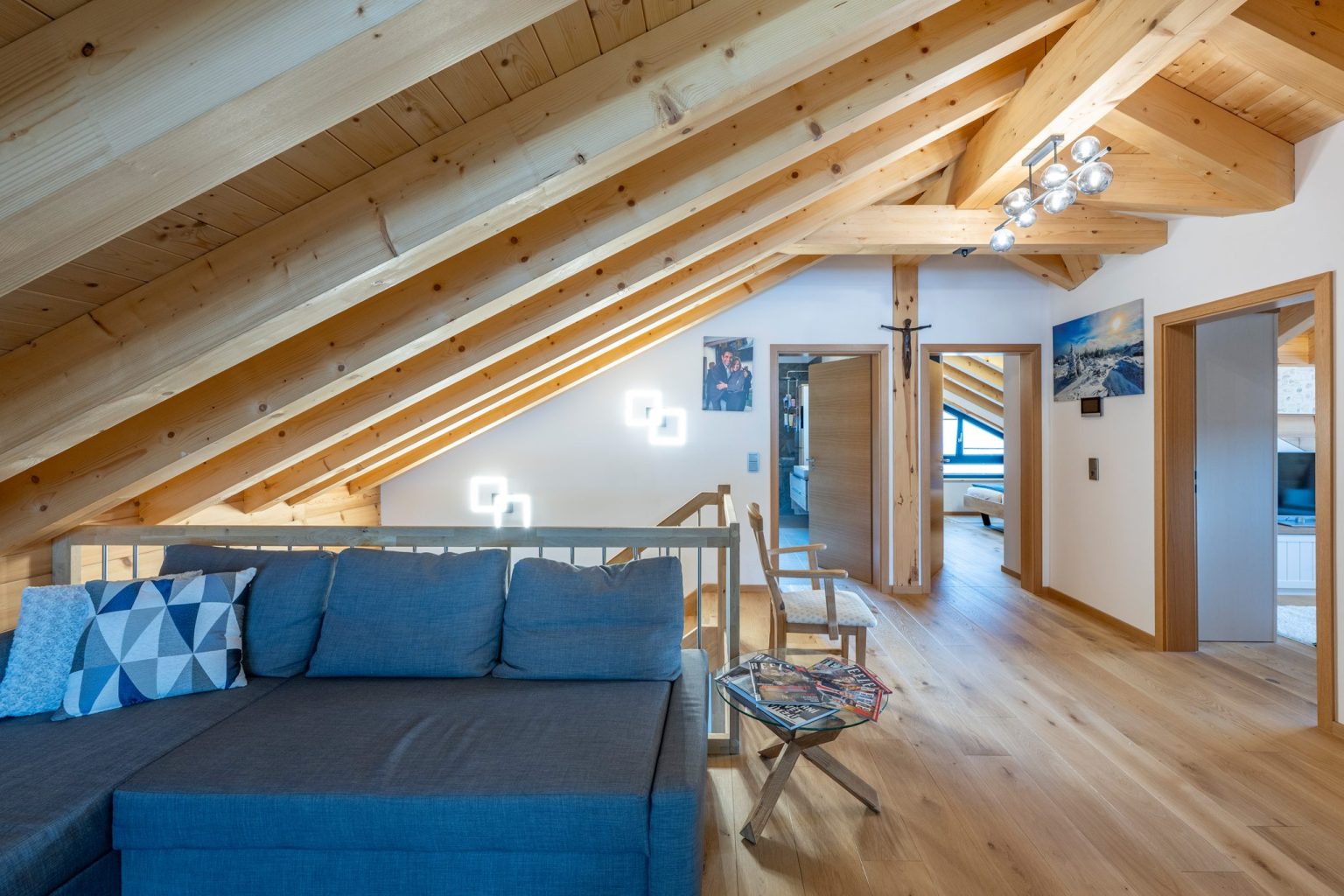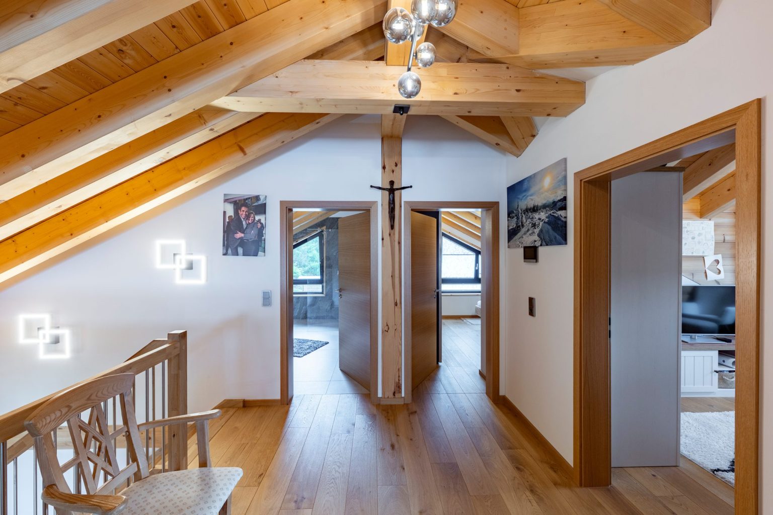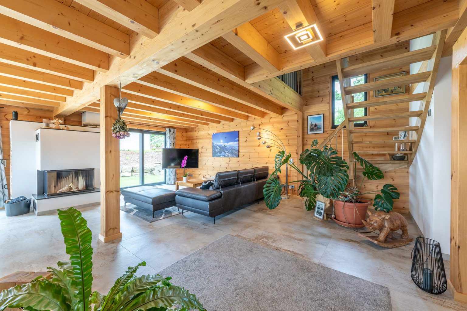 „Unser Holzhaus haben wir in Richtmeistermontage gebaut. Innerhalb von 14 Tagen montierte der Richtmeister von Fullwood zusammen mit zwei Helfern die fertig angelieferten Wand-, Bau- und Dachstuhlelemente, inklusive Fenster. Danach kam ein örtlicher Dachdecker. Ich half die ganze Zeit kräftig beim Hausbau mit.“, berichtet der Hausherr stolz. „Es war ein tolles Erlebnis den Hausbau zu verfolgen! Wie die großen Wände am Kran durch die Luft flogen. Das hatte was von Lego.“, meint Andrea. Für den Innenausbau wollten die Hauseigentümer gerne ortsansässige Fachfirmen engagieren, was mit Fullwood problemlos möglich war. Den Außenanstrich erledigten sie sogar eigenhändig, genau wie das Einölen der Wände und Balkendecken im Hausinnern, was ein Nachdunkeln des hellen Kiefernholzes verhindert. „Die Statik verlangte einen Eisenträger in unserem offenen Wohnbereich im Erdgeschoss. Den haben wir mit Kiefernholz verkleidet, damit er ins Bild passt.“, so Václav. Holzhaus „Arberblick“ steht in einer schneereichen Gegend, weshalb das Dach größere Last aufnehmen können muss. Beheizt wird das Gebäude mit einer Fußbodenheizung, die per Luft-Wärmepumpe betrieben wird und einem modernen Kaminofen im Wohnbereich. „Die Bedienung der Wärmepumpe erfolgt übers Handy, ansonsten wollten wir weder digitale Technik für die Haussteuerung noch künstliche Belüftungssysteme etc. installieren.“, sagt die Hausherrin.