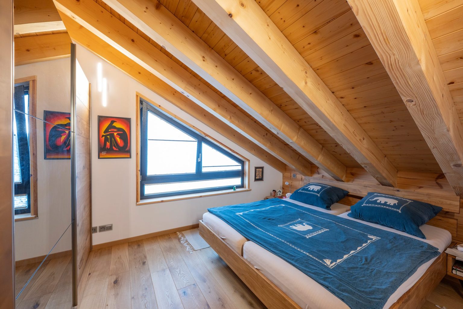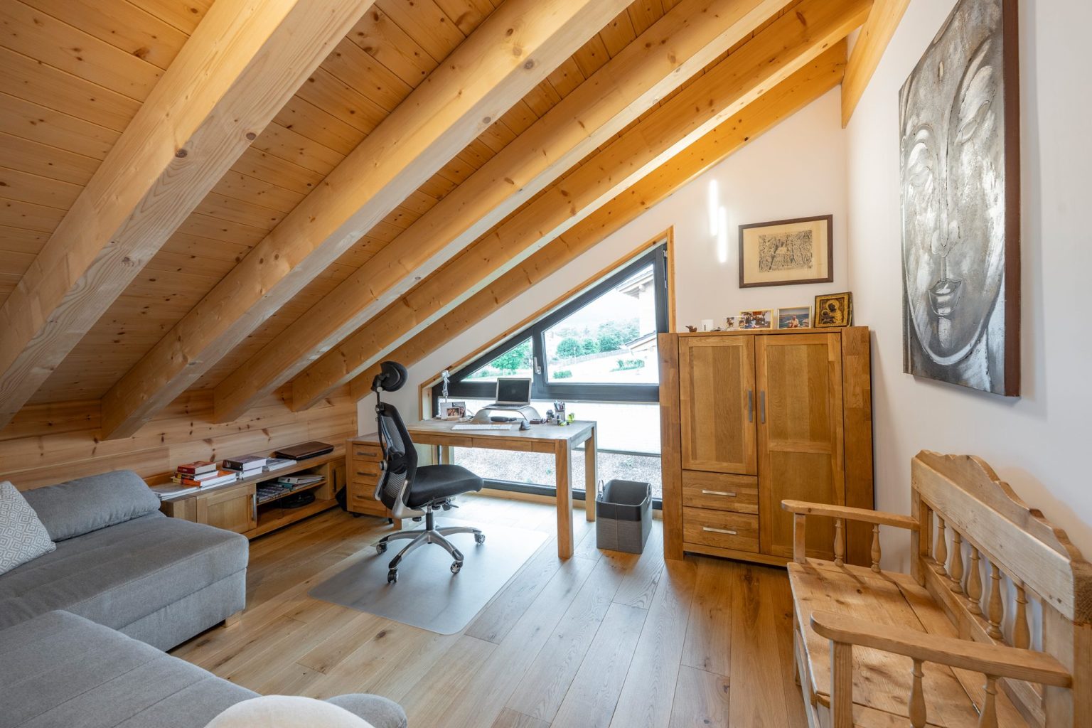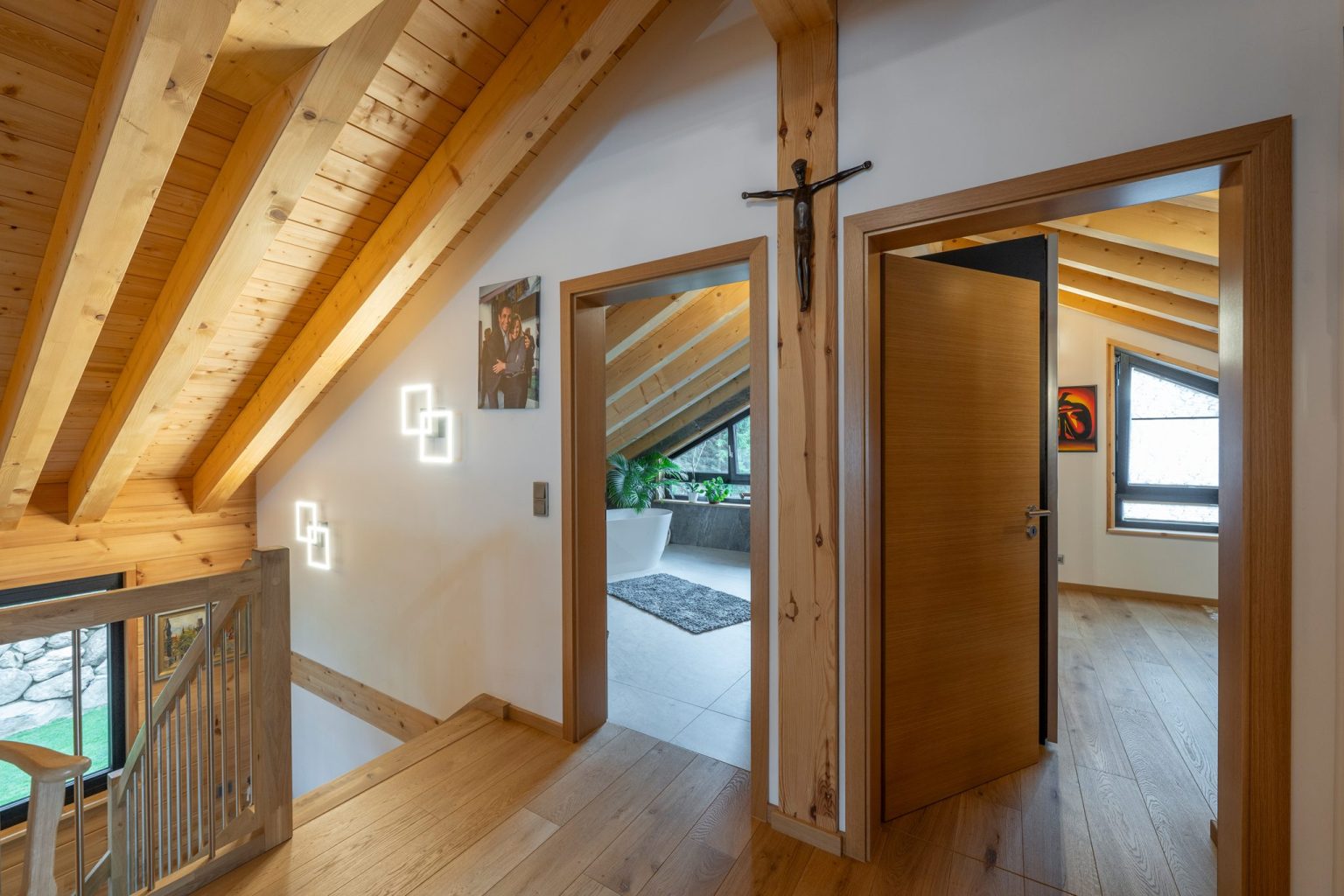 Auch das obere Geschoss ist teilweise offengehalten: Es besitzt nicht nur einen imposanten Sichtdachstuhl mit sichtbarer, langer Firstpfette, sondern auch eine offene Galerie mit Flur und großem Lesebereich. Das Schlafzimmer, das Kinderzimmer, das Gästezimmer/Büro und das großzügige Badezimmer sind selbstverständlich separat untergebracht. Dank der großen, bodentiefen Fenster in allen Räumen wird das Dachgeschoss genauso reichlich mit Tageslicht verwöhnt, wie das Erdgeschoss.