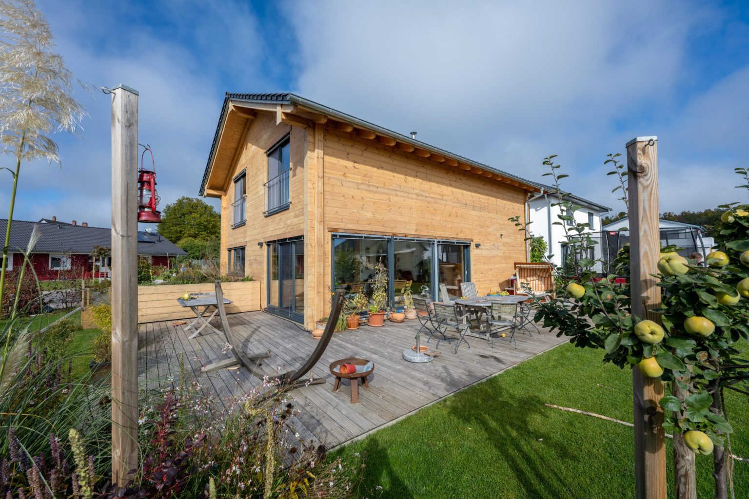 Nachdem die konkrete Holzhaus Planung nach den individuellen Wünschen von Sylvia und Jens Knölke abgeschlossen und der Bauantrag genehmigt war, konnte die Fertigung der Wandelemente im Werk beginnen und die Hausmontage pünktlich am vereinbarten Termin starten. „Wir haben nichts selber gemacht, sondern alles von den Fullwood-Profis bauen lassen. Im Anschluss haben dann lokale Fachhandwerksfirmen den Ausbau unseres Hauses durchgeführt. Um die Organisation haben wir uns dabei selbst gekümmert.“, erzählt Jens Knölke. Bereits nach gut 4 Tagen war der Rohbau inklusive Dachstuhl fertig, dann begannen die Dachdecker ihre Arbeit und Fenster und Türen wurden eingebaut. Da der Neubau nur 300m von ihrer alten Wohnung entfernt war, verfolgten die Knölkes täglich gespannt den Baufortschritt. Nennenswerte Probleme gab es keine, im Gegenteil: „Wir würden jederzeit wieder ein Holzhaus mit Fullwood bauen! Wir fühlen uns seit dem Einzug sehr wohl hier und das Raumklima ist überragend!“, so der Hausherr.