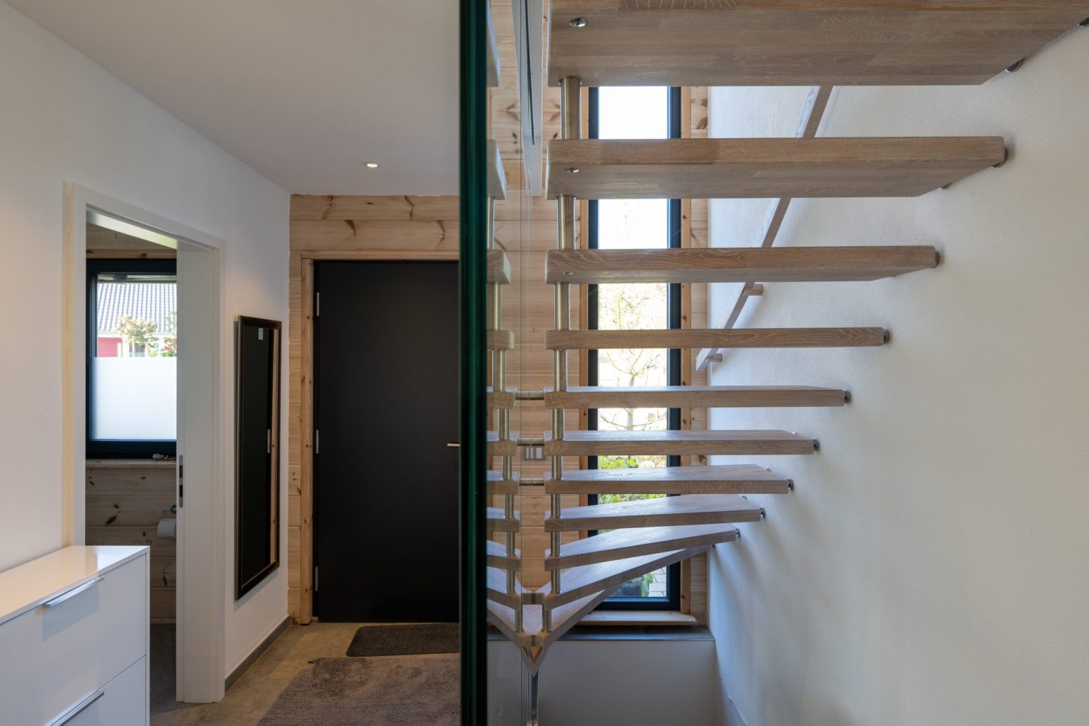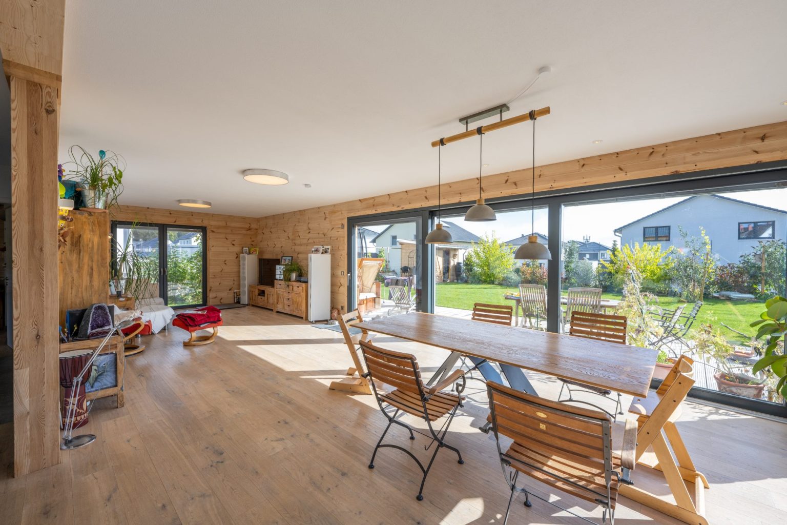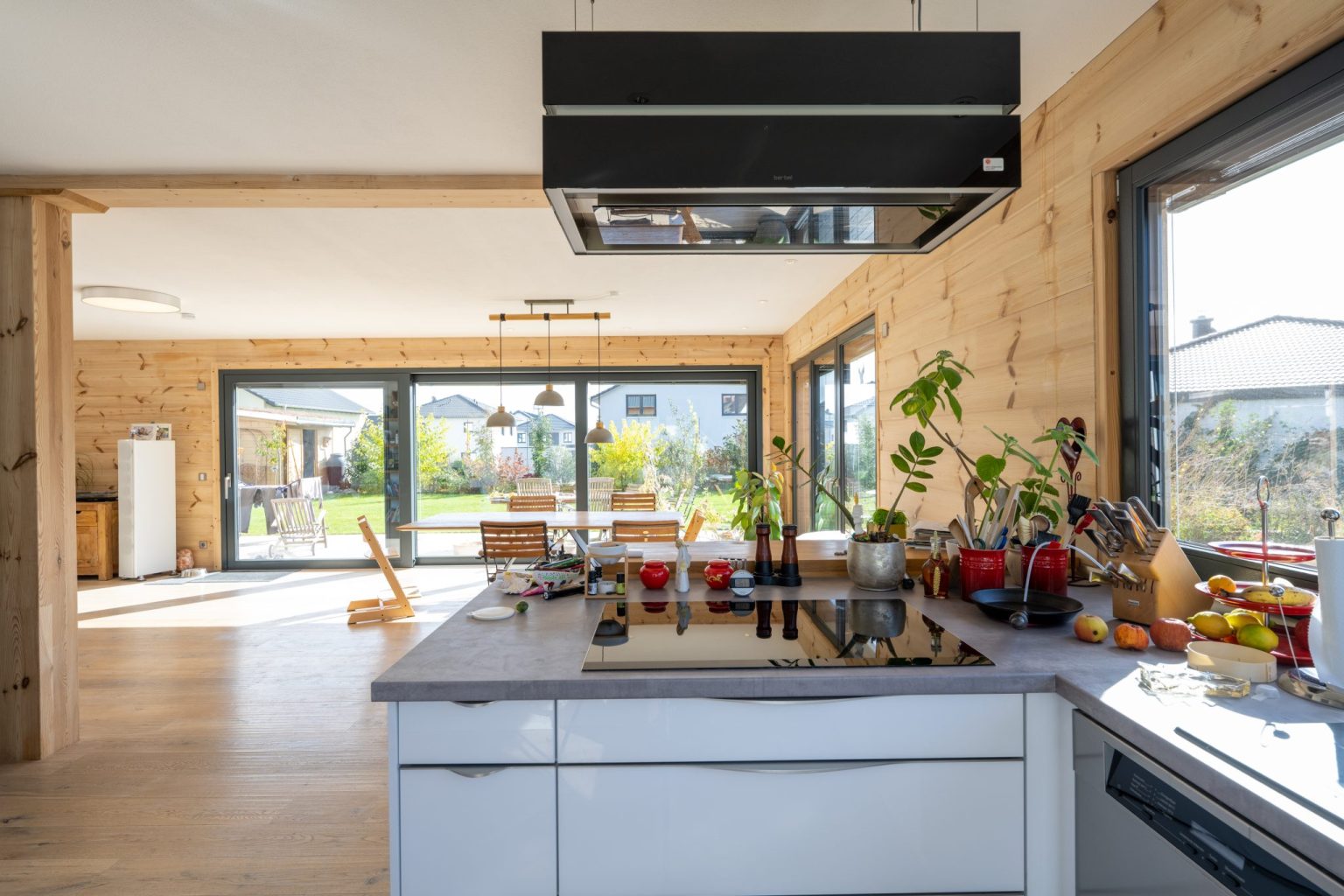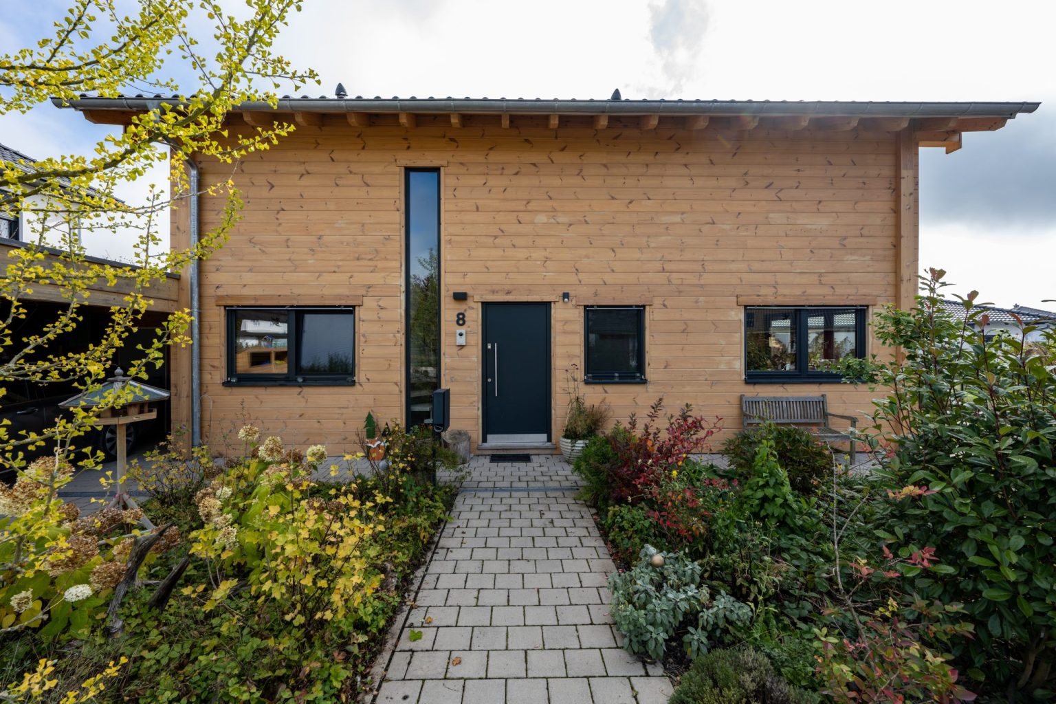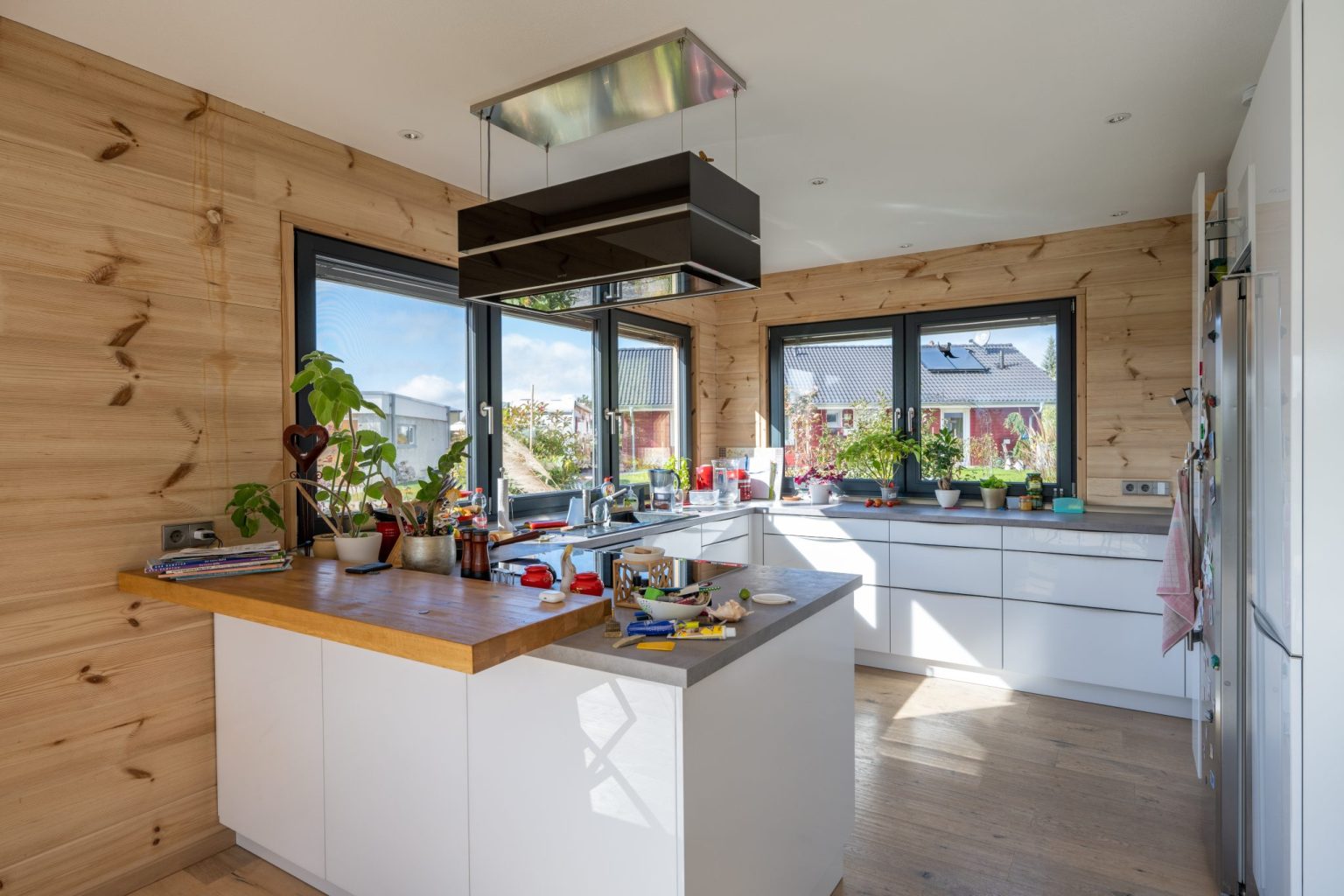 Der Eingang von Holzhaus „auf der Heide“ befindet sich auf der nord-westlichen Traufseite. Man gelangt in einen länglichen Flur, der rechts zum Gäste-WC und in einen Abstellraum führt, nach der Geschosstreppe links in ein Arbeitszimmer und geradeaus in den offenen Wohnbereich. Dieser ist L-förmig, sodass die beinhaltete Küche zuerst nicht einsehbar ist, auch nicht von der Sofaecke aus. Zwischen Wohnzimmer und Küche befindet sich der Essbereich und von der Küche geht es noch in eine Speisekammer. Im Obergeschoss befinden sich neben den zwei Kinderzimmern noch ein Schlafzimmer, ein Badezimmer sowie eine Ankleide. Alle Räume reihen sich um den mittig gelegenen Flur. „Unsere Fußbodenheizung betreiben wir mittels einer Luft/Wasser-Wärmepumpe und ein Kaminofen mit Sichtfenster ist im Wohnbereich in Planung. Auch eine PV-Anlage werden wir noch installieren lassen, das lohnt sich besonders im Zusammenhang mit der Wärmepumpe. Gießwasser für den Garten sammeln wir in unserer Regenwasserzisterne.“, benennt der Hauseigentümer alle Punkte des gut durchdachten, sparsamen und umweltfreundlichen Energieprogramms. Alles in allem schlägt das komfortable Holzhaus wichtige Anforderungen an Energieeinsparen, Klimaschutz, Ökologie, Wohngesundheit und Altersvorsorge in Form von Wertstabilität mit einer Klappe. Besser geht nicht.