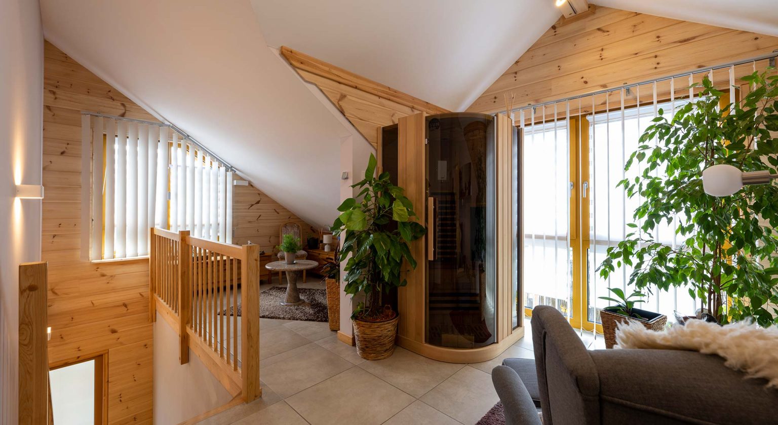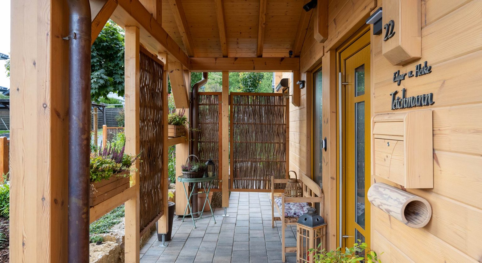 Edgar und Heike Teichmann wollten sich verkleinern und sind froh, ihre Wohnfläche von 300m² auf 159m² reduziert zu haben. „So klein, wie möglich aber so groß, wie nötig haben wir unseren Alterswohnsitz geplant. Ein ebenerdiger Bungalow war uns hingegen auch mit Blick auf's fortschreitende Alter nicht wichtig. Da verlegen wir lieber, falls irgendwann notwendig, das Schlafzimmer vom Dachgeschoss ins Gästezimmer im Erdgeschoss. Eine geräumige Gästedusche/-WC ist unten sowieso schon vorhanden.“ erklärt der Hausherr. Des Weiteren ist im Erdgeschoss ein offener Wohn/Ess/Koch-Bereich vorhanden. Alle Räume gehen von einer geschlossenen Diele ab. Von hier geht es auch über eine offene Massivholztreppe hinauf ins Dachgeschoss, wo sich eine großzügige Wohn-Galerie (mit eingebauter Infrarot-Kabine), ein Schlafzimmer und ein Wohn-Bad mit Wanne befinden. Schlafgemach und Badezimmer sind durch ein Ankleidezimmer miteinander verbunden. Komplettiert wird das Raumprogramm von einem Refugium und wird von einem Balkon an der gartenseitigen Giebelwand erweitert. Hinaus gelangt man vom Schlafzimmer und vom Refugium aus.