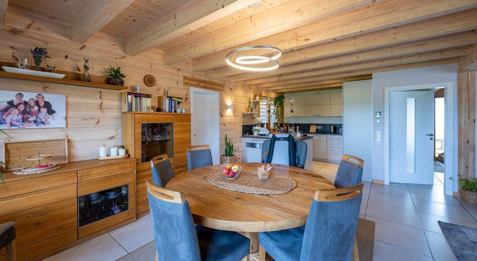 Beheizt wird Holzhaus „auf der Hörre“ im Winter via Fußbodenheizung mit Wärmepumpe, in den Übergangszeiten unterstützt von einem automatischen Pellet-Ofen mit Flammfenster für's Ambiente im offenen Wohnbereich. Eine 13 kWp PV-Anlage mit Hauskraftwerk inklusive 13 Kw Stromspeicher und Notstromversorgung sorgt, laut Hausherrn, für 65% autarke Energieversorgung. Dazu gehört auch eine Walbox für's eigene E-Auto.