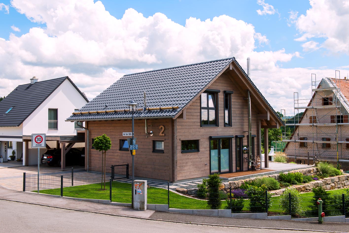 Ursprünglich träumten die Eigentümer von einem Rundstammhaus, nahmen aber schnell von diesem Gedanken Abstand, nachdem Ihnen klar wurde, wie groß und langwierig das Setzungsverhalten von Rundstammhäusern ist. Um die dadurch entstehende Arbeit (und Schmutz) zu vermeiden, schwenkten sie auf ein setzungsfreies Holzhaus mit glatten Wänden um. Nachdem der passende Holzhausspezialist gefunden ward, der setzungsfreie, und winddichte Vollholzwände in Fertigkonstruktion anbot, wurde Holzhaus „auf der Röth“ individuell nach Bauherrenwunsch geplant. Zusammen mit dem Berater der Hausfirma besprach man jedes Detail und pünktlich konnte der Baustart beginnen. Die Montage der 20 cm dicken Polarkiefernwände und den Großteil des Innenausbaus führte der erfahrene Haushersteller durch, dessen Monteure vor Ort manches perfekt nachbesserten, was nicht hundert Prozent passte, und sogar spontane Ideen der Bauherrschaft noch aufgriffen und umsetzten. Den Rest erledigten örtliche Fachfirmen, die der Hausherr selbst engagierte. Auch an die Zukunft wurde gedacht: Theoretisch kann bei Bedarf ein Aufzug ins Treppenhaus eingebaut werden, denn die Ü-Fünfziger ziehen ein anderthalb stöckiges Haus einem Bungalow vor. Um einen ebenen Außenbereich (Terrasse) zu haben, wurde das Grundstück aufgeschüttet, und 5 m Gefälle begradigt.