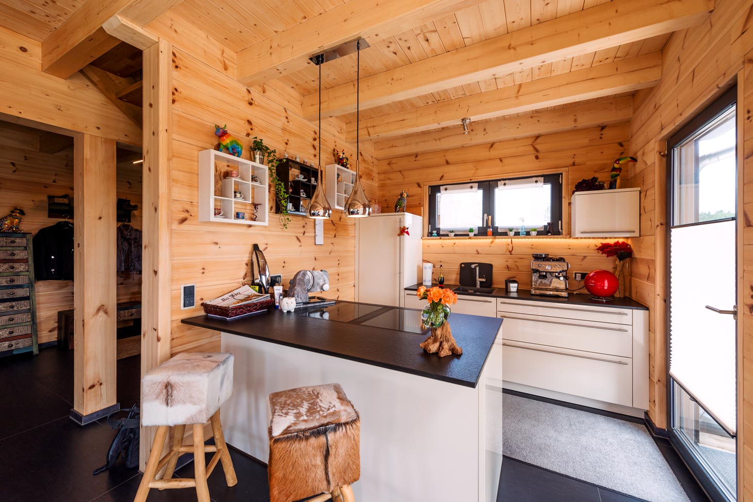 Die Holzterrasse ist bereits natürlich vergraut und passt perfekt zum Außenanstrich des Hauses. Das kleine Gartenhäuschen erhielt den gleichen Anstrich, so wirkt alles einheitlich und sehr geordnet. Das „Wohngefühl“ in ihrem Holzhaus beschreibt das Ehepaar als reines „Wohlgefühl“. Beide lieben die natürlichen, chemisch unbehandelten Holzwände und deren warme Ausstrahlung sowie handschmeichelnde Haptik. Es ist niemals feucht oder kalt im Holzhaus, und selbst Nichtraucher nehmen keinen Tabakgeruch wahr, obwohl im Haus geraucht wird. Die Küchengerüche ziehen zu 100 % durch eine Ansaugung mit Aktivkohlefilter und Fettfilter ab, stören also niemals die angenehme Raumluft im offenen Wohnbereich. Ein Plus an Behaglichkeit liefert ein heller Kaminofen im Wohnzimmer mit seiner angenehmen Strahlungswärme. In den Übergangszeiten ersetzt er komplett die mit Gas betriebene Fußbodenheizung und dient ansonsten als Schmuckelement mit Blick in lodernde Flammen.