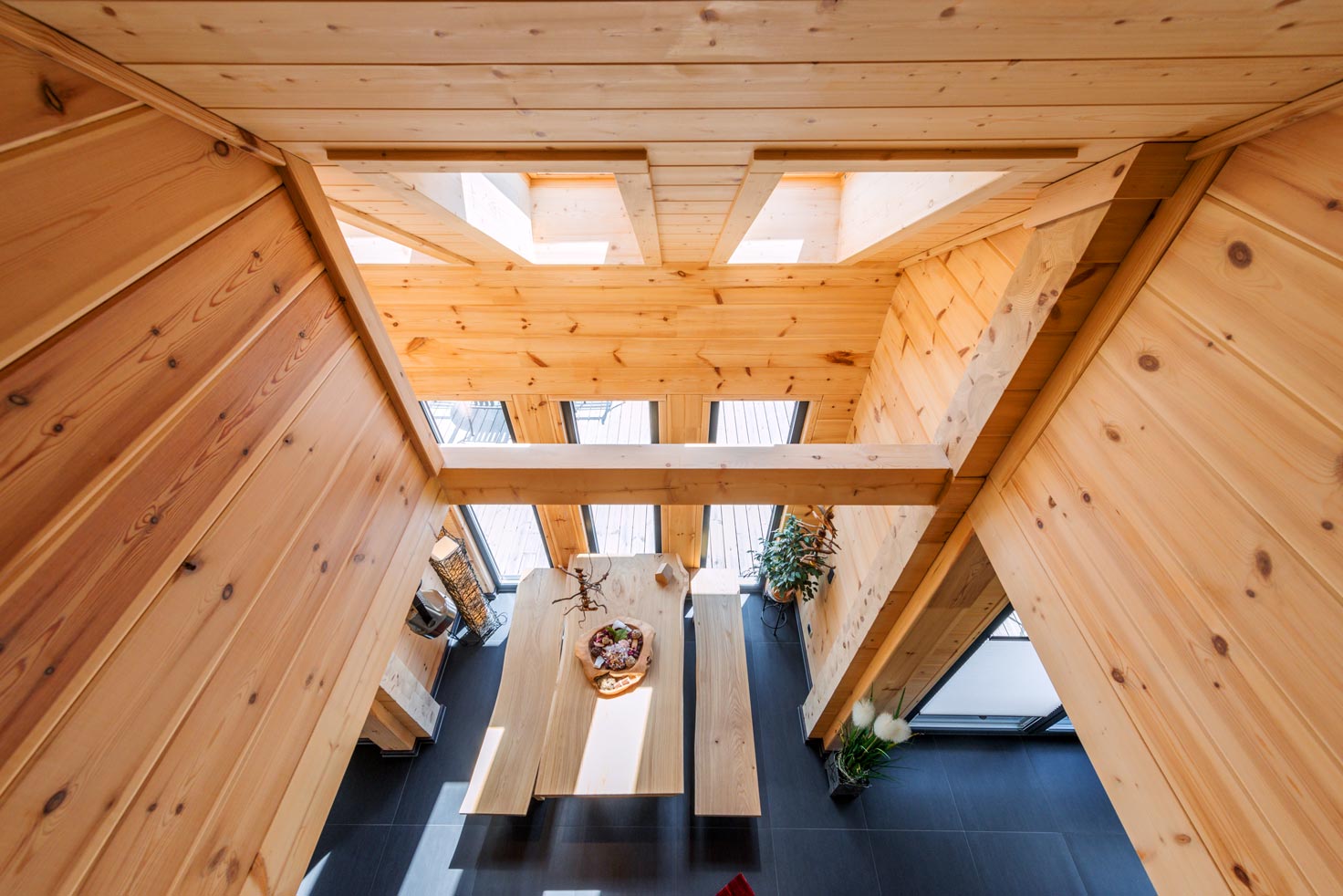 Da das Eigentümerpaar keinen Keller unter sein Holzhaus bauen wollte, gibt es im Erdgeschoss einen Hauswirtschaftsraum und einen Technikraum, der durch den Hauswirtschaftsraum erreichbar ist. Außerdem verfügt der an der Eingangsseite befindliche Carport eine große Abstellfläche, wo beispielsweise das Brennholz und die Mülltonnen elegant verstaut werden. Betritt man das Holzhaus durch die Eingangstür, gelangt man in eine Diele, die zum Wohnbereich hin offen ist. Dort fließen eine kleine Küche, ein Essbereich und ein gemütliches Wohnzimmer ineinander über und sind nur durch eine leichte L-Form und einen kleinen Rechteckerker optisch gegliedert. Der Esstisch steht im rundum verglasten Erker, darüber befindet sich der Luftraum bis hinauf zum Dachstuhl. Ein schönes Wohn-Bad findet ebenfalls Platz unter der Dachschräge und sogar ein Luftraum zwischen Erdgeschoss und offenem Firstbalken ist vorhanden, was schön ist, aber gleichzeitig ein weniger an Wohnfläche bedeutet. Reichlich natürliches Licht fällt hier herein, auch von oben. Überhaupt ist der Wohnbereich den ganzen Tag über sehr hell, da er fast rundum mit großen, bodentiefen Fenstern ausgestattet ist. Ein Gäste-WC komplettiert das Raumprogramm im Erdgeschoss.