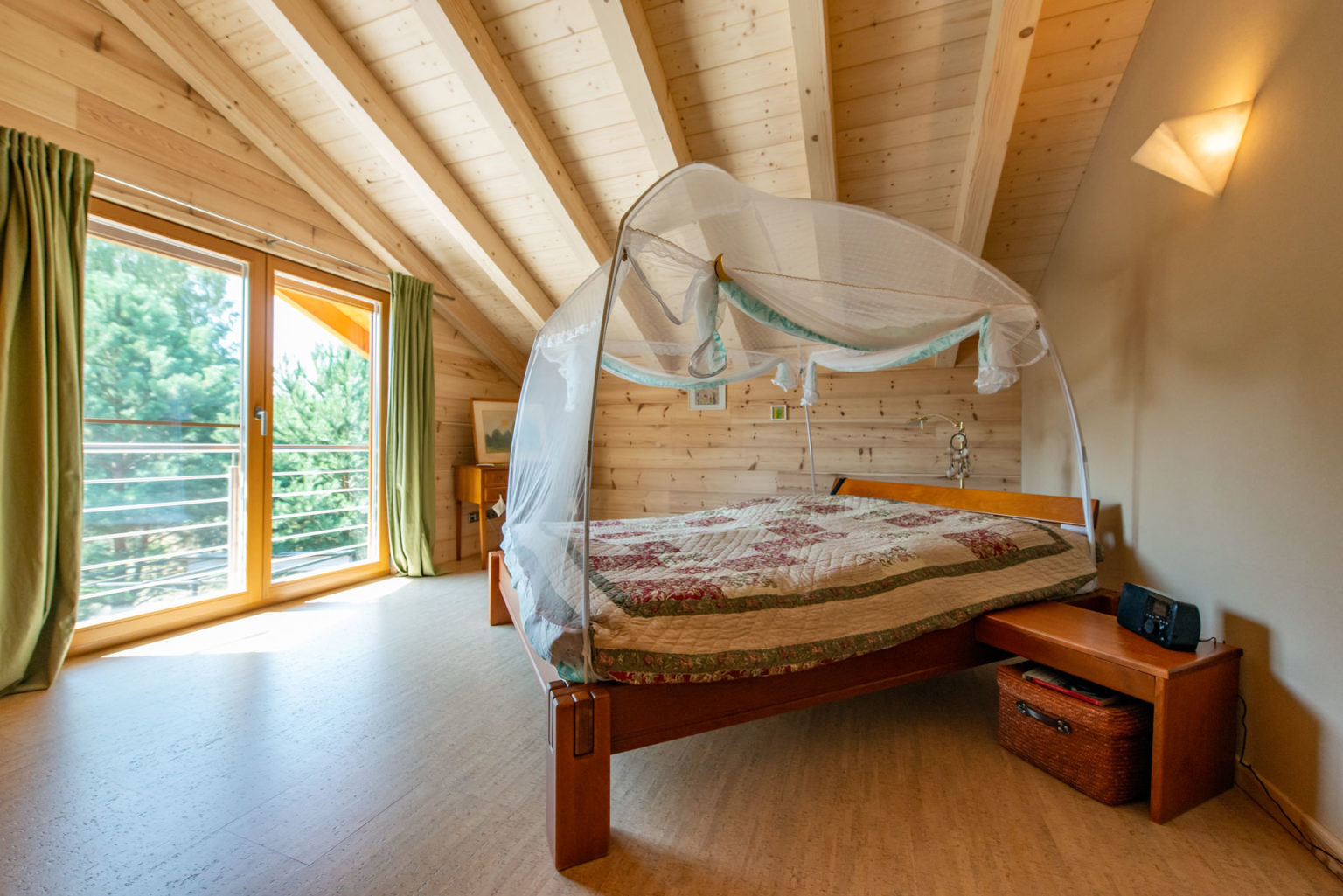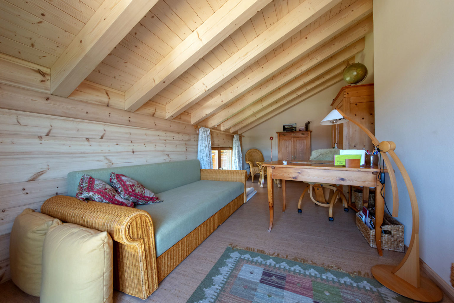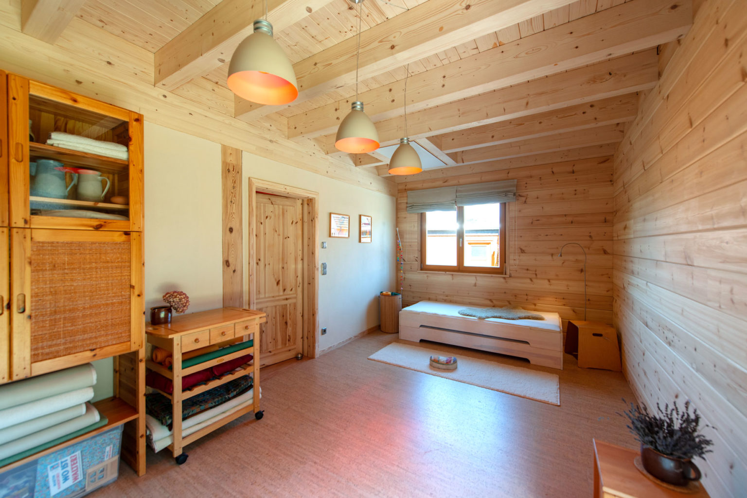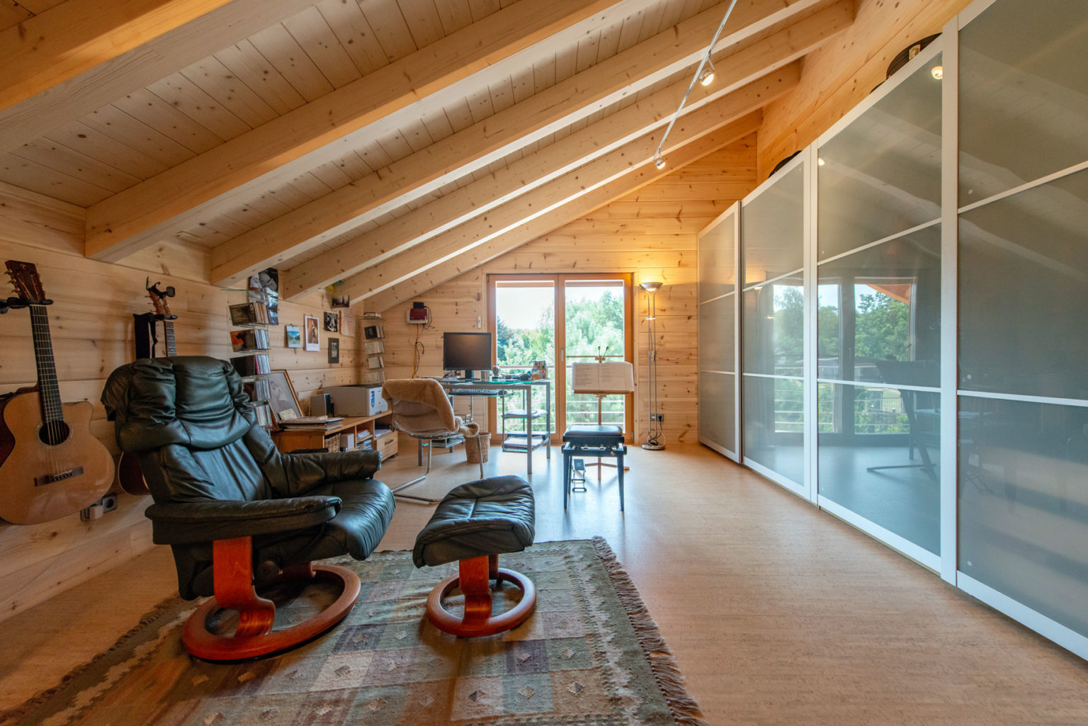 Im Dachgeschoss gelang man von einer mittig positionierten, quadratischen Diele in ein wohnliches Wellnessbad mit Ankleide en Suite, ein helles, luftiges Schlafzimmer und zwei Arbeitszimmer. Ein Abstellraum mit Waschmaschine komplettiert das Raumprogramm. „Im Erdgeschoss finden Gemeinschaft und Kommunikation statt, und im Dachgeschoss sind unsere ganz privaten Rückzugsorte.“, erklärt die Hauseigentümerin. Das Ehepaar fühlt sich sehr wohl in seinem Holzhaus und ist auch im Nachhinein rundum zufrieden mit Fullwood. Besonders auch für Musikbegeisterte ist Haus „auf der Zauche“ eine Bereicherung, da der Klang darin „trockener“ (ohne Hall) als beispielsweise in einem Steinhaus ist und den Verhältnissen in einem Tonstudio nahekommt.