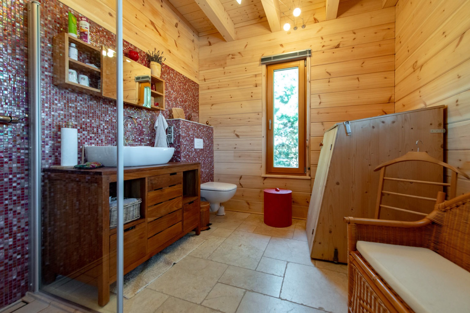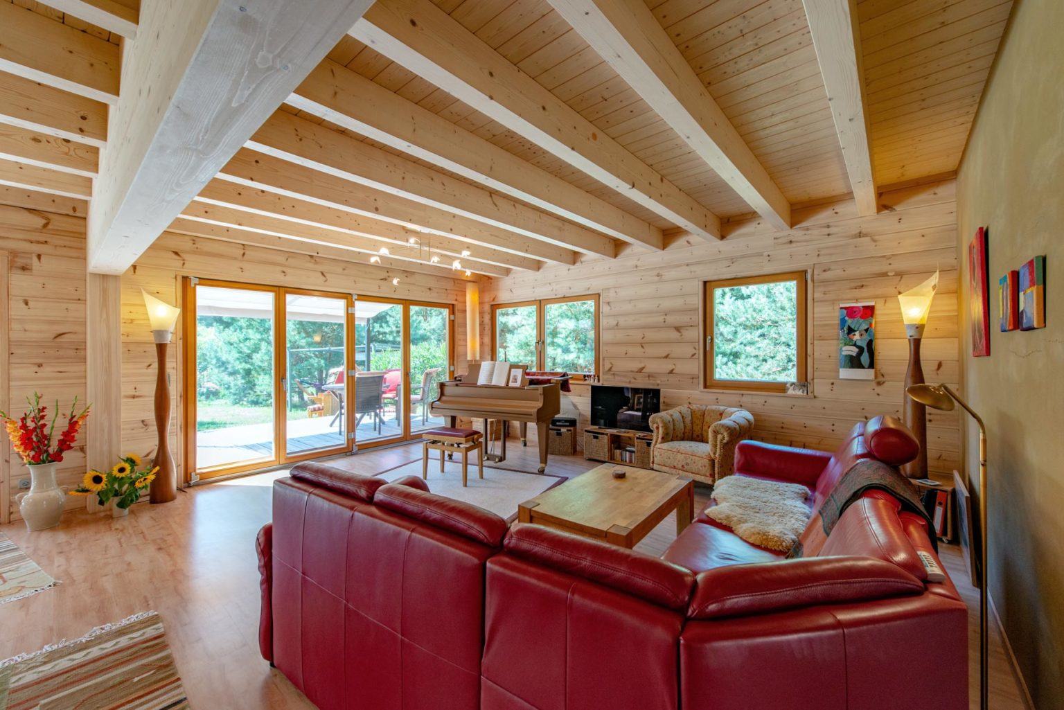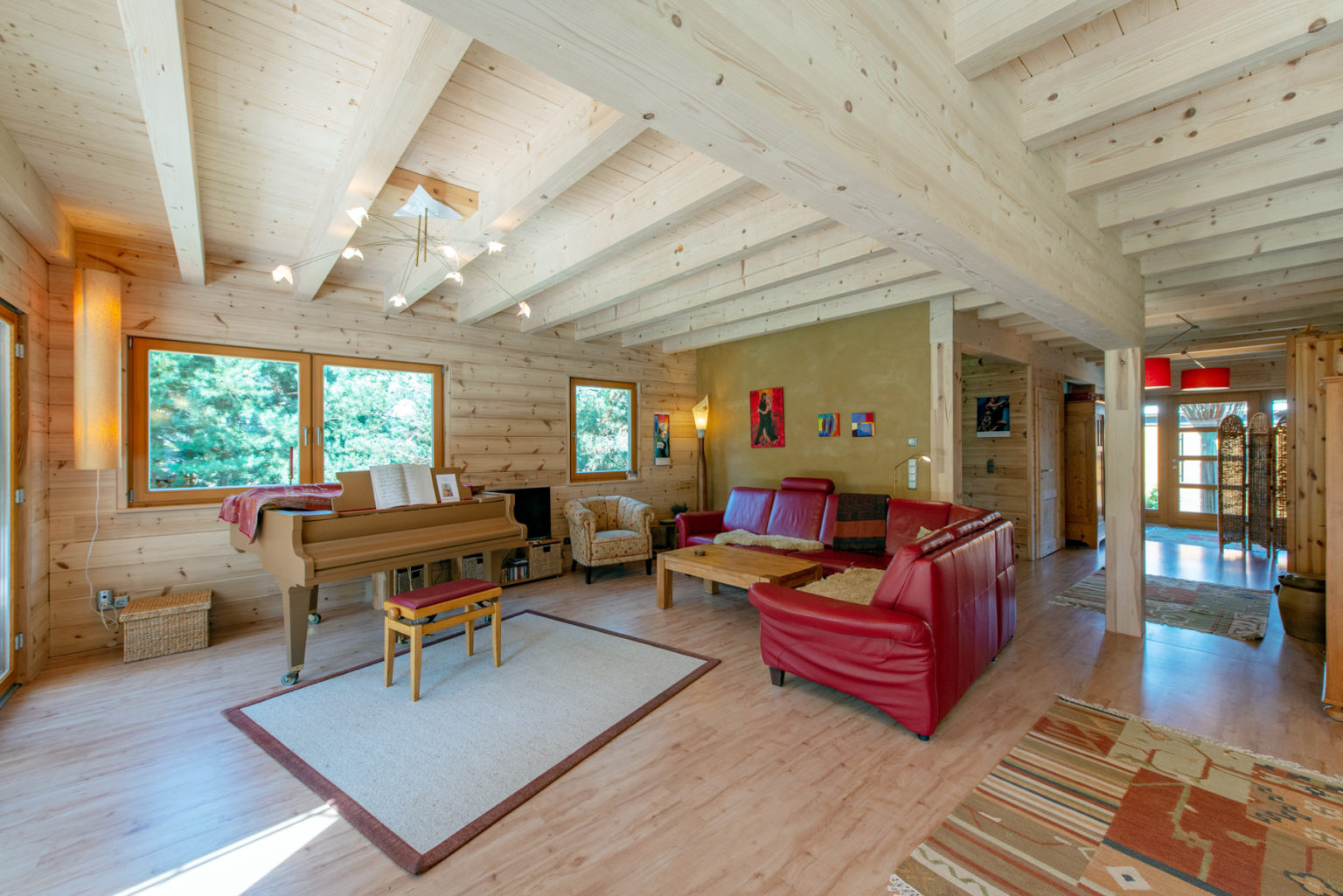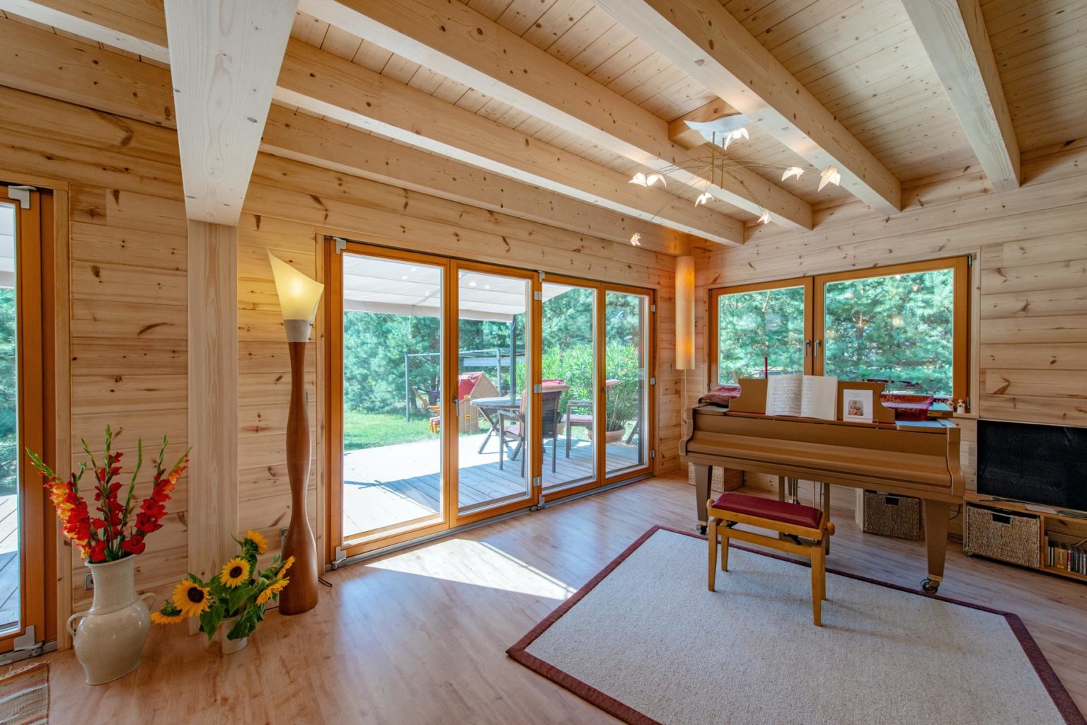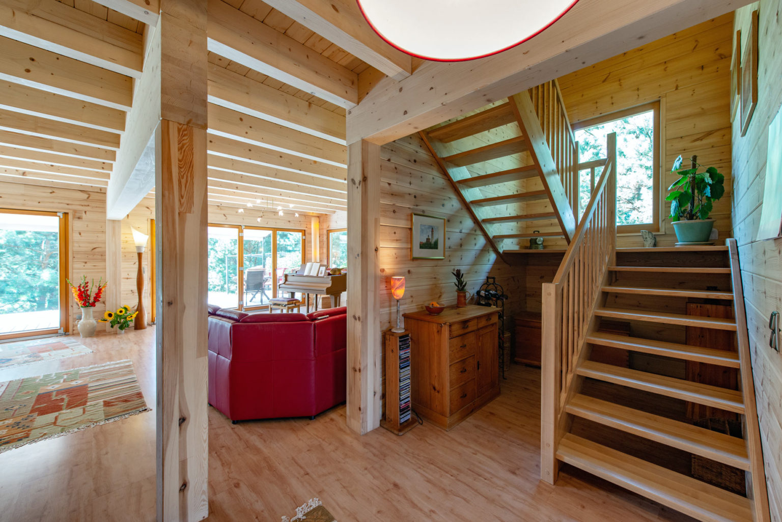 Das 13 x 9,35m messende Holzhaus besitzt weder Vorsprünge noch Erker oder Dachgauben, aber eine kleine Dachabschleppung an der südlichen Traufseite. Dort und an der westlichen Giebelseite befindet sich je eine große Terrasse aus Holz, die den Wohnbereich von drinnen nach draußen vergrößert. Man betritt das Gebäude an der östlichen Giebelseite und gelangt in eine sehr geräumige Diele, die zum Wohnbereich hin offen ist. Rechts geht es ins Gäste-Bad/WC und in den Hauswirtschaftsraum, während links eine Tür ins Yoga- und Reiki-Reich der Hausherrin führt. Bevor man den Wohnbereich erreicht, führt auf der rechten Dielenseite eine transparent wirkende Holztreppe hinauf ins Dachgeschoss. Im Wohnbereich gehen Küche, Esszimmer, Wohnzimmer und Musikzimmer ineinander über. „Neben den meisten Möbeln haben wir auch unseren Flügel aus der alten Wohnung mitgebracht. Ursprünglich war er schwarz, aber wir haben ihn passend zum neuen Haus eigens braun lackieren lassen.“, erzählt der Hausherr. Dank der bodentiefen Fensterflächen ist der weitläufige Wohnbereich sehr hell und bietet zudem genug Platz zum Tangotanzen, der gemeinsamen Passion des Eigentümerpaares.