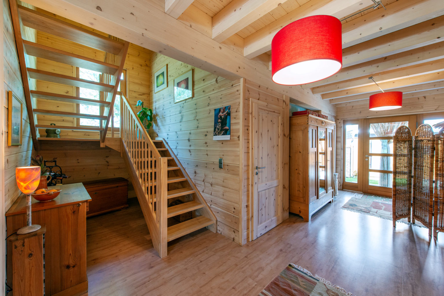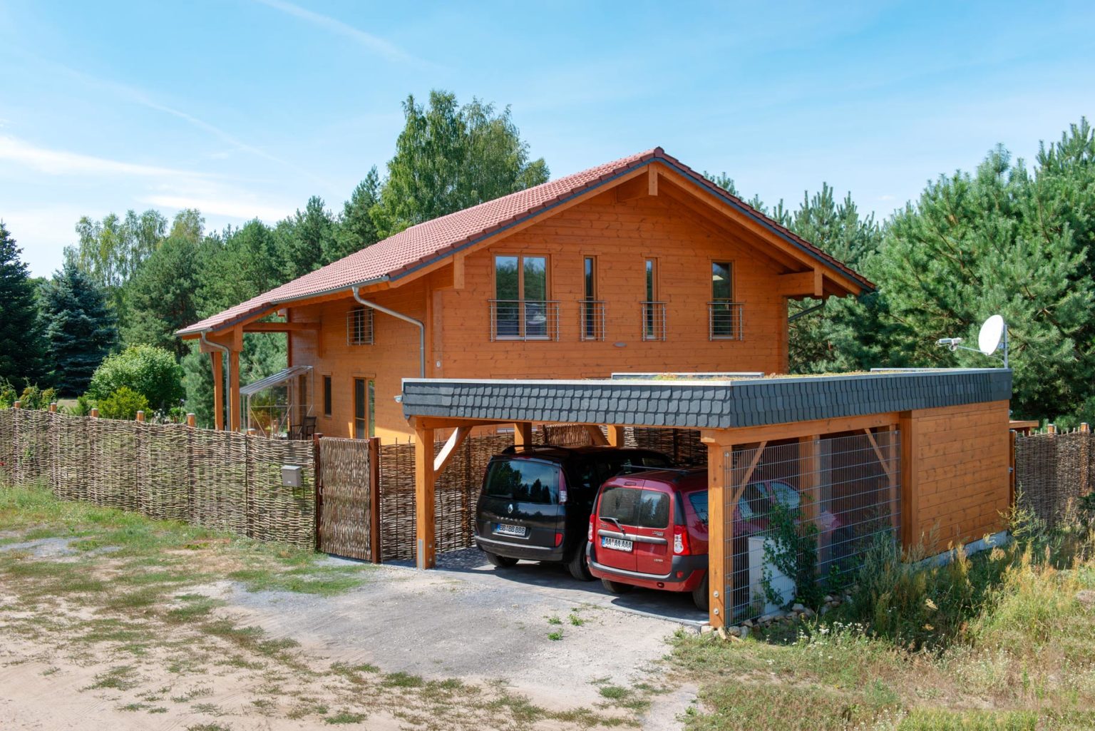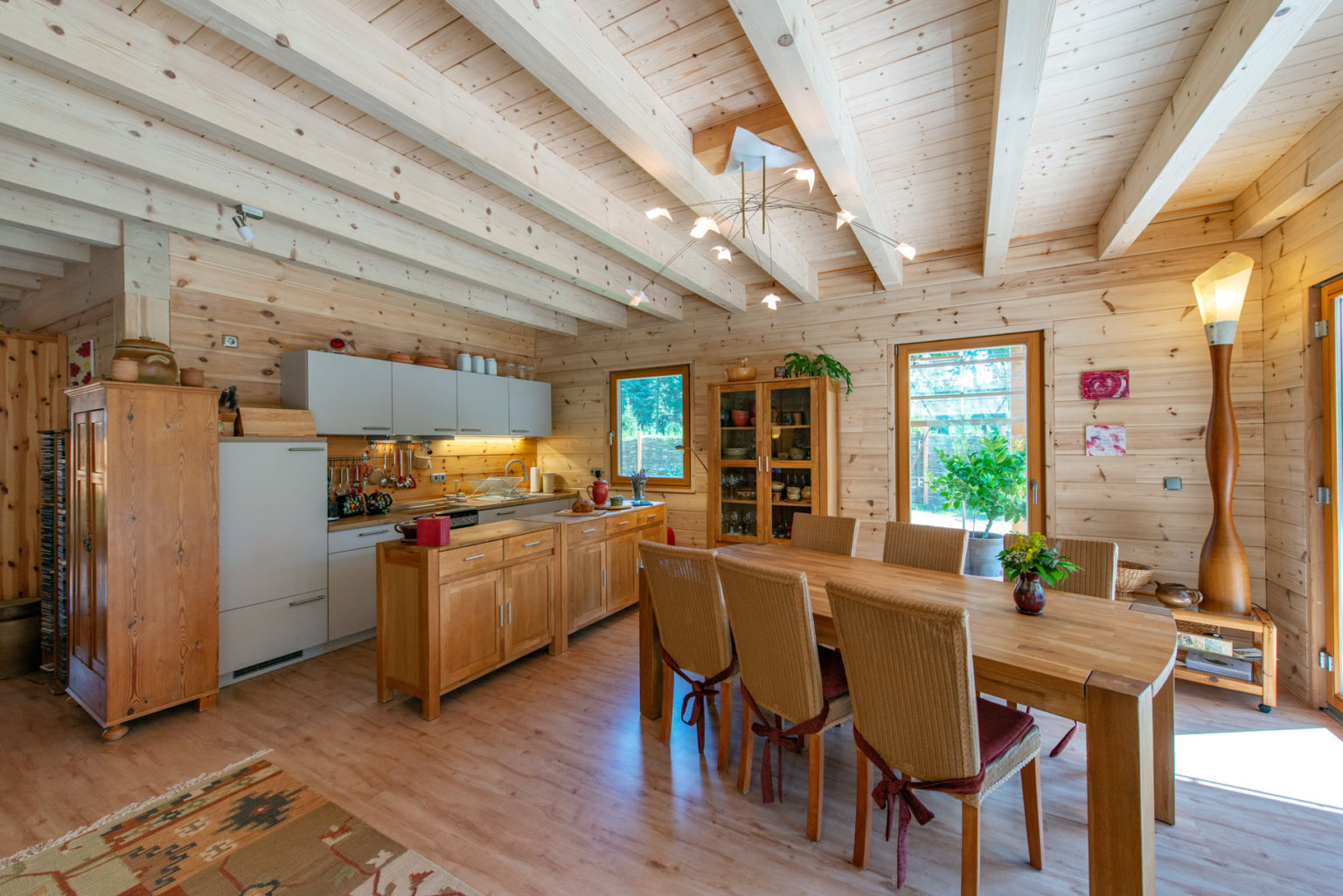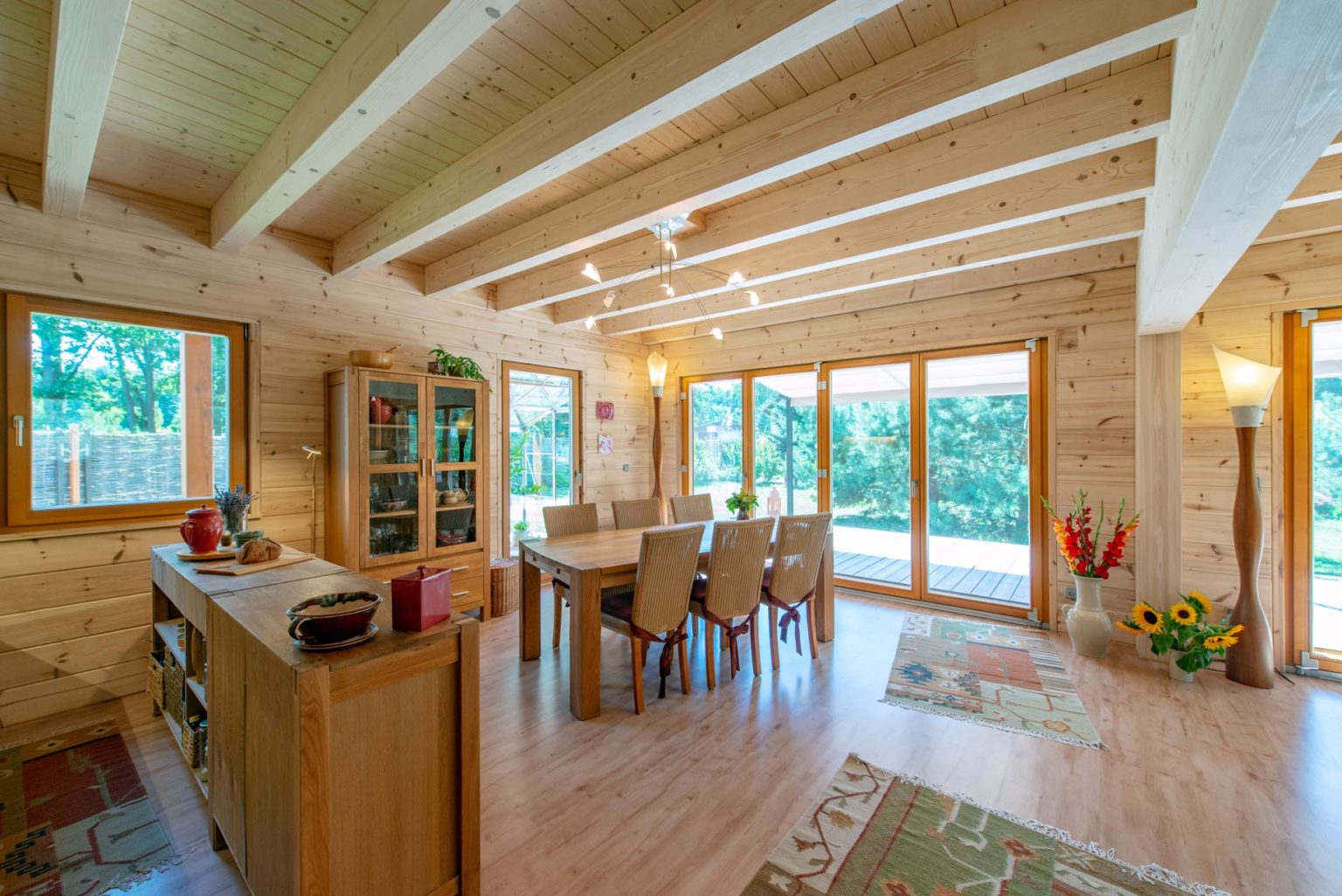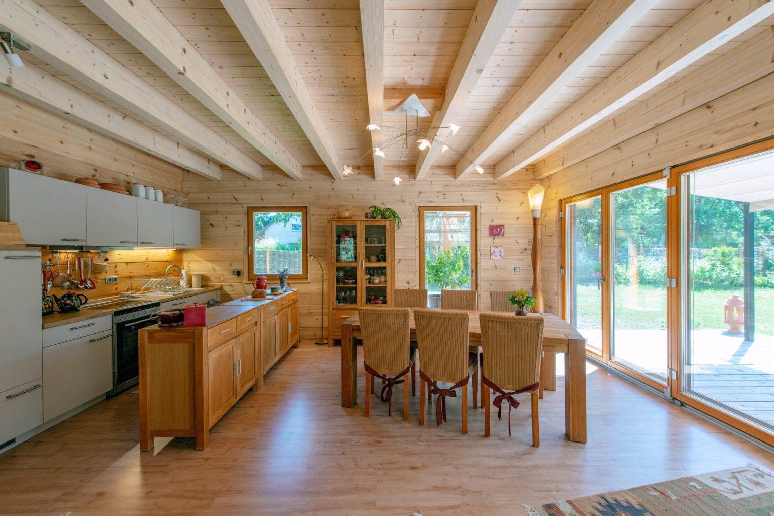 Das Eigentümerpaar entwarf und plante sein Holzhaus zusammen mit einem befreundeten Architekten und dem Fullwood-Berater ganz nach den eigenen Vorstellungen. „Für uns hat ein praktischer Wohnalltag Priorität.“, betont die Hausherrin. „Dazu gehören: ein barrierefreier Zugang; geringer Pflegeaufwand; Verzicht auf einen Keller zugunsten Abstell- und Hauswirtschaftsräumen; sowie einer Balkenlage mehr pro Geschoss, was einen höheren Kniestock und somit mehr Raum im Dachgeschoss bewirkt.“ Außerdem sind den Eigentümern von Holzhaus „auf der Zauche“ generell natürliche Materialien und Naturnähe wichtig. Deshalb kombinierten sie zu den tragenden Holzwänden („Kombiblockwand“) Trennwände (leichter Ständerbau) mit Lehm-Putz zur optimalen Feuchteregulierung, fußwarme Korkböden, nässeunempfindliche Natursteinböden (Bäder) und Fensterrahmen sowie Zimmertüren aus Naturholz. „Damit die Holzwände und Balkendecken innen nicht nachdunkeln, haben wir sie mit UV-Schutz lasiert.“, verrät der Hauseigentümer. Außen bekamen die Polarkiefernwände einen schönen, wie Honig in der Sonne leuchtenden Anstrich, der auch vor natürlicher Vergrauung schützt.