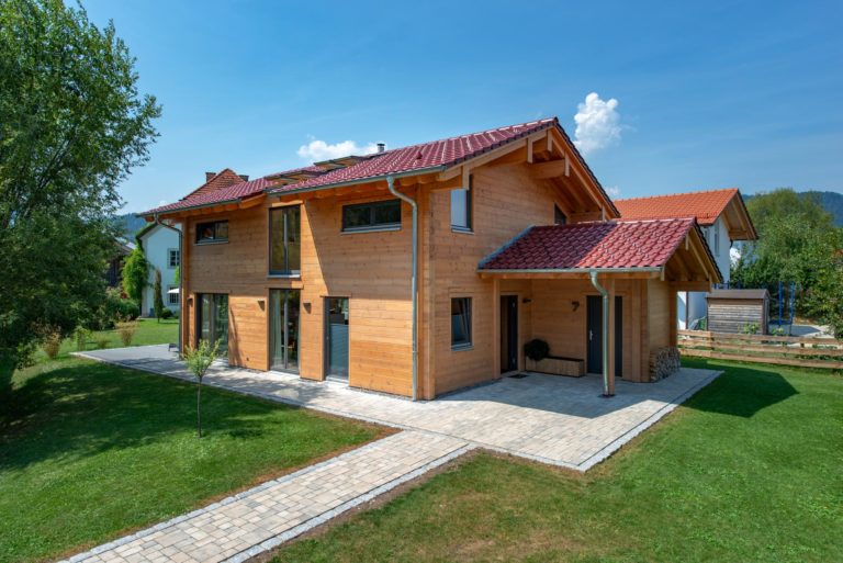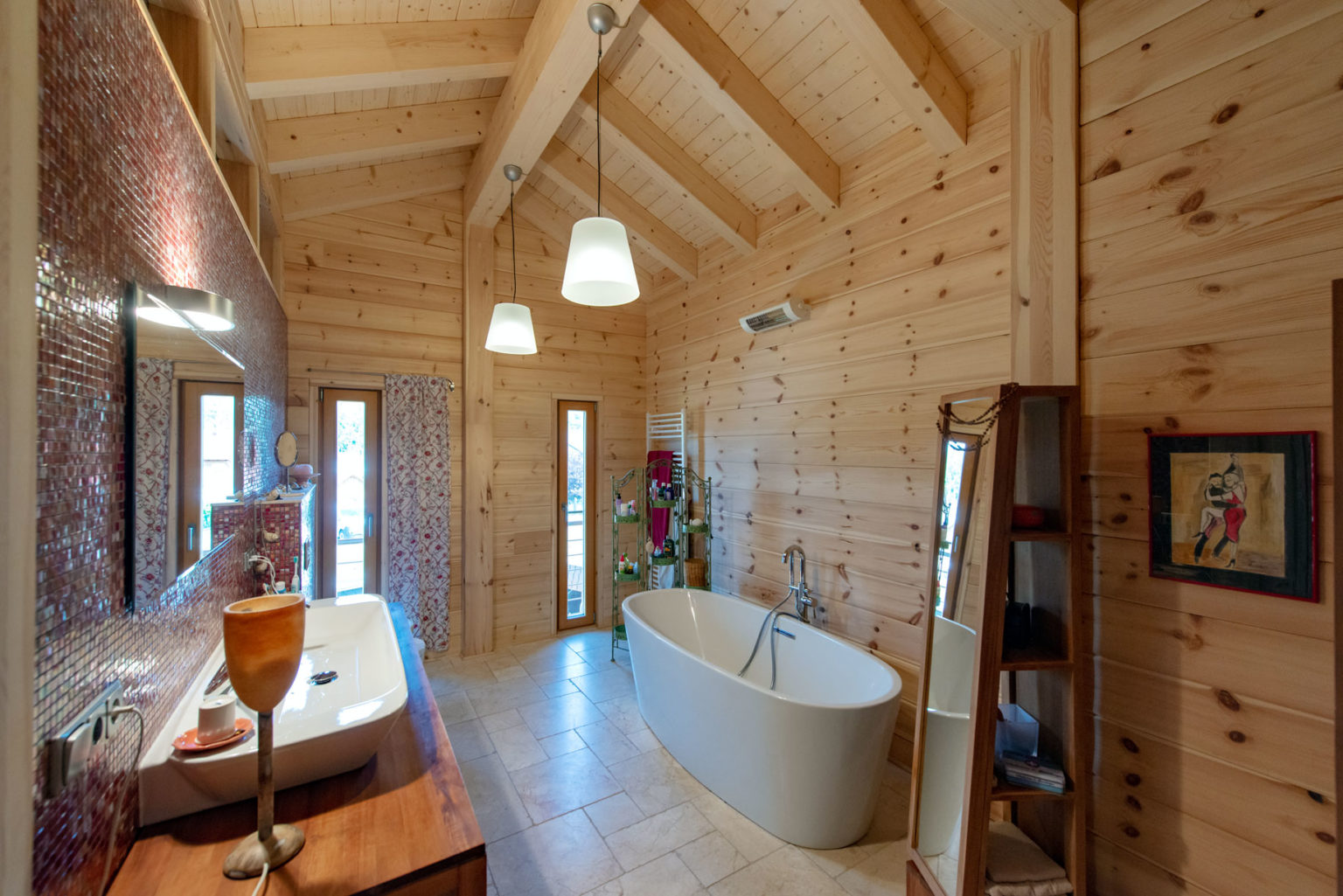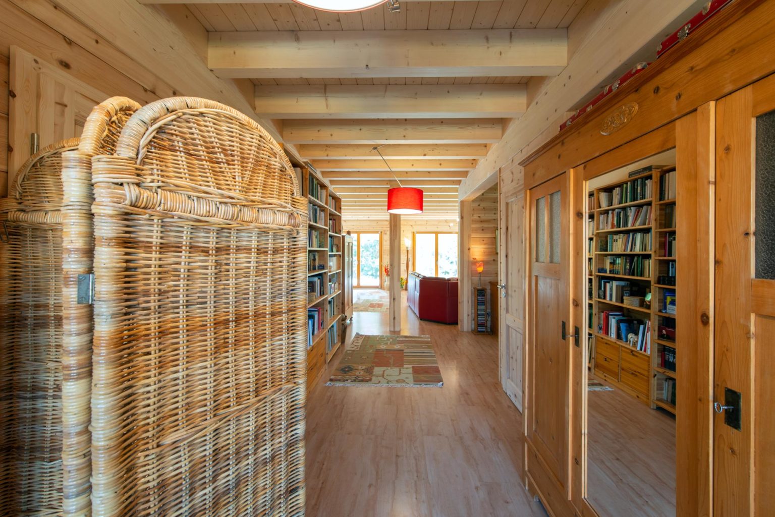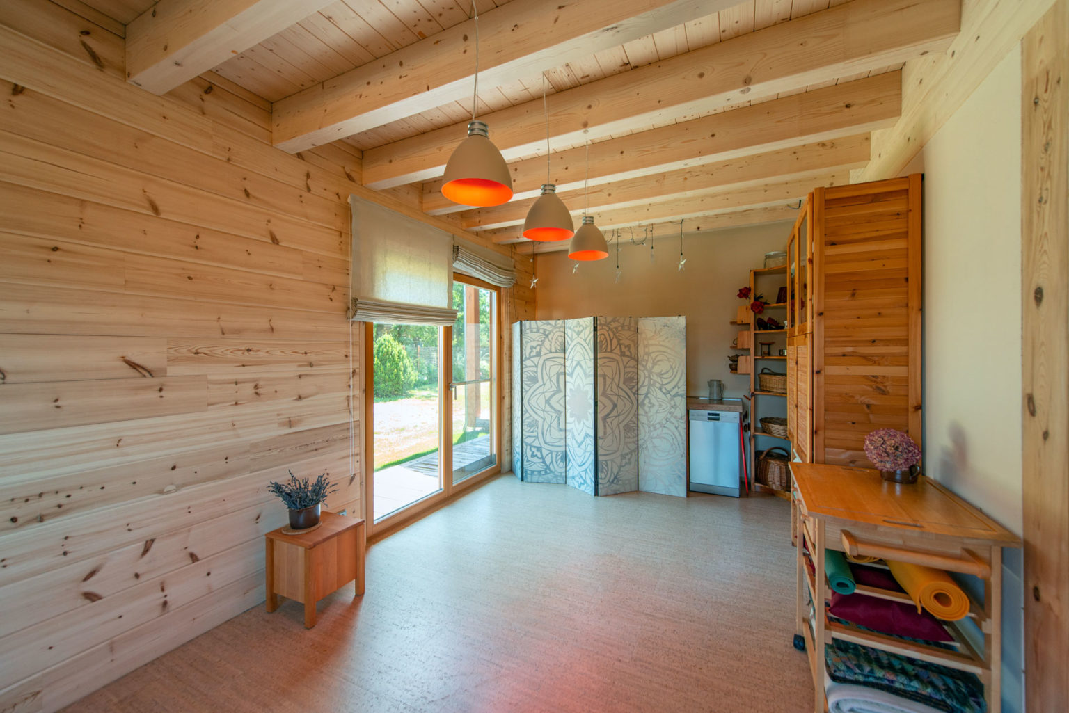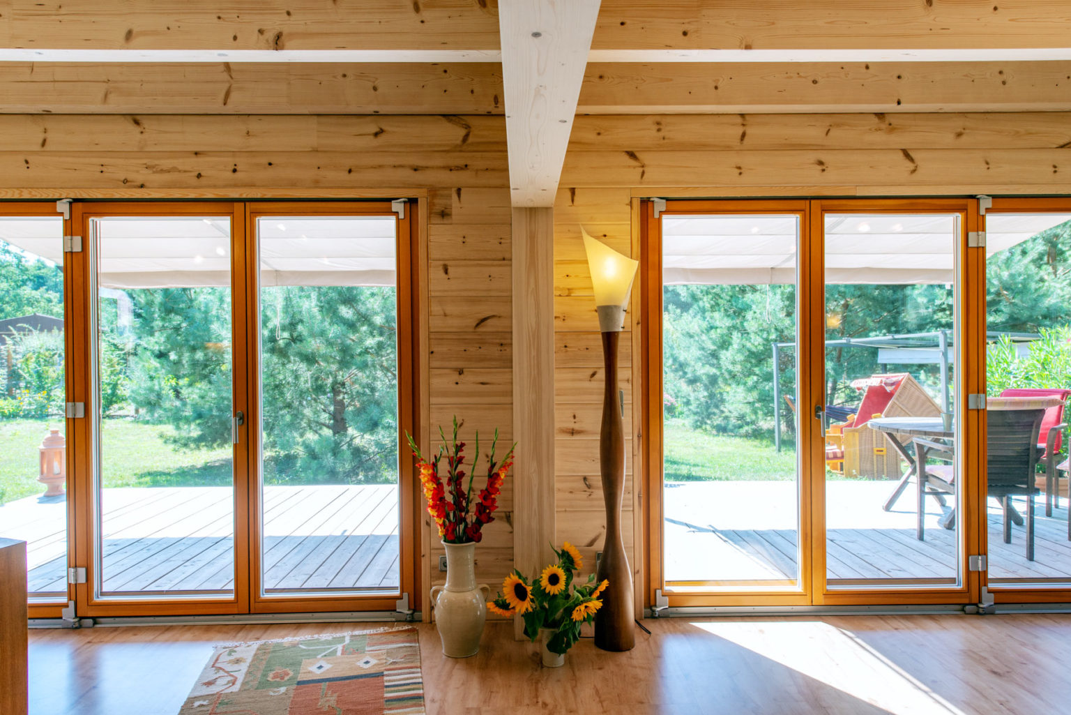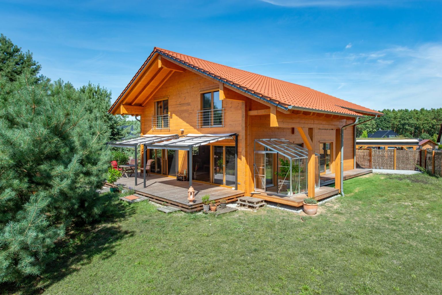 Das Eigentümerpaar entwarf und plante sein Holzhaus zusammen mit einem befreundeten Architekten und dem Fullwood-Berater ganz nach den eigenen Vorstellungen. „Für uns hat ein praktischer Wohnalltag Priorität.“, betont die Hausherrin. „Dazu gehören: ein barrierefreier Zugang; geringer Pflegeaufwand; Verzicht auf einen Keller zugunsten Abstell- und Hauswirtschaftsräumen; sowie einer Balkenlage mehr pro Geschoss, was einen höheren Kniestock und somit mehr Raum im Dachgeschoss bewirkt.“ Außerdem sind den Eigentümern von Holzhaus „auf der Zauche“ generell natürliche Materialien und Naturnähe wichtig. Deshalb kombinierten sie zu den tragenden Holzwänden („Kombiblockwand“) Trennwände (leichter Ständerbau) mit Lehm-Putz zur optimalen Feuchteregulierung, fußwarme Korkböden, nässeunempfindliche Natursteinböden (Bäder) und Fensterrahmen sowie Zimmertüren aus Naturholz. „Damit die Holzwände und Balkendecken innen nicht nachdunkeln, haben wir sie mit UV-Schutz lasiert.“, verrät der Hauseigentümer. Außen bekamen die Polarkiefernwände einen schönen, wie Honig in der Sonne leuchtenden Anstrich, der auch vor natürlicher Vergrauung schützt.