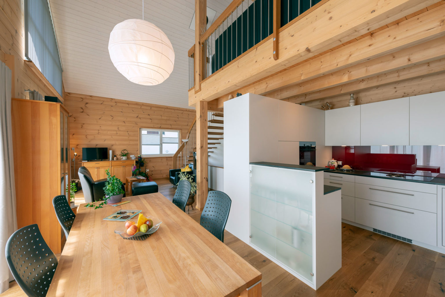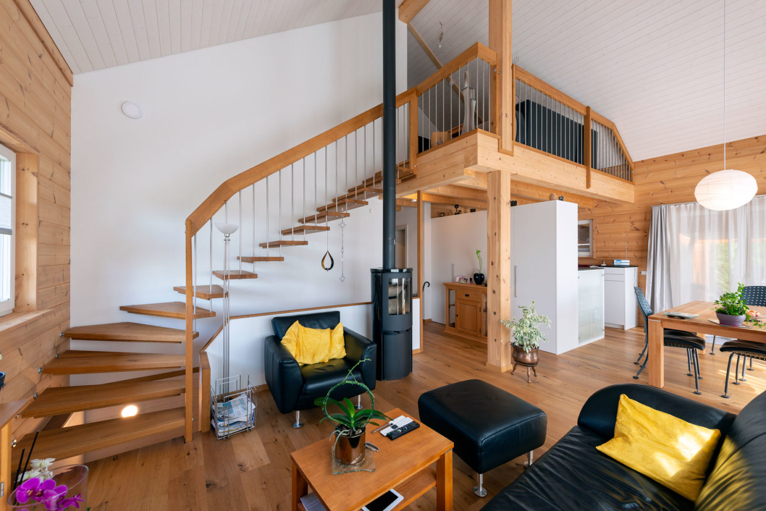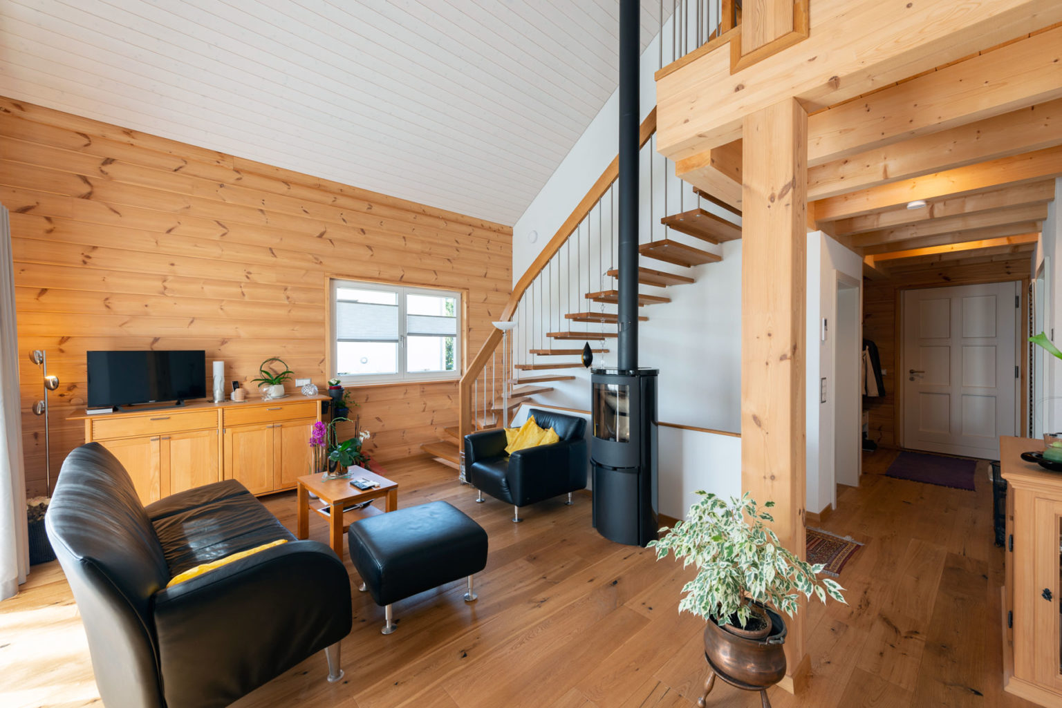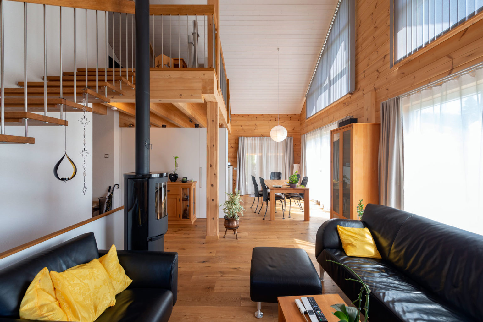 Neben der gemütlichen, immer angenehm warmen Atmosphäre in ihrem Holzhaus schwärmen die Eigentümer besonders von dem wohltuenden Raumklima darin. „Die Wände sind chemisch nicht behandelt, dünsten also keine Schadstoffe aus.“, freut sich die Eigentümerin, und:“ Wir haben drinnen auch keine Lasuren, Wachse oder Öle etc. aufgetragen. Das Holz darf ganz natürlich nachdunkeln.“ Draußen bekam Holzhaus „Bähnliblick“ allerdings einen Schutzanstrich, der gegen Vergrauung wirkt und dem Holz eine dunklere, warme Farbe verleiht. Eine moderne Luftwärmepumpe beheizt das Holzhaus mittels Fußbodenheizung, und ein schicker Kaminofen sorgt im Wohnbereich für schnelle, besonders gemütliche Strahlungswärme. Im Hausinnern kombinierten die Eigentümer weiß verputzte Trennwände aus leichtem Ständerbau sowie weiß lasierte Dachschrägen-Verschalungen zu dem vielen Holz und ließ den gesamten Wohn-Essbereich bis zum First offen. Ein hoher Luftraum erstreckt sich nun darüber, der neben den weißen Elementen für besonders viel Helligkeit und ein luftiges Raumgefühl sorgt. Da die Giebelwand zum Garten (Nord-Osten) über ihre eineinhalb Geschosse fast vollständig verglast ist, fällt reichlich natürliches Licht in den Wohnbereich, wo es von den weißen Wänden und Dachschrägen reflektiert wird und alles sehr hell erstrahlen lässt. Auch die Galerie im Dachgeschoss, von der es in ein Büro und ein Gästezimmer geht, profitiert von den großen Fensterflächen.