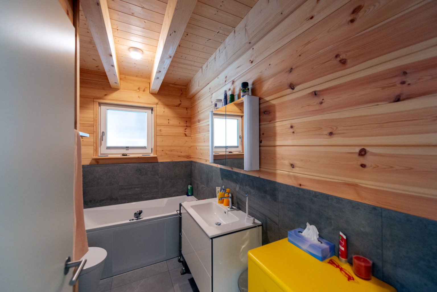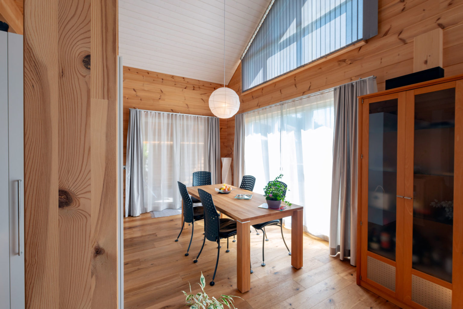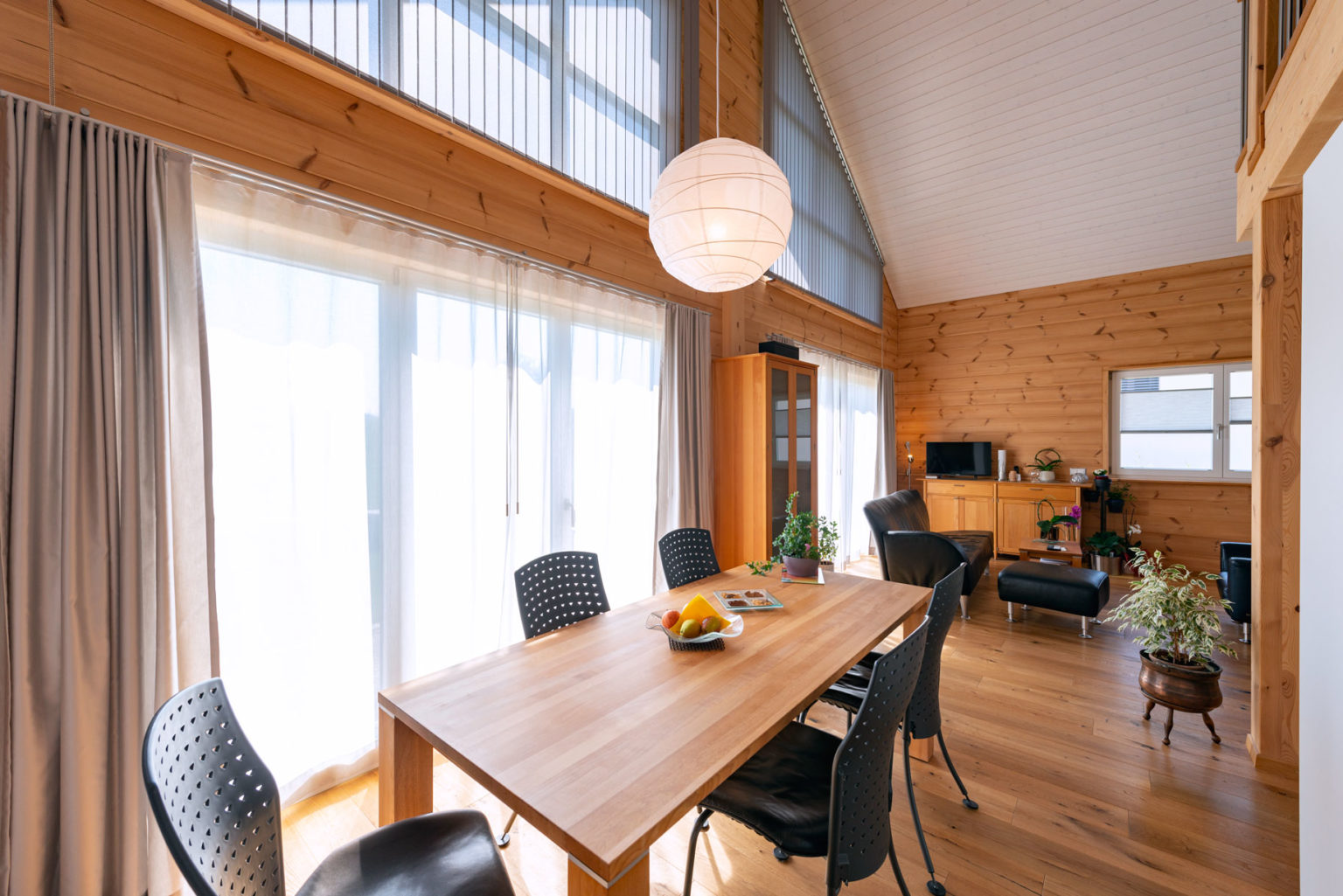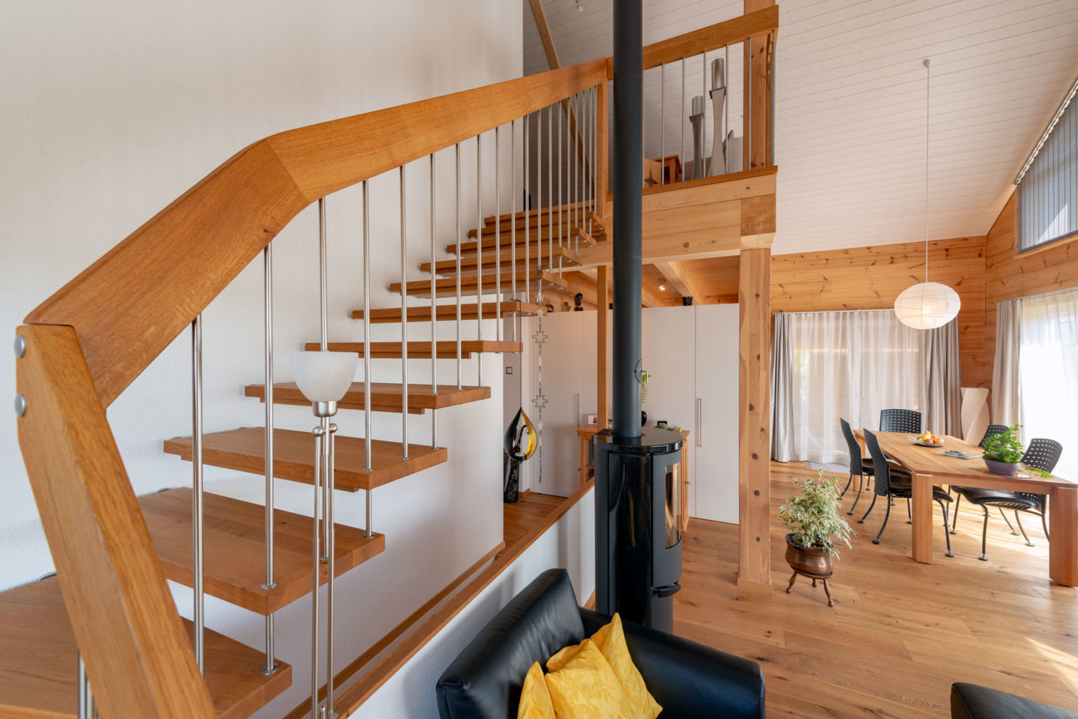 Neben der gemütlichen, immer angenehm warmen Atmosphäre in ihrem Holzhaus schwärmen die Eigentümer besonders von dem wohltuenden Raumklima darin. „Die Wände sind chemisch nicht behandelt, dünsten also keine Schadstoffe aus.“, freut sich die Eigentümerin, und:“ Wir haben drinnen auch keine Lasuren, Wachse oder Öle etc. aufgetragen. Das Holz darf ganz natürlich nachdunkeln.“ Draußen bekam Holzhaus „Bähnliblick“ allerdings einen Schutzanstrich, der gegen Vergrauung wirkt und dem Holz eine dunklere, warme Farbe verleiht. Eine moderne Luftwärmepumpe beheizt das Holzhaus mittels Fußbodenheizung, und ein schicker Kaminofen sorgt im Wohnbereich für schnelle, besonders gemütliche Strahlungswärme. Im Hausinnern kombinierten die Eigentümer weiß verputzte Trennwände aus leichtem Ständerbau sowie weiß lasierte Dachschrägen-Verschalungen zu dem vielen Holz und ließ den gesamten Wohn-Essbereich bis zum First offen. Ein hoher Luftraum erstreckt sich nun darüber, der neben den weißen Elementen für besonders viel Helligkeit und ein luftiges Raumgefühl sorgt. Da die Giebelwand zum Garten (Nord-Osten) über ihre eineinhalb Geschosse fast vollständig verglast ist, fällt reichlich natürliches Licht in den Wohnbereich, wo es von den weißen Wänden und Dachschrägen reflektiert wird und alles sehr hell erstrahlen lässt. Auch die Galerie im Dachgeschoss, von der es in ein Büro und ein Gästezimmer geht, profitiert von den großen Fensterflächen.