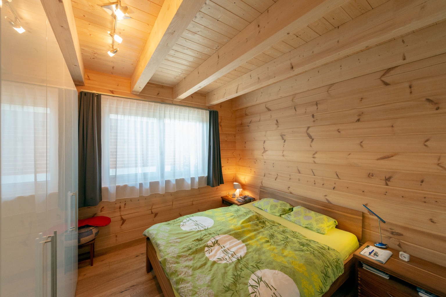 Neben den 27cm dicken, einschaligen Kiefernholzwänden und offenen Sichtbalkendecken aus dem gleichen Holz, hat das Eigentümerpaar außerdem Eichendielenparkett im gesamten Gebäude verlegt. Einzig die Nassräume wurden gefliest. Holzfenster und –Türen, eine Eichenholztreppe mit Stahlrohren sowie diverse Massivholzmöbel ergänzen das Holzhaus.