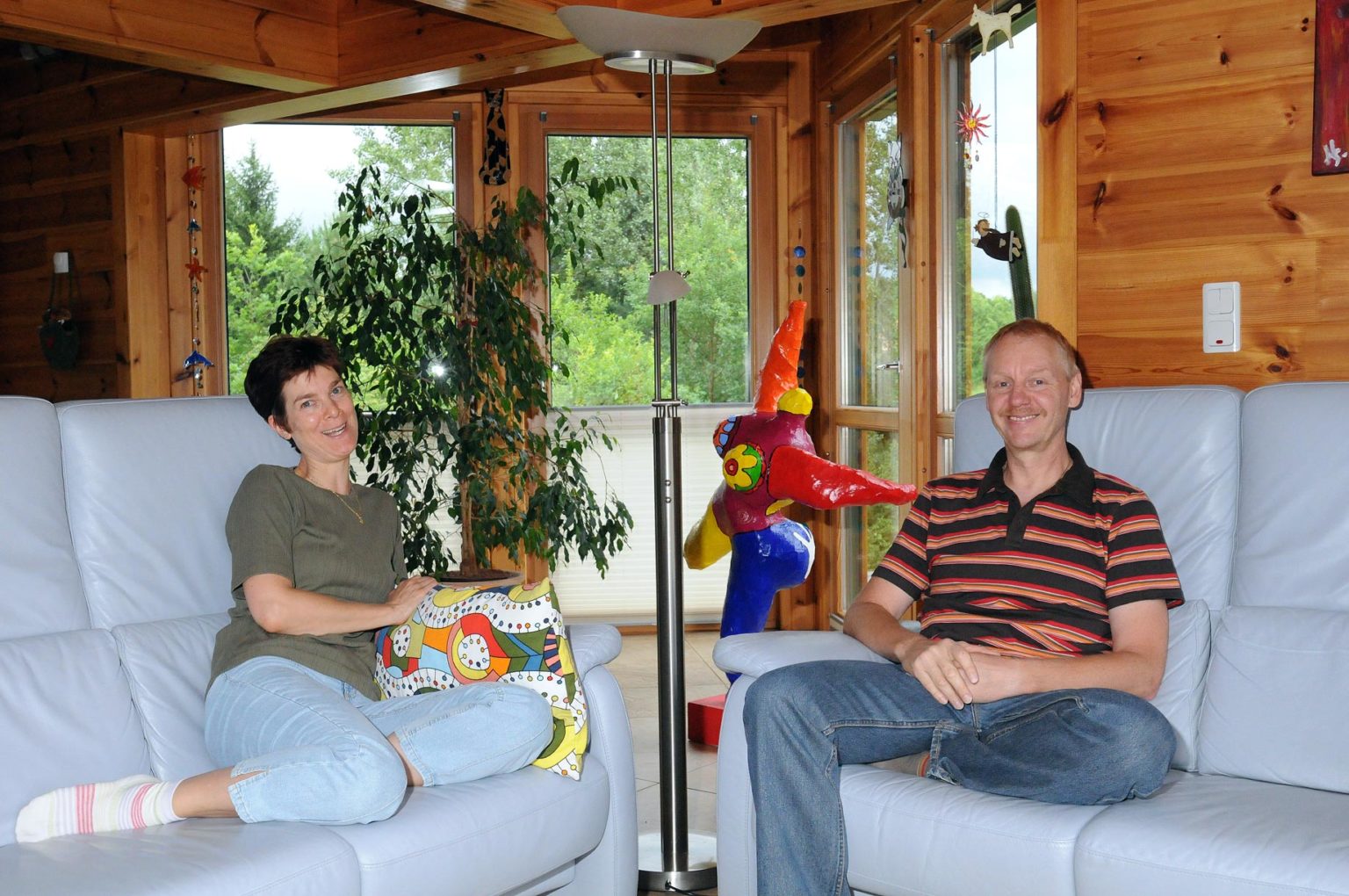 An ihren Hausaufbau haben die Eheleute bis heute nur gute Erinnerungen, obwohl er im August 2003 mit einer kleinen Panne begann: Wilfried Spang musste den ersten LKW mit dem Auto aus dem Nachbarort zu Baustelle lotsen, nachdem er ihm einen guten Platz zum Wenden gezeigt hatte. Danach ging es mit ungebremstem Elan zur Sache, was unter anderem Pia Ruschel bemerkte, als sie um die Mittagszeit mit vollen Einkaufstaschen zur Baustelle kam: „Da habe ich mich ganz schön gewundert, wie viele Außenwände schon standen. Das war auch hier im Ort eine kleine Sensation, weil der Aufbau viel schneller lief als bei den konventionellen Holzhäusern, die man bisher beobachtet hatte.“ Die Mitarbeiter von Fullwood waren nicht nur „superfreundlich“, sie arbeiteten auch schnell, sauber und präzise. Und sprangen ein, wenn Not am Bau war: „Weil sich die Tochter meines Mannes kurz vor Baubeginn entschieden hatte, doch noch bei uns einzuziehen, halfen sie uns während des Hausaufbaus, das Gästezimmer umzugestalten“, erinnert sich Pia Ruschel. Die Innenwand zwischen den beiden Räumen wurde versetzt, wodurch das Bad zwar etwas kleiner, das ehemalige Gästezimmer aber umso wohnlicher wurde. Die Baufamilie, die „ihre“ Aufbaukolonne im heißen Sommer 2003 stets mit Getränken versorgte und regelmäßig mit Ihnen beim Essen zusammensaß, ist bis heute mit den Fullwood-Mitarbeitern befreundet. Das geht so weit, „dass sie bei uns vorbeischauen, wenn sie in der Nähe zu tun haben“. Ein freundschaftlicher Kontakt, der dem Ehepaar von Anfang an das Gefühlt gab, „in guten Händen zu sein. Das war uns wichtig, schließlich baut man nur einmal im Leben ein Haus.“ Ihr gutes Gefühl hat sich für Pia Ruschel und Wilfried Spang während der Hausmontage immer wieder bestätigt. Nach Aufbau-Mängeln gefragt, fällt dem Ehepaar auch nach längerem Nachdenken keiner ein. Hinzu kam, dass die Mitarbeiter auch bei Fragen zu den umfangreichen Eigenleistungen sofort zur Stelle waren.