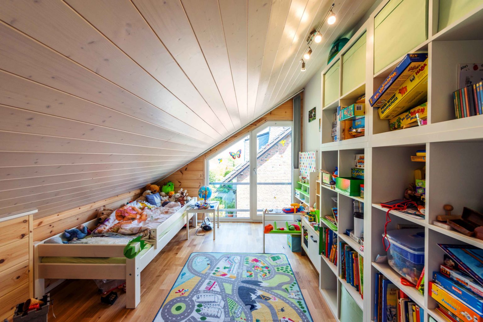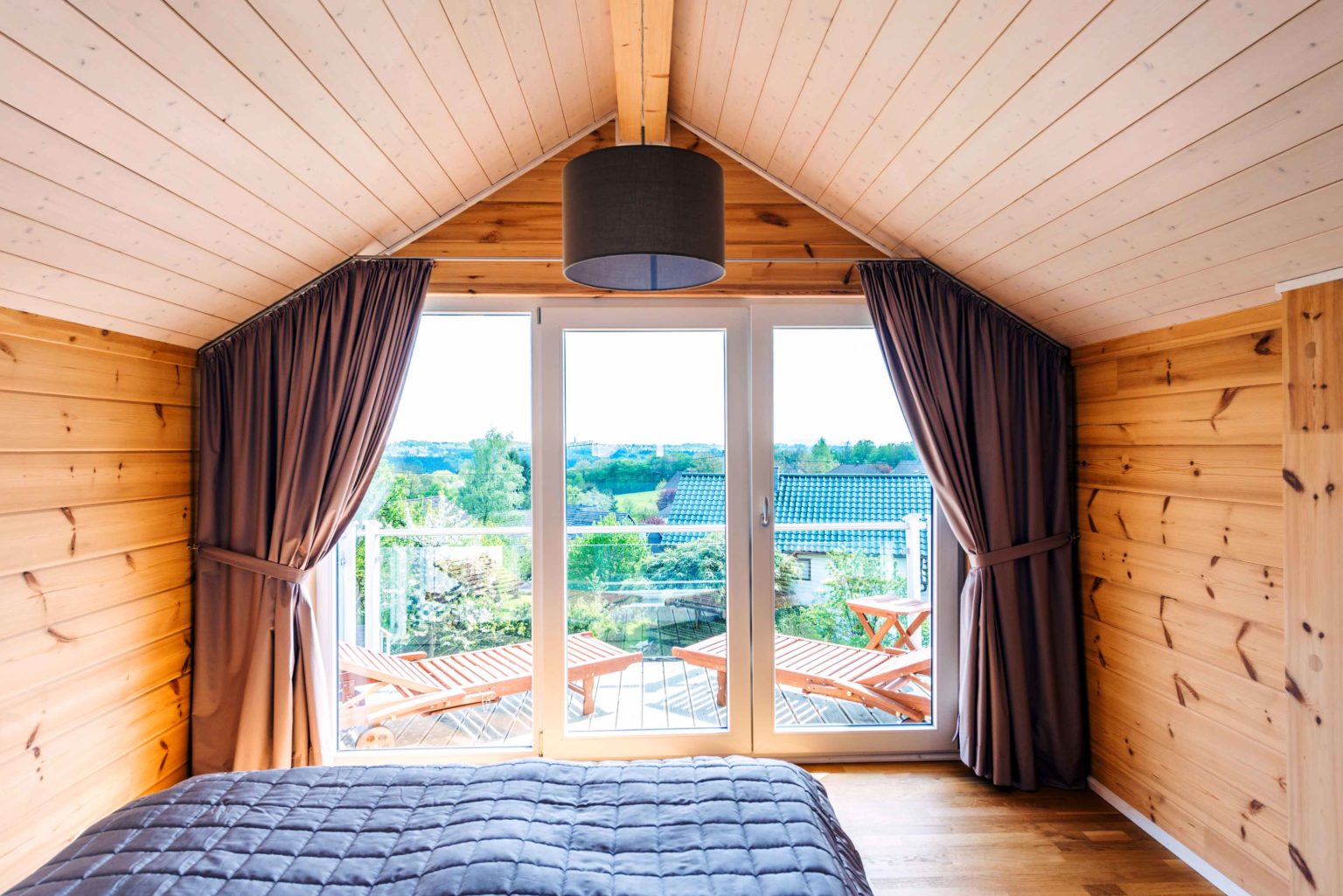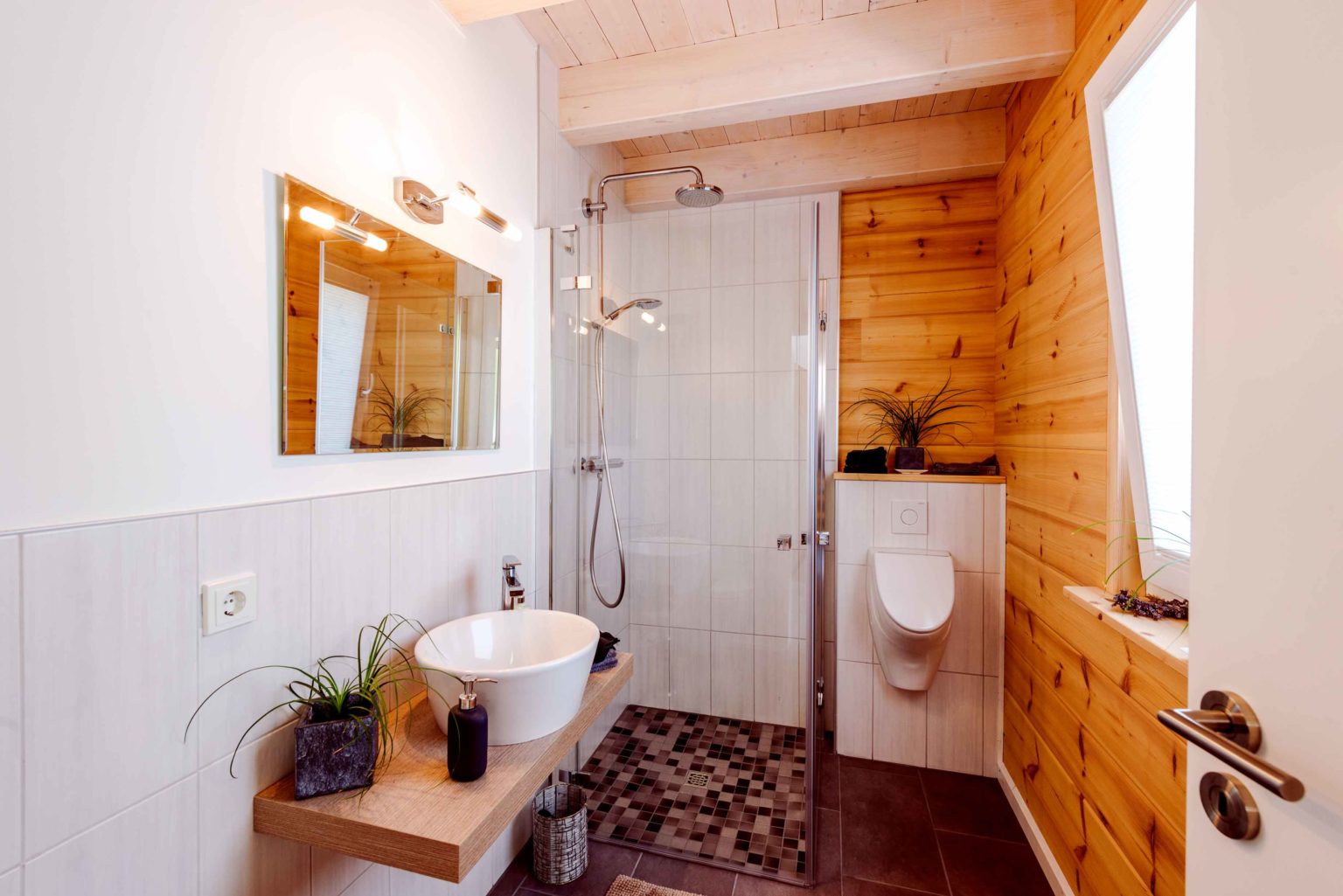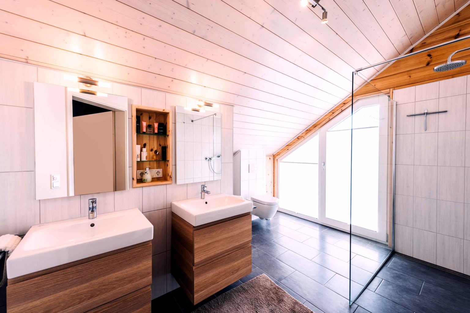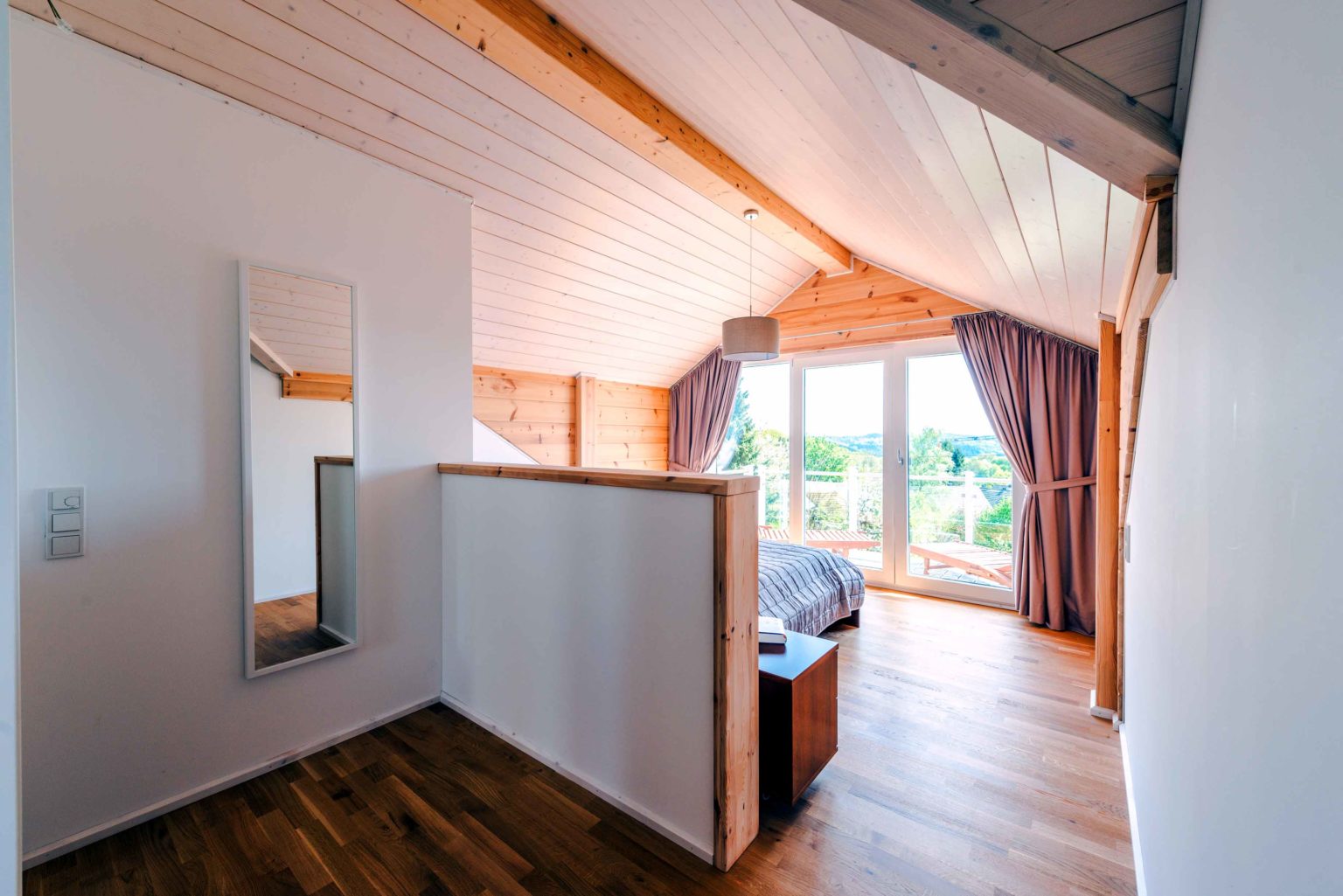 Highlight des Dachgeschosses ist eindeutig das elterliche Schlafzimmer: Es befindet sich im vollgeschossigen Zwerchhaus und lässt einen herrlichen Blick durch bodentiefe Fenster ins Grüne vom Bett aus zu. Die Hausherrin ließ eigens eine halbhohe Wand zwischen Zimmertür und Kopfende des Bettes einziehen, um im Bett verweilend ein geschütztes Gefühl im Nacken zu haben. Dank der gläsernen Balkonbrüstung hindert nichts den Blick auf die Berge in der Ferne. Im Schlafzimmer führt rechts ein kleiner Flur zur Ankleide und zum angeschlossenen Wohn-Bad des Ehepaares. Dort hält die Fußbodenheizung auch beim Duschen die Fußsohlen immer schön warm. Der Sohn der Familie besitzt ein eigenes Badezimmer, das unmittelbar neben seinem Kinderzimmer positioniert ist. Diese beiden Räume, sowie zwei weitere Zimmer, sind ebenfalls vom hell belichteten Flur des Dachgeschosses aus zu erreichen. So schön und perfekt, wie Holzhaus „Bergische Sonne“ heute ist, hätte die Hausherrin ihr Heim gar nicht träumen können, und die Zusammenarbeit mit Fullwood bezeichnen Sie und ihr Mann ebenfalls als traumhaft!