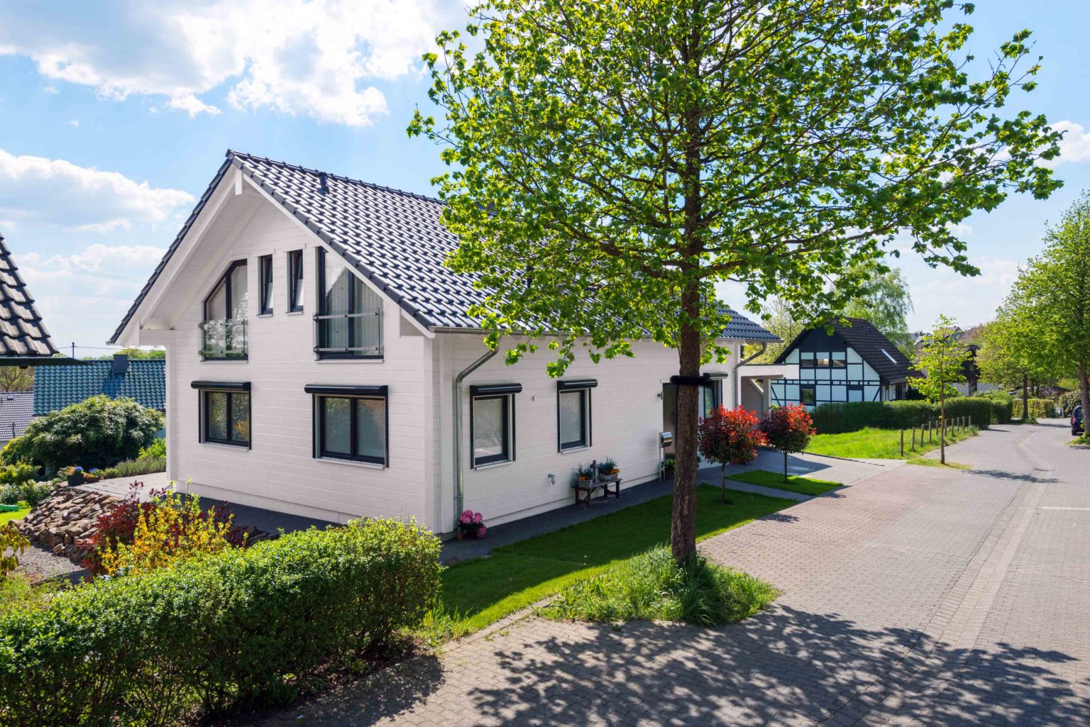 Als die im Werk vorgefertigten Wandelemente am frühen, sonnigen Morgen des 02. Juni geliefert wurden, stand der Baukran schon bereit und die Monteure legten gleich mit ihrer Arbeit los. In knapp drei Tagen stand der Rohbau, noch ohne Dacheindeckung, da und erweckte erst einmal viel Skepsis in der Nachbarschaft. Ein massives Holzhaus gab es bis dato in dem gewachsenen Einfamilienhausviertel nicht. Würde es wie eine Skihütte aussehen? Zöge Wind durch die (nicht vorhandenen) Ritzen? Könnten überhaupt Leitungen gelegt werden? Die Aufregung war groß, schlug aber schnell in Begeisterung um, als Holzhaus „Bergische Sonne“ äußerlich fertig dastand. Fast war man traurig, als die Maler die naturhellen Kiefernholzwände weiß strichen. Auch der Innenausbau klappte wie am Schnürchen, so dass die Familie am 06. Oktober, also nach nur vier Monaten Bauzeit, ihr komplett fertiges Eigenheim beziehen konnte. Selbstverständlich war es schon im ersten Winter mollig warm im Holzhaus, da die 20 cm dicken, einschaligen Vollholzwände des Herstellers absolut winddicht sind und hervorragend dämmen. Zudem leisten sowohl die Aufdachdämmung als auch die Wärmeschutzfenster ihren Beitrag zur Wärmeeffizienz. Beheizt wird das Gebäude über die auf beiden Etagen verlegte Fußbodenheizung mit Gas. Unterstützt wird die Wassererwärmung von einer solaren Anlage.
