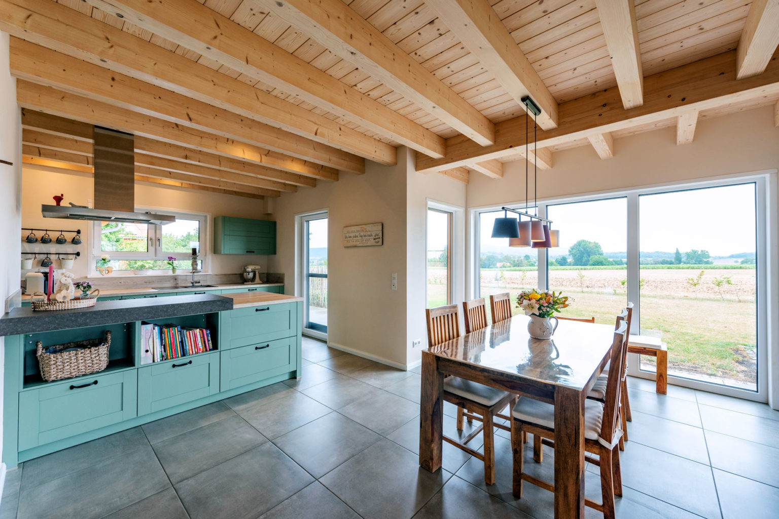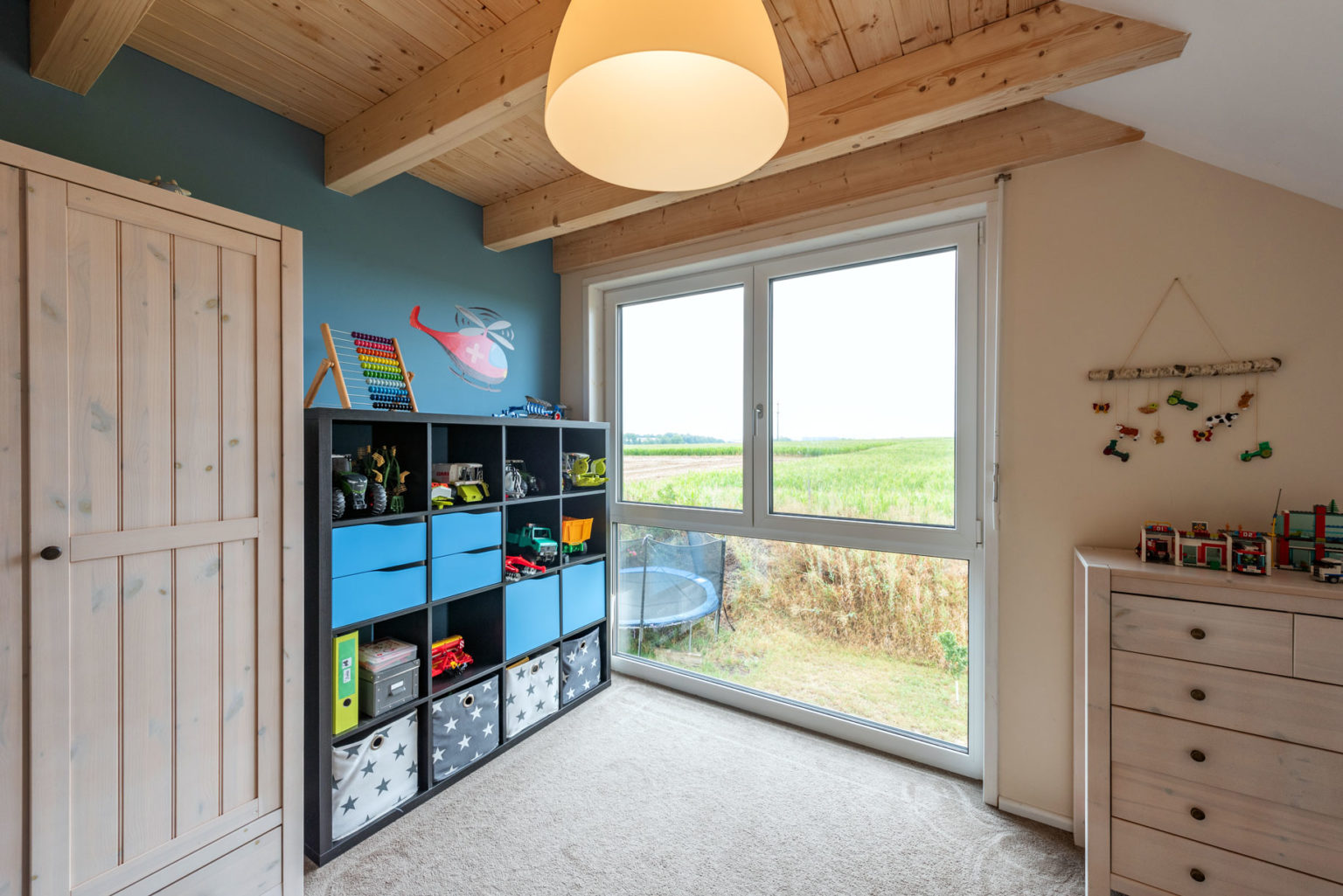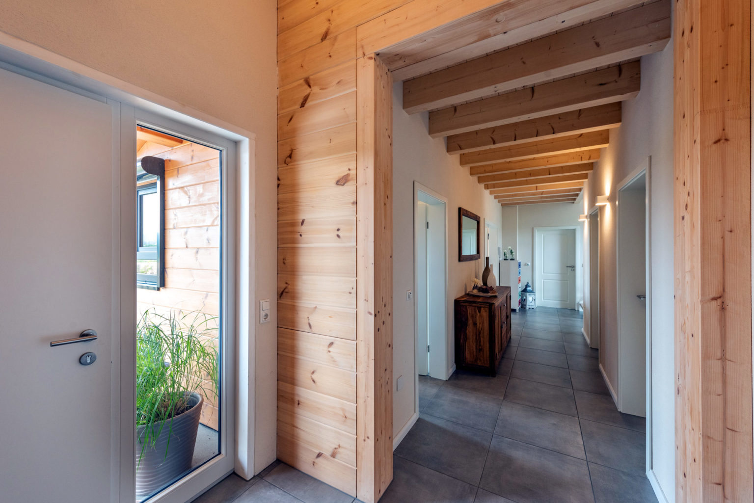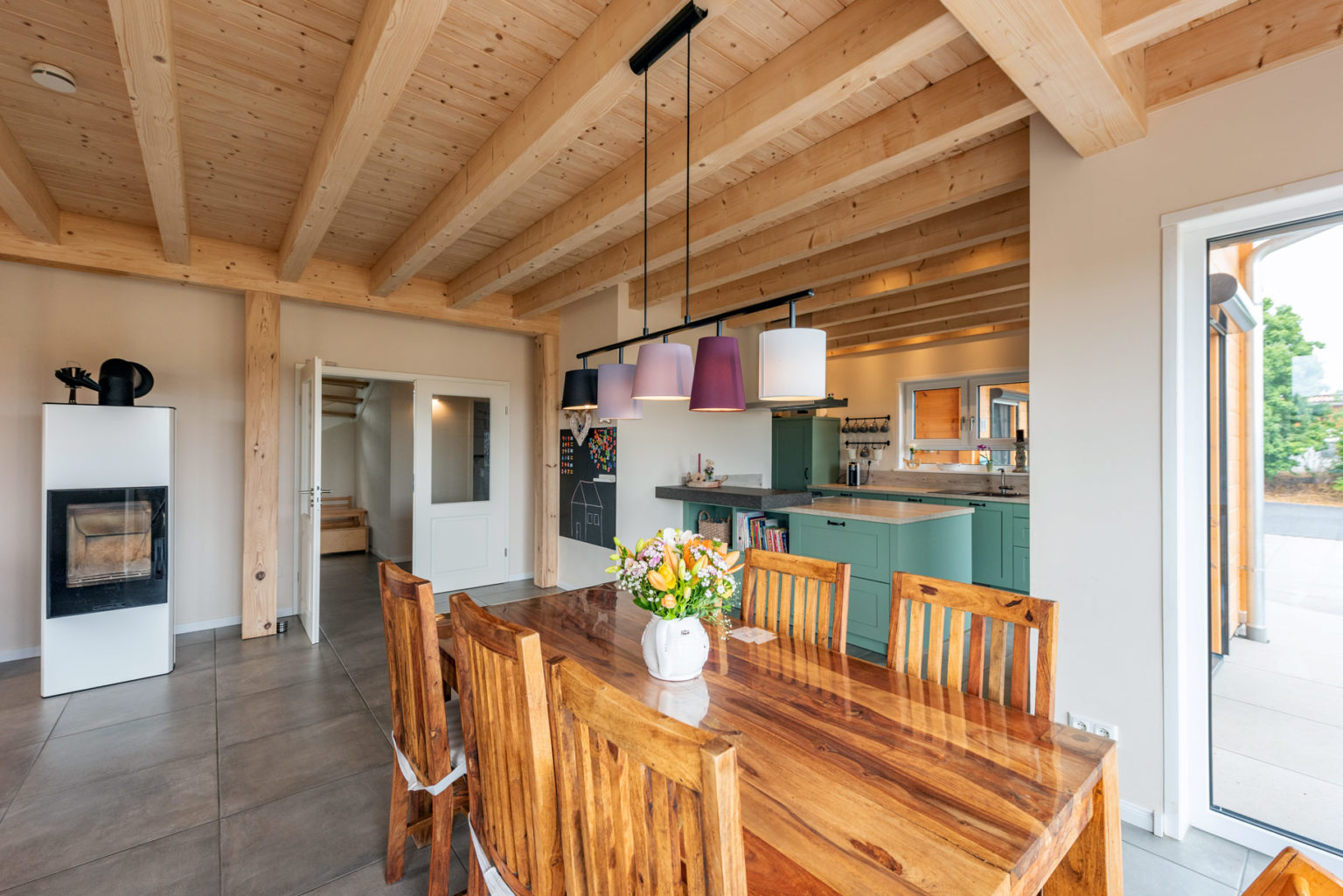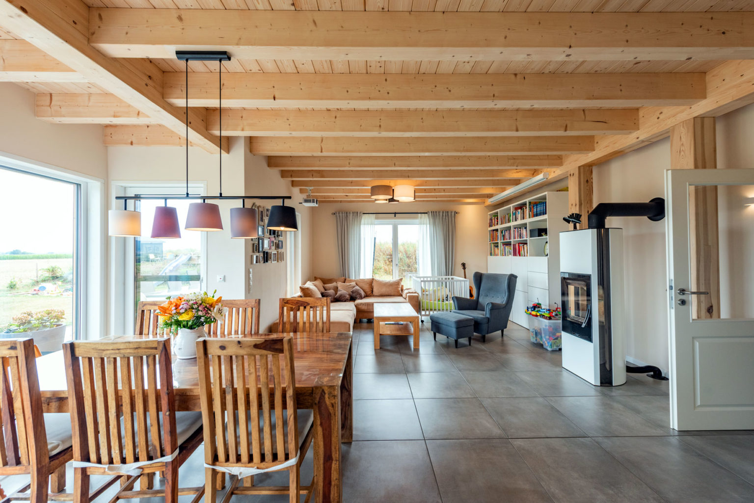 Ökologie und Energieeffizienz liegt der Eigentümerfamilie in Bezug auf ihr Holzhaus und ihr Leben besonders am Herzen, deshalb fiel ihre Wahl auf ein Fullwood und auf eine große Photovoltaikanlage auf dem Hausdach. Die Solaranlage liefert den gesamten Strom, den die Familie benötigt und erwärmt auch das Brauchwasser. Ein schmucker, moderner Kaminofen im Wohnbereich zaubert mit angenehmer Strahlungswärme ein Plus an Behaglichkeit und unterstützt die Fußbodenheizung. Wichtig sind den Besitzern von Holzhaus „Bettenburgblick“ außerdem helle, großzügige Räume mit behaglichem Ambiente und Offenheit im Wohnbereich (Kochen, Essen, Wohnen). Die hellen Holzbalkendecken (mit UV-Schutz gegen Nachdunkeln behandelt) sorgen für ein warmes Wohngefühl, unterstützt von den cremeweiß abgetönten Wänden, die sowohl für Helligkeit als auch für optische Harmonie sorgen. Passend dazu wurden die pflegeleichten Bodenfliesen in einem hellen Grauton gewählt. Sie wurden im gesamten Holzhaus einheitlich verlegt, was die Großzügigkeit der Wohnfläche betont, anstatt sie zu unterbrechen. Lediglich das Schlaf- und die Kinderzimmer wurden mit fußwarmem Teppich ausgestattet. Viele, überwiegend bodentiefe Fenster mit innen weißen Rahmen, lassen reichlich natürliches Licht in alle Zimmer strömen, das Resultat ist ein lichtdurchflutetes Zuhause. Außen sind die Fensterrahmen und Rollladenkästen passend zur Dachziegelfarbe anthrazit gewählt, da dies modern wirkt und perfekt zur hellen Außlasur des Holzes passt.