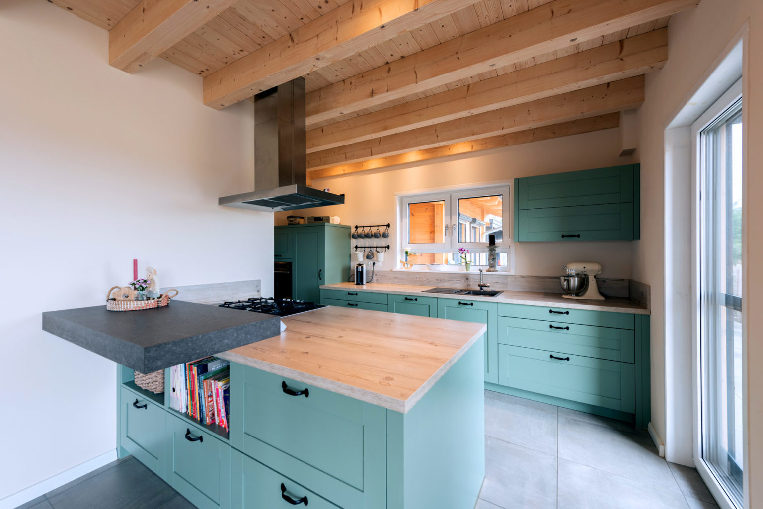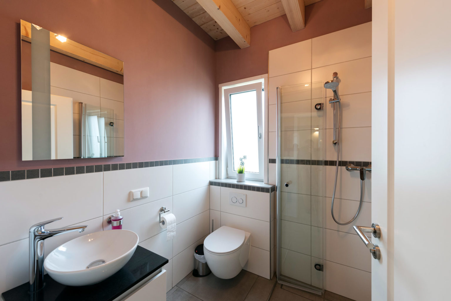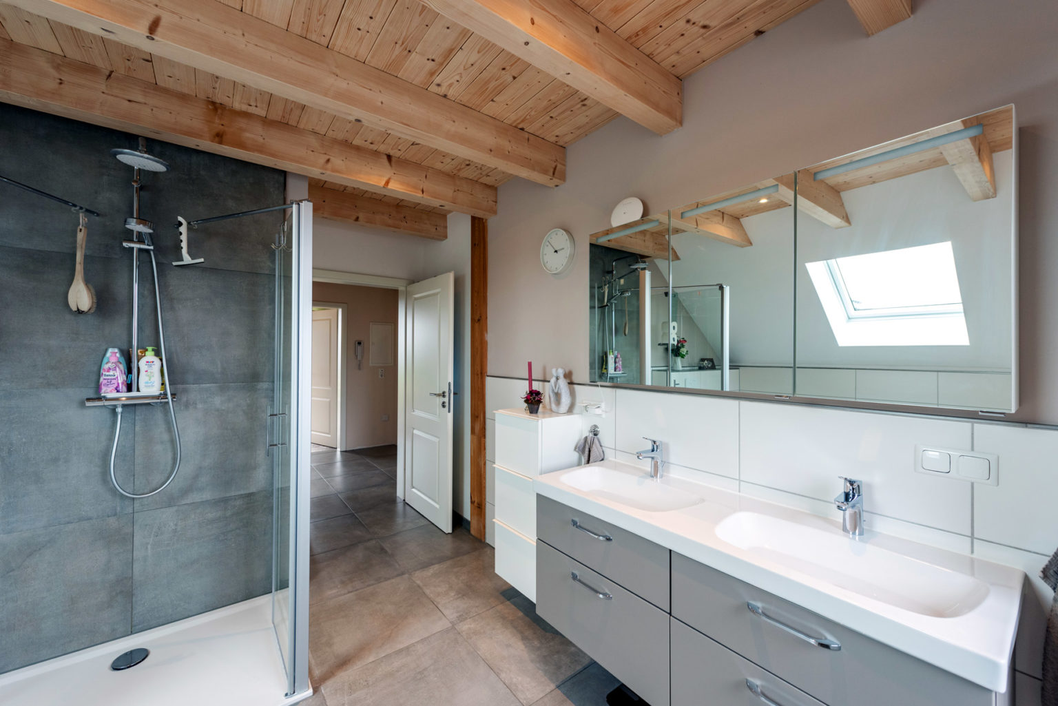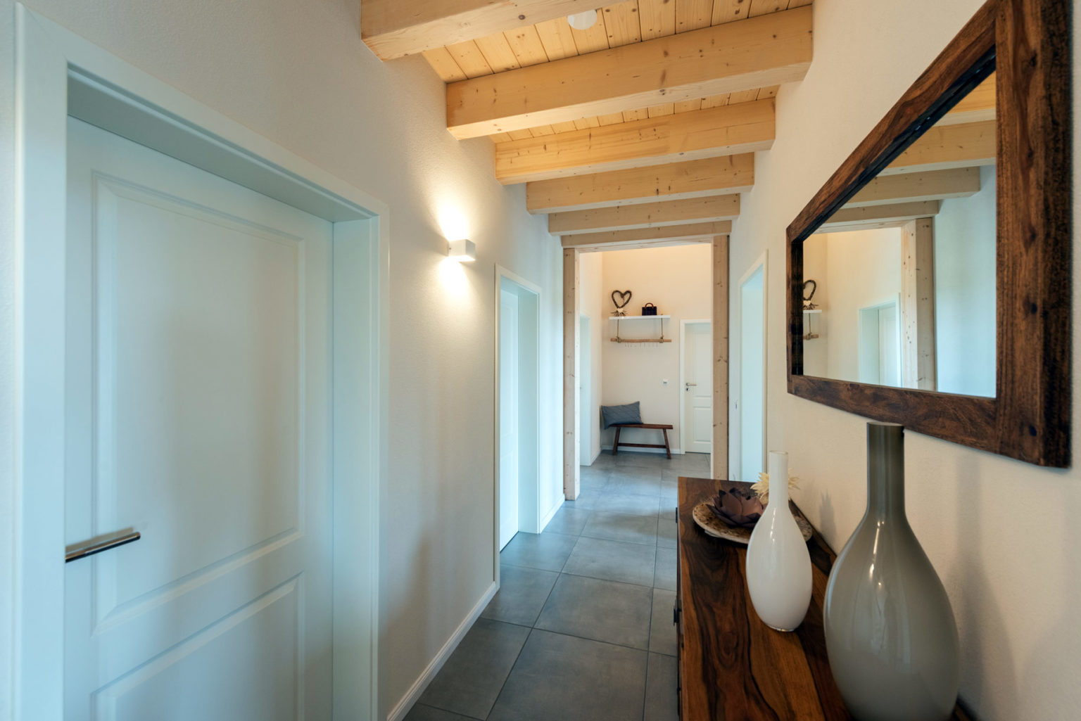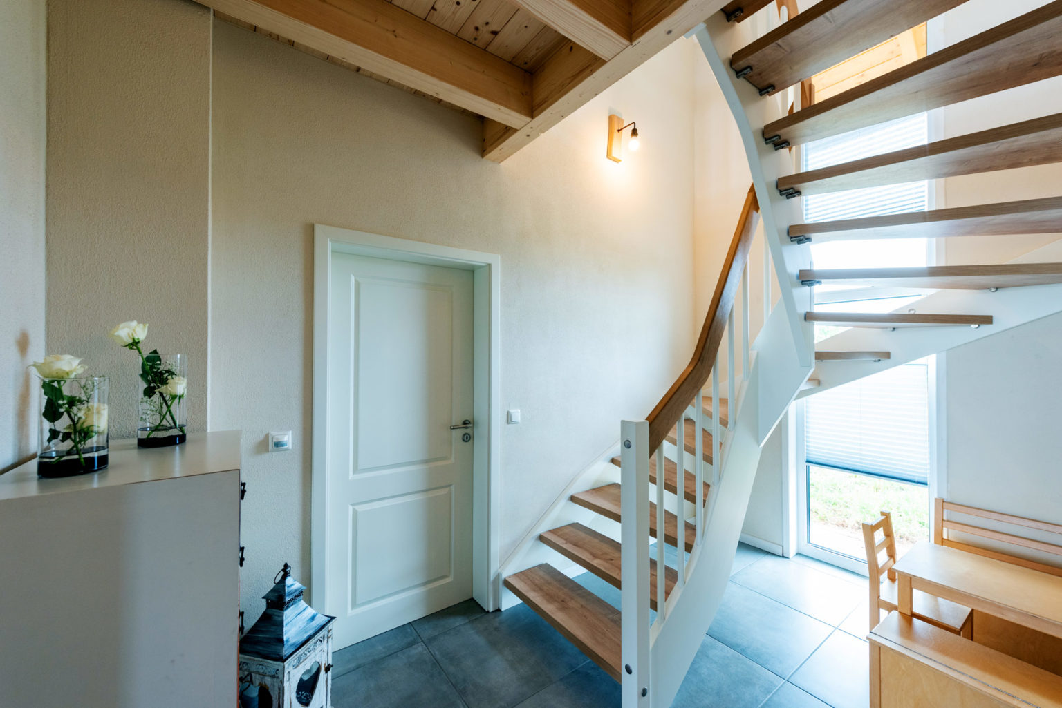Ökologie und Energieeffizienz liegt der Eigentümerfamilie in Bezug auf ihr Holzhaus und ihr Leben besonders am Herzen, deshalb fiel ihre Wahl auf ein Fullwood und auf eine große Photovoltaikanlage auf dem Hausdach. Die Solaranlage liefert den gesamten Strom, den die Familie benötigt und erwärmt auch das Brauchwasser. Ein schmucker, moderner Kaminofen im Wohnbereich zaubert mit angenehmer Strahlungswärme ein Plus an Behaglichkeit und unterstützt die Fußbodenheizung. Wichtig sind den Besitzern von Holzhaus „Bettenburgblick“ außerdem helle, großzügige Räume mit behaglichem Ambiente und Offenheit im Wohnbereich (Kochen, Essen, Wohnen). Die hellen Holzbalkendecken (mit UV-Schutz gegen Nachdunkeln behandelt) sorgen für ein warmes Wohngefühl, unterstützt von den cremeweiß abgetönten Wänden, die sowohl für Helligkeit als auch für optische Harmonie sorgen. Passend dazu wurden die pflegeleichten Bodenfliesen in einem hellen Grauton gewählt. Sie wurden im gesamten Holzhaus einheitlich verlegt, was die Großzügigkeit der Wohnfläche betont, anstatt sie zu unterbrechen. Lediglich das Schlaf- und die Kinderzimmer wurden mit fußwarmem Teppich ausgestattet. Viele, überwiegend bodentiefe Fenster mit innen weißen Rahmen, lassen reichlich natürliches Licht in alle Zimmer strömen, das Resultat ist ein lichtdurchflutetes Zuhause. Außen sind die Fensterrahmen und Rollladenkästen passend zur Dachziegelfarbe anthrazit gewählt, da dies modern wirkt und perfekt zur hellen Außlasur des Holzes passt.