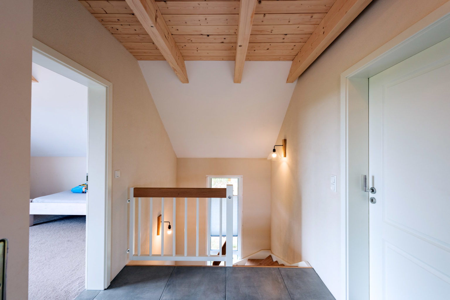 Holzhaus „Bettenburgblick“ wurde individuell für das junge Eigentümerpaar geplant und auf Wunsch der Bauherrschaft als „Richtmeistermontage“ geliefert. Das heißt, die Wände und Balken/Sparren wurden im Werk angefertigt, termingetreu zur Baustelle geliefert, mittels Krans an Ort und Stelle gehievt und vom Baupaar und seiner Familie aufgestellt. Selbstverständlich stand bei der Hausmontage ein Richtmeister von Fullwood zur Verfügung, der nicht nur Regie führte, sondern auch federführend vor- und mitarbeitete. Den Innenausbau organisierten die Hauseigentümer komplett selber und erledigten bis auf Elektroinstallation, Heizungsmontage und Fliesenverlegen alle Arbeiten sogar eigenhändig. Das Einfamilienhaus verfügt über eineinhalb Geschosse inklusive Spitzboden. Dem Haupthaus ist ein eingeschossiger Anbau angeschlossen, in dem sich der Eingangsbereich, ein großer Abstellraum sowie der Technik- und Hauswirtschaftsraum befinden. Vom Eingangsbereich gelangt man in eine langgestreckte Diele im Haupthaus, die zum offenen Wohnbereich, zum Gästezimmer, zum Gäste-Bad/WC und zur Garderobe führt. Die Küche besitzt zusätzlich einen eigenen Zugang (kurze Wege!) und direkt daneben eine separate Speisekammer. Vom Flur geht es über eine offene Geschosstreppe hinauf ins Dachgeschoss, wo es von einem weiteren Flur aus in drei Kinderzimmer, ein Schlafzimmer und ein großes Badezimmer geht. Ein zweigeschossiger Erker mit eigenem Satteldach vergrößert die Wohnfläche des ansonsten rechteckigen Grundrisses und da er auf beiden Geschossen über seine gesamte Breite bodentief verglast ist, strömt noch mehr Tageslicht in die angrenzenden Räume.