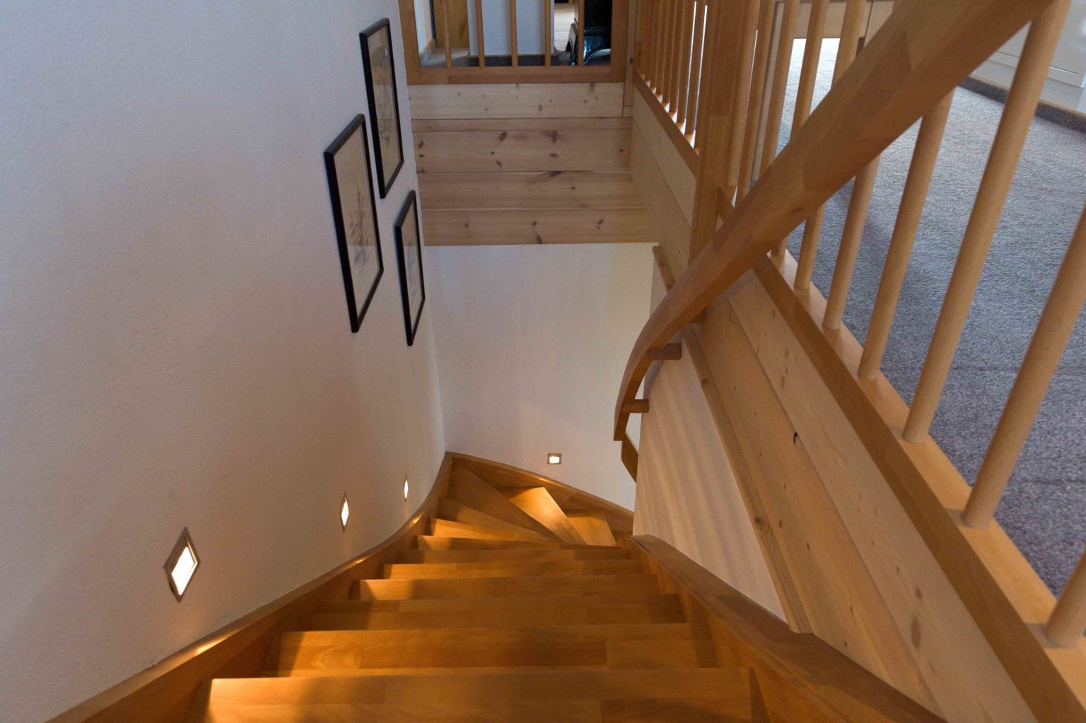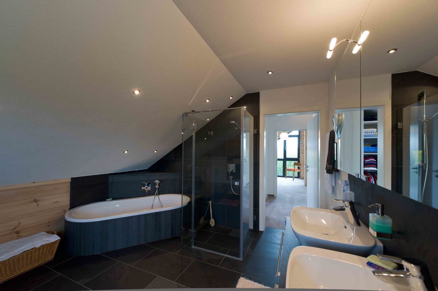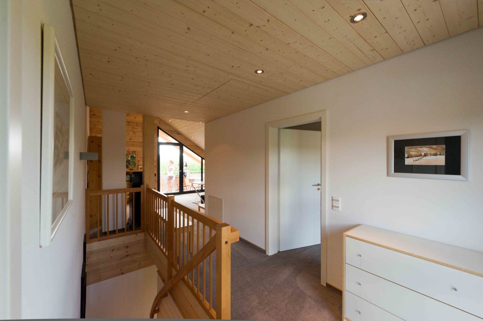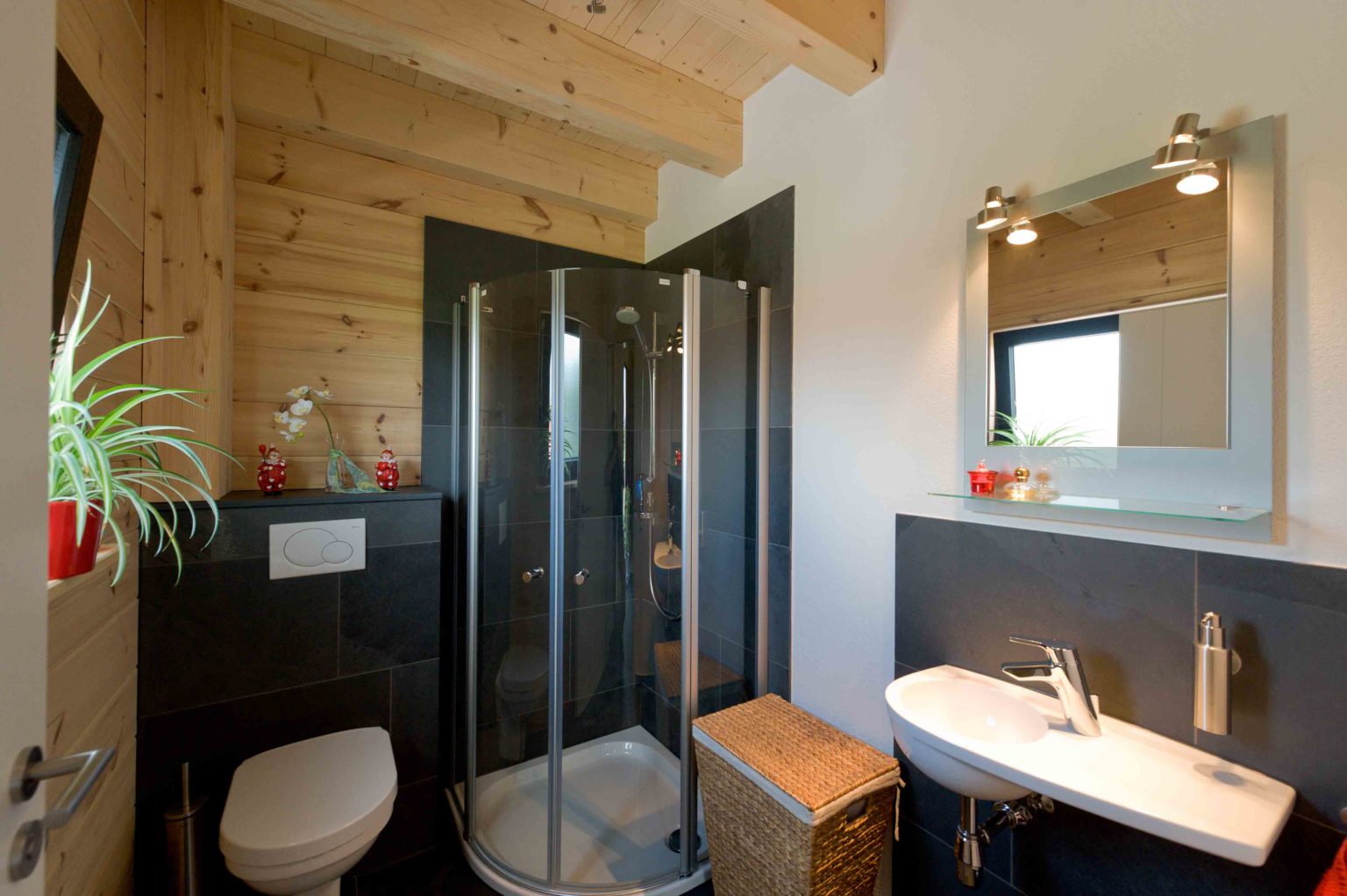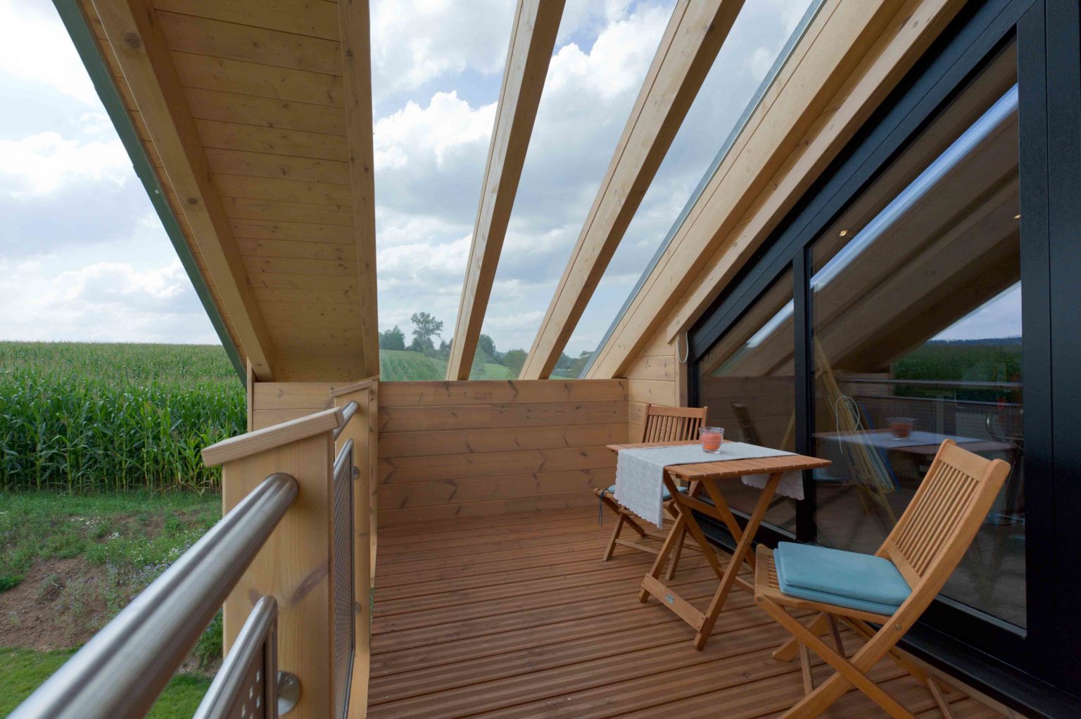 Damit das Holzhaus schön hell bleibt und nicht vergraut, wurden seine setzungsfreien, winddichten Wände aus Nordischer Kiefer innen wie außen mit UV-Schutz behandelt und außen mit einer Wetterschutzlasur bestrichen. Die tragenden, 20cm starken Außenwände werden von weiß verputzten Trennwänden in Ständerbauweise ergänzt, die nicht nur Abwechslung sondern auch noch mehr Helligkeit ins Holzhaus bringen und das hereinfallende Tageslicht reflektieren. Als Kontrast zu den insgesamt hellen Wänden wählte man anthrazitfarbene Holzfenster, deren dunkler Grauton perfekt mit den Schiefer-Bodenfliesen übereinstimmt. Das gesamte Erdgeschoss - wo sich neben einer großen Diele noch ein Gästezimmer, eine Gäste-Dusche/WC und der weitläufige, offene Wohn-Ess-Kochbereich befindet - und das Bad im Obergeschoss sind damit ausgelegt. Die restlichen Räume im Dachgeschoss, nämlich Schlafzimmer, zweites Gästezimmer und offener Flur-Arbeits-Bereich, sind mit Fußschmeichelndem Teppich ausgestattet. Bis zum Firstbalken offen ist das Obergeschoss, die Raumhöhe ist deshalb auch hier oben luftig und nichts „drückt“, trotz Dachschrägen. Als zusätzlichen Raum nutzen Karin und Rolf Glasbrenner gerne ihren überdachten, windgeschützten, nach Süden ausgerichteten Balkon, von dem aus sie eine herrliche Weitsicht übers Land haben. Besonders am Abend, nach getaner Arbeit, sitzen die beiden gerne hier oben, denn durch das eigens an der Westseite des Hausdaches eingesetzte Glasdach bekommt der Balkon auch noch die Abendsonne mit. Ein lauschiges Plätzchen, an dem man es auch bei Regen wunderbar aushalten kann. Das Ehepaar sagt mit dem Brustton der Überzeugung:
