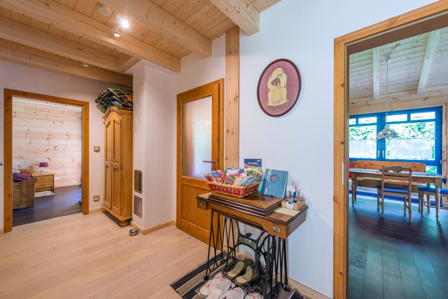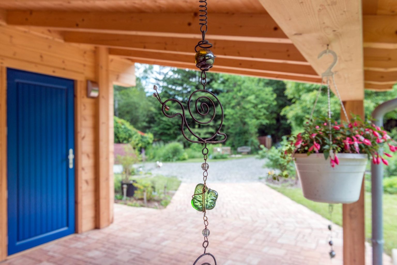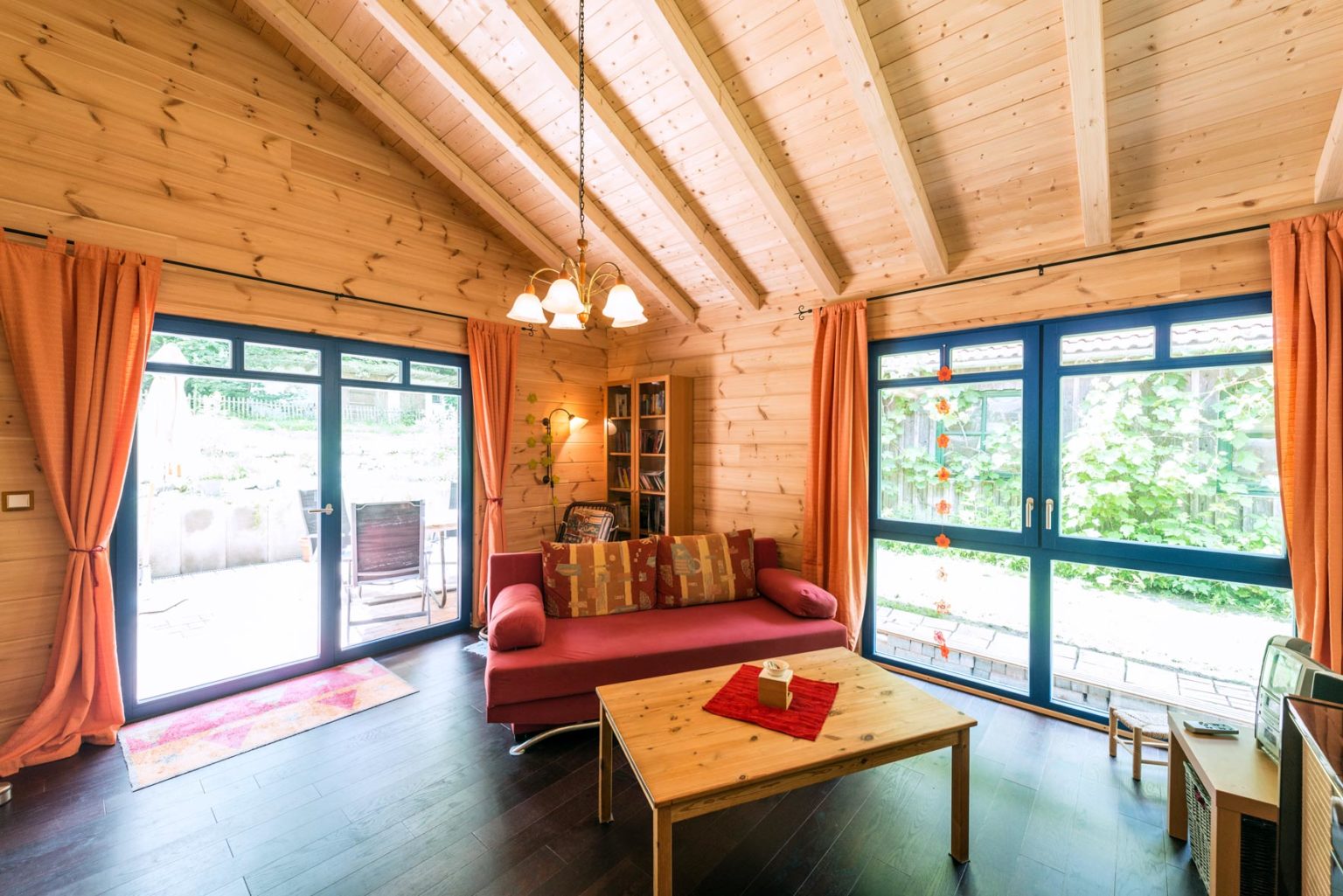 Holzhaus "Casa Appelt" kann entweder durch den Haupteingang unterm Carport betreten werden – so gelangt man immer trockenen Fußes vom Auto ins Haus Vice versa -, oder aber durch die Nebentür zur Küche. Von der eigentlichen Haustür geht es in einen L-Förmigen Flur mit Garderobe und Zugängen ins Gäste-WC, ins Gästezimmer (mit Verbindung zum Technikraum), in die Küche - die mit dem Wohnzimmer verbunden ist -, ins Wohnzimmer, ins Schlafzimmer und ins Badezimmer. Möchte man nicht auf der Terrasse vor dem Haus (vor der Küche) sitzen, wählt man einfach die vom Wohnzimmer aus erreichbare Terrasse hinter dem Gebäude. Das Klima in dem chemisch unbehandelten Holzhaus ist einzigartig und sehr wohltuend, so dass unter den Feriengästen auch häufig Gesundheits-/Fitness- und Yogafreunde zu finden sind. Die eingebaute Fußbodenheizung wird mittels Luftwärmepumpe betrieben und eine solare Warmwasserbereitung und Photovoltaikanlage sind zur Installation vorbereitet. Auch der Anschluss für einen Kaminofen ist schon vorhanden.