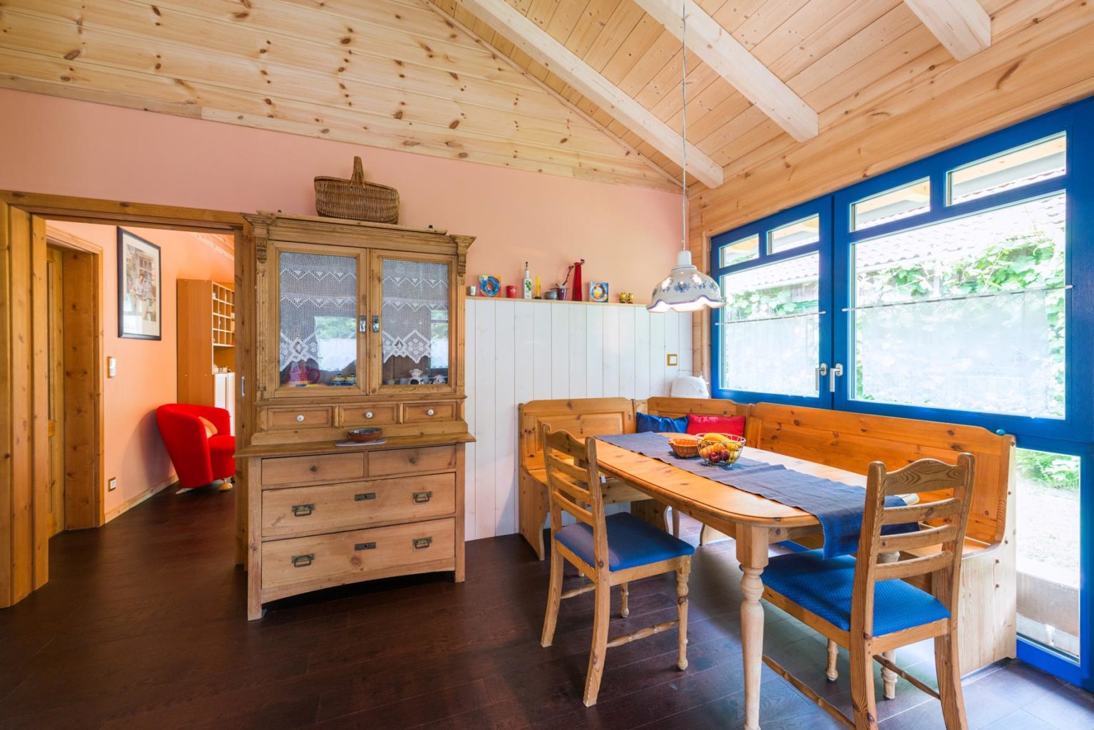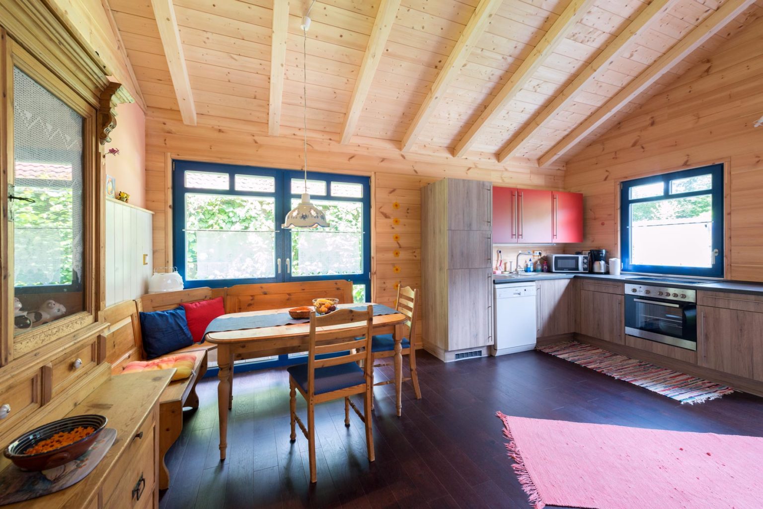 Die einschaligen Blockwände aus Polarkiefernholz wurden außen und innen so behandelt, dass sie garantiert naturhell und schön bleiben. Das gleiche gilt für die offenen Balkendecken und Dachschrägen. Holzhaus "Casa Appelt" ist zur Hälfte bis zum First offen, das bedeutet: in Küche und Wohnzimmer reicht der Luftraum bis zur sichtbaren Firstpfette, während über den anderen Räumen eine Sichtbalkendecke eingezogen ist, über der sich ein Dachboden befindet. So herrscht einerseits ein luftiges Gefühl mit viel Kopffreiheit und andererseits ist genug Platz zum Abstellen und Verstauen vorhanden. Große Fenster - im Wohnzimmer sogar bodentiefe - lassen reichlich natürliches Licht in alle Räume. Außerdem kombinierten die Hauseigentümer weiß tapezierte Trennwände (leichter Ständerbau) zu den naturfarbenen Vollholzwänden um ihr Holzhaus heller und moderner wirken zu lassen.
