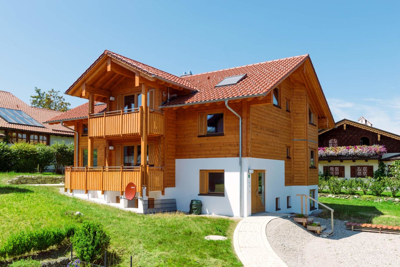 Als fleißiger Bauhelfer machte sich der damals 55 jährige Hausherr von Holzhaus Chiemgau und ein Teil der Familie bei sämtlichen Arbeiten nützlich, neben seinem Beruf! Lediglich für die Zeit der Hausmontage nahm er sich Urlaub um den erfahrenen Richtmeister von Fullwood und die Zimmerleute zu unterstützen. Innerhalb der ersten 5 Tage standen alle Wände, der Dachstuhl war fertig und die Dachschalung angefangen. In den nächsten 5 Tagen wurde das Dach fertig gestellt und eine Bautreppe provisorisch eingebaut. Vor der Hausmontage waren bereits alle Bohrungen zur Erschließung der Wärmequelle (Grundwasserbohrungen), die Erdarbeiten und der Kellerbau abgeschlossen, sodass die Hauswände reibungslos auf die Kellermauern gesetzt werden konnten. Der Innenausbau in Eigenleistung und teils mit Hilfe von Fachhandwerkern zog sich bis das mehrgeschossige Holzhaus nach 1 Jahr bezogen werden konnte. Der Hausherr würde heute nicht mehr neben seinem Beruf selbst bauen wollen, bereut den Holzhausbau mit Fullwood aber nicht. Schließlich hat er sich einen Jugendtraum erfüllt: Ein eigenes Heim zu bauen.