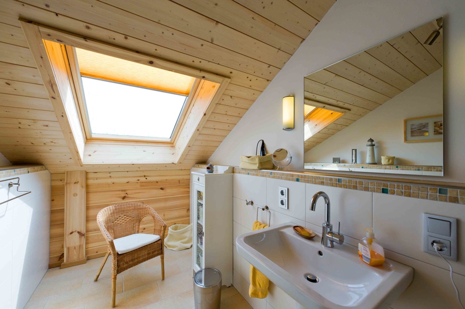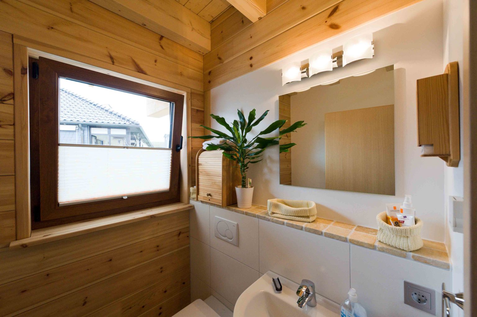 Die sehr dicken Wände von diesem Holzhaus aus massiver, nordischer Kiefer ermöglichen eine noch bessere Energiebilanz, als ihre dünneren Schwestern ohnehin schon aufweisen. Wenn schon sparen, dann bitte schön am richtigen Ende: dem Energieverbrauch. Diese Philosophie setzt sich bei der Ressourcen schonenden Luft-Wärmepumpe fort und inkludiert ebenso die Wasserzisterne im weitläufigen Garten.