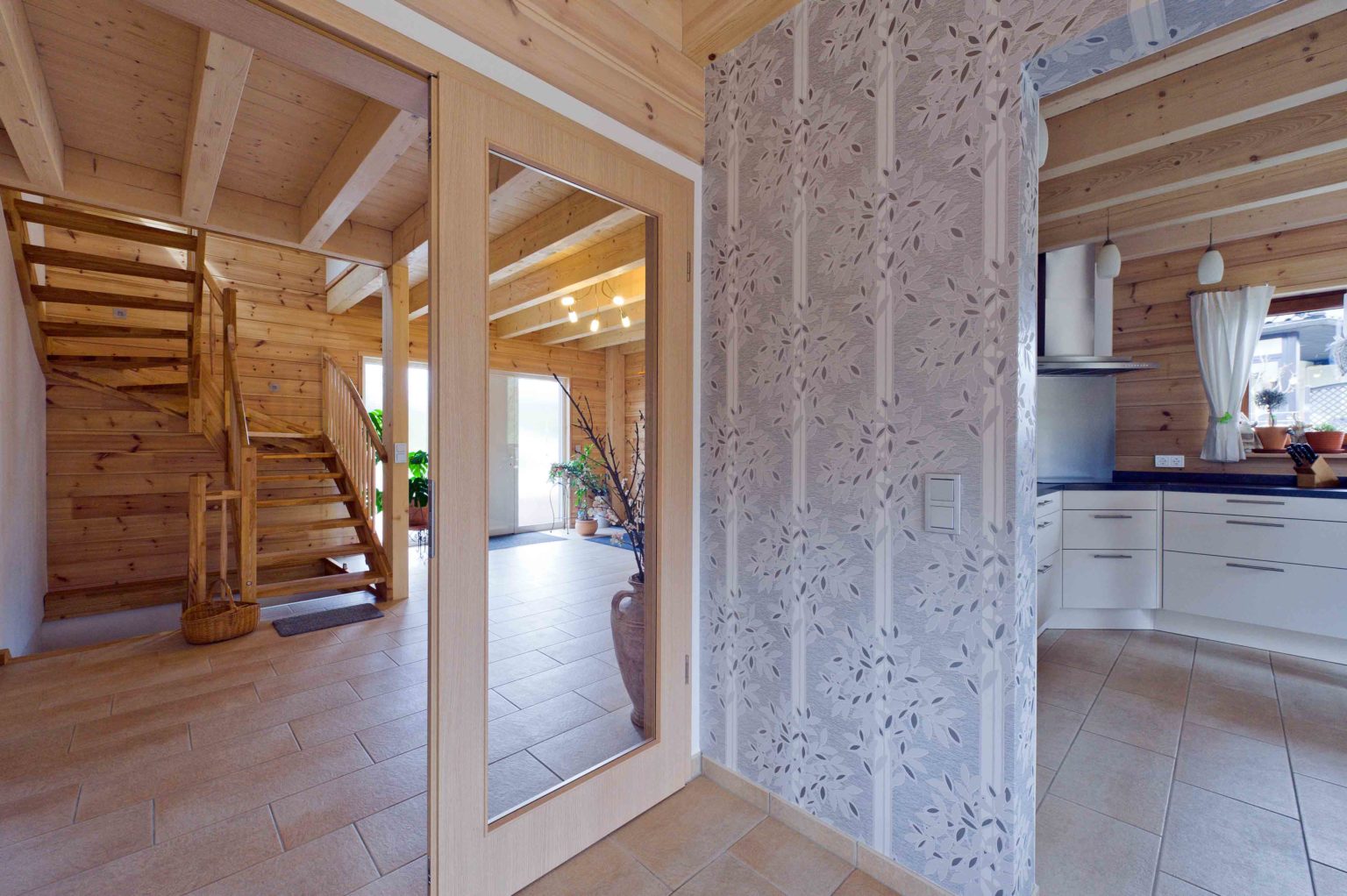 Bei der Gestaltung ihres Holzhauses war den Eigentümern größtmögliche Helligkeit wichtig. Das fängt beim hellen Kiefernholz an, welches durch entsprechende Lasuren vor Nachdunkeln und Vergrauen geschützt wird, setzt sich in den zahlreichen, teils bodentiefen Fensterflächen fort, und geht über helle Fliesenböden weiter bis hin zu hell tapezierten oder weiß verputzten Trennwänden in Ständerbauweise. Die Entscheidung, ein massives Holzhaus zu bauen, fiel eher zufällig, denn ursprünglich wollte der bodenständige Hausherr ganz konventionell Stein auf Stein bauen. Da sich in der Nähe des neu erworbenen Baugrundstücks der Holzhausspezialist Fullwood befindet, fuhr man dort zwangsläufig immer wieder vorbei und besichtigte eines Tages die beiden Musterhäuser und die Werkstatt mehr aus Pflichtgefühl als aus Interesse. Vor Ort breitete sich als dann sofort spontane Begeisterung aus (insbesondere für das ganz moderne und helle, neuere Musterhaus), die auch nach Prüfung der hervorragenden handwerklichen Qualität und der mit Steinhäusern vergleichbaren Wertbeständigkeit anhielt - kurzum: die Kaufentscheidung war gefallen.