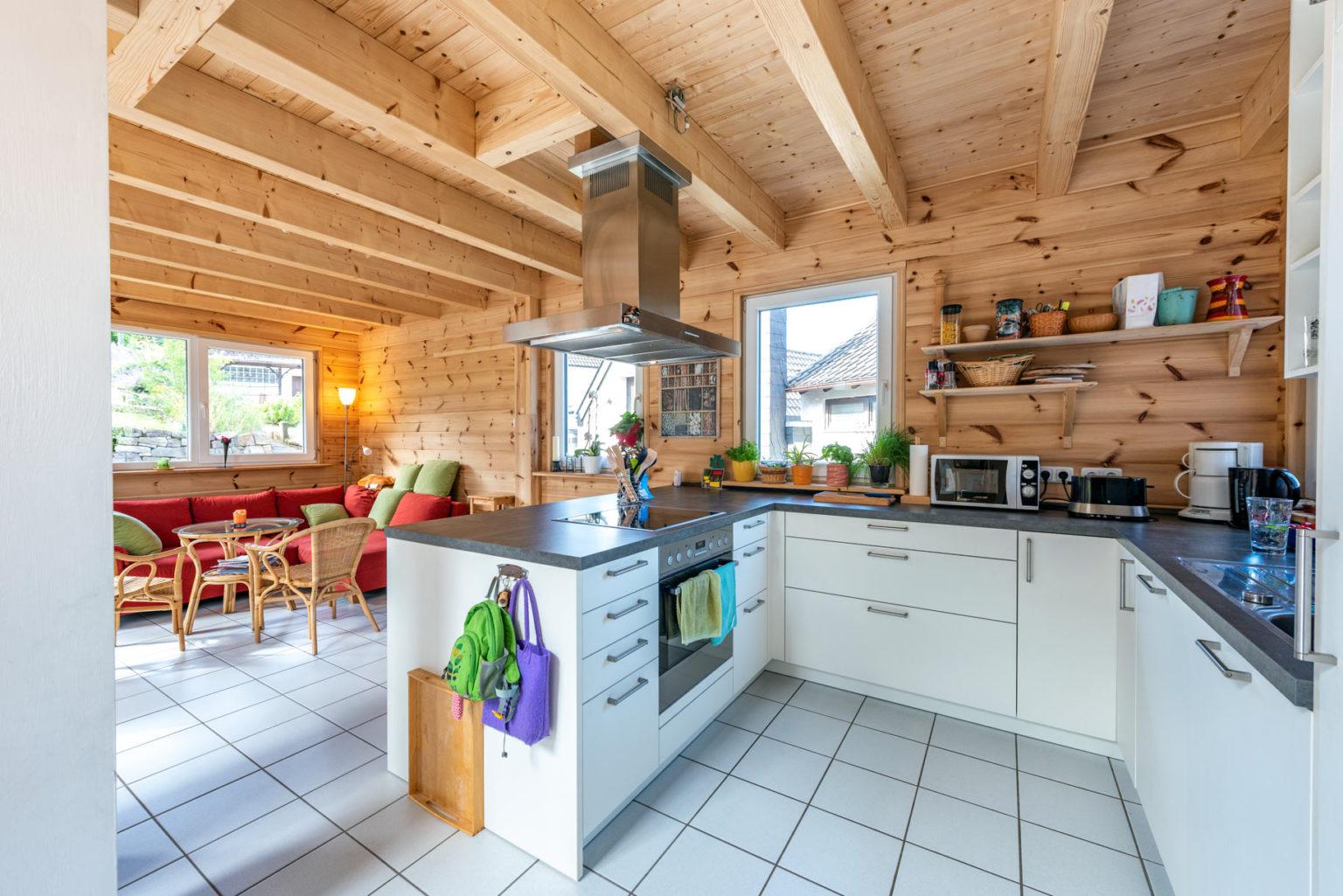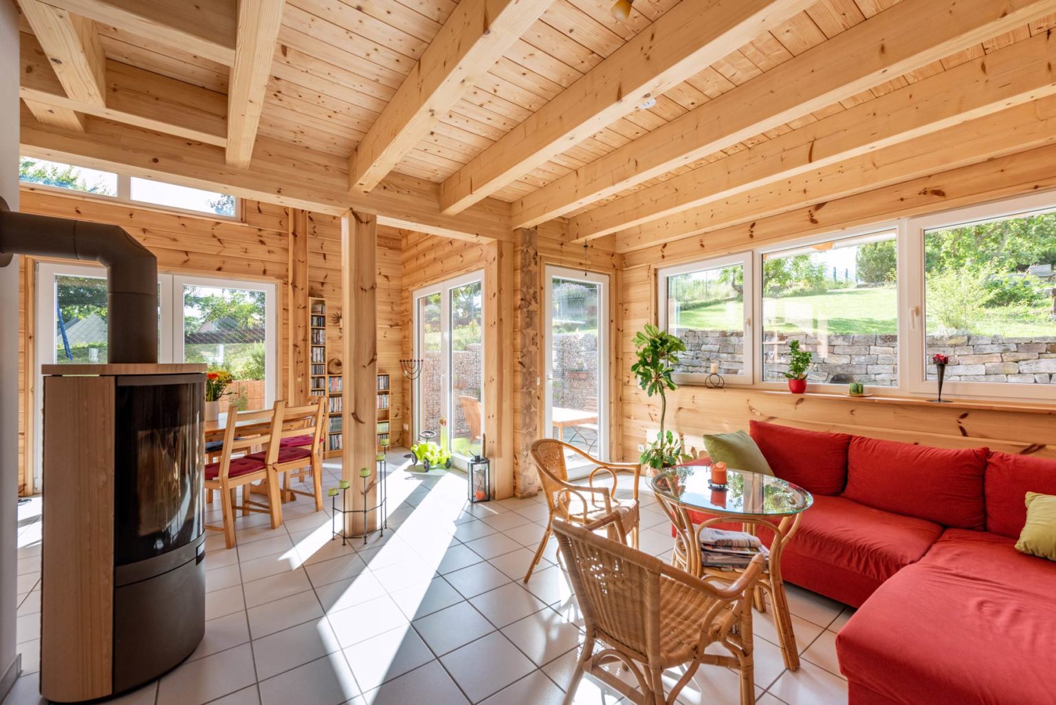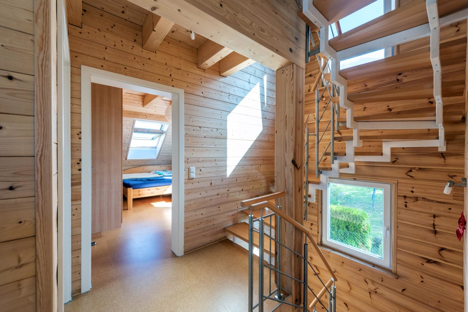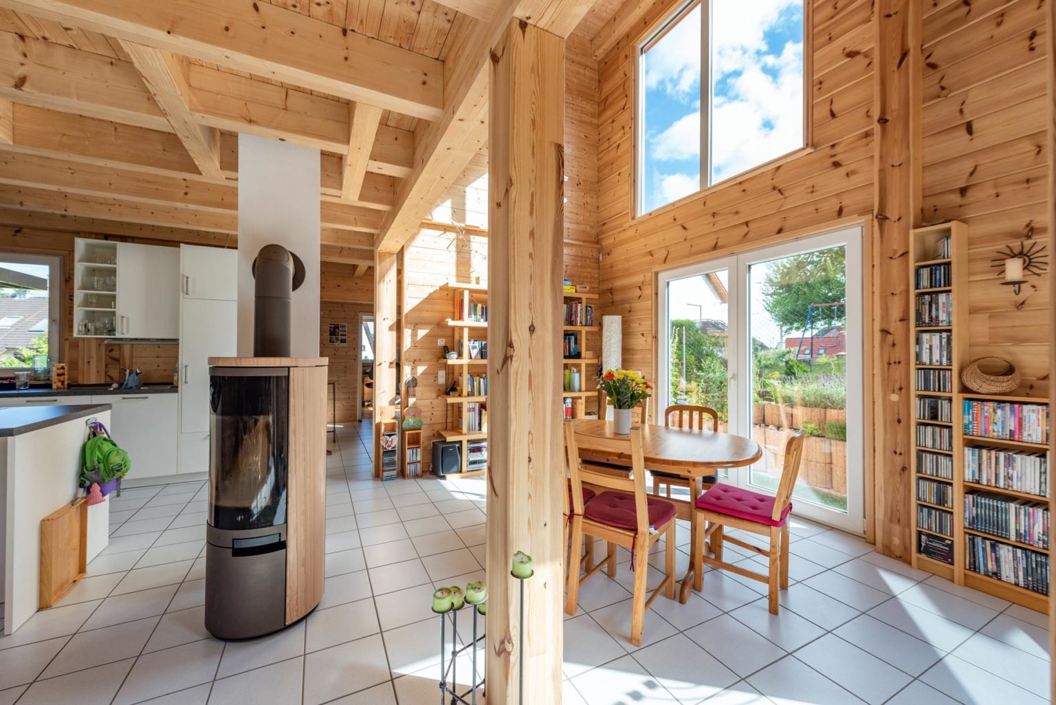 Ungewöhnlich an Holzhaus „an der Haardt“ ist auch, dass das Dach zwei verschiedene Neigungswinkel besitzt: zur Gartenseite sind es 38 Grad und zur Straßenseite steilere 41 Grad. Daraus ergeben sich zwei unterschiedliche Kniestockhöhen, an der steileren Dachseite rund 92cm und unter der flacheren Dachhälfte etwa 30cm. Durch den leicht versetzten Hausgrundriss mit zwei Wandrücksprüngen ist diese charmante "Nicht-Symmetrie" mit bloßem Auge nicht erkennbar und es ergeben sich ein windgeschützter Hauseingang (Straßenaufgang) sowie winkelförmiger Freisitz (Gartenterrasse). Die Polarkiefernholzwände messen 20cm und sind komplett einschalig, also ohne Dämmschicht. Außen wurden sie mit einer etwas dunkleren Wetterschutzlasur gegen Vergrauung behandelt und innen mit durchsichtigem UV-Schutz gegen Nachdunkeln lasiert. Die weißen Fensterrahmen, Rollladenkästen und Haustüre bilden einen schönen Kontrast zur Holzfarbe und zu den anthrazitenen Dachziegeln. Drinnen sind die Kiefernwände naturhell, also heller als außen. Die Eigentümer haben innen komplett auf Holzoptik gesetzt und die Trennwände (leichte Ständebauweise) mit Fichtenholz verschalt. Lediglich in den Nassräumen wurden Wandfliesen als Spritzschutz kombiniert. Weiße Zimmertüren und Bodenfliesen harmonieren mit den Fensterrahmen. Um möglichst helle Räume mit viel natürlichem Lichteinfall zu haben, ließen die Hauseigentümer überall sehr viele Fenster einbauen, zum Garten hin auch bodentiefe. Die chemisch unbehandelten Blockwände verströmen einen zarten Kiefernduft und zaubern Behaglichkeit und ein wohlig warmes Ambiente. Sie sind trotz ihrer nachgewiesenen winddichte „atmungsaktiv“ und bewirken ein wohngesundes Raumklima. Zudem dämmen sie hervorragend, in der Praxis sogar besser als in der Theorie, und zusammen mit der Dachdämmung und den Wärmeschutzfenstern ergibt sich eine wärmeeffiziente Situation. Auch der nachgewiesene psychologische Effekt der höher gefühlten Raumtemperatur in Holzhäusern wirkt sich senkend auf den Heizenergieverbrauch aus. Beheizt wird das Holzhaus mit Fußbodenheizung und Wärmepumpe sowie Kaminofen im Wohnbereich. Ergänzend ist eine Photovoltaikanlage für "saubere" regenerative Energie und geringere Stromkosten im Einsatz.
