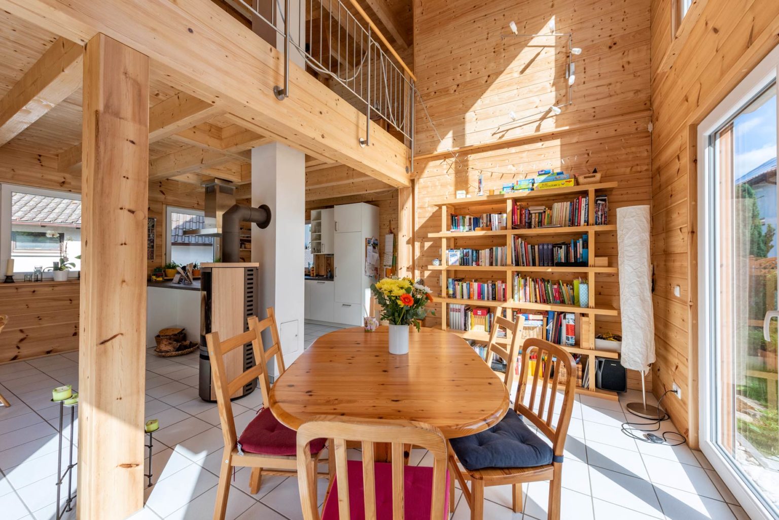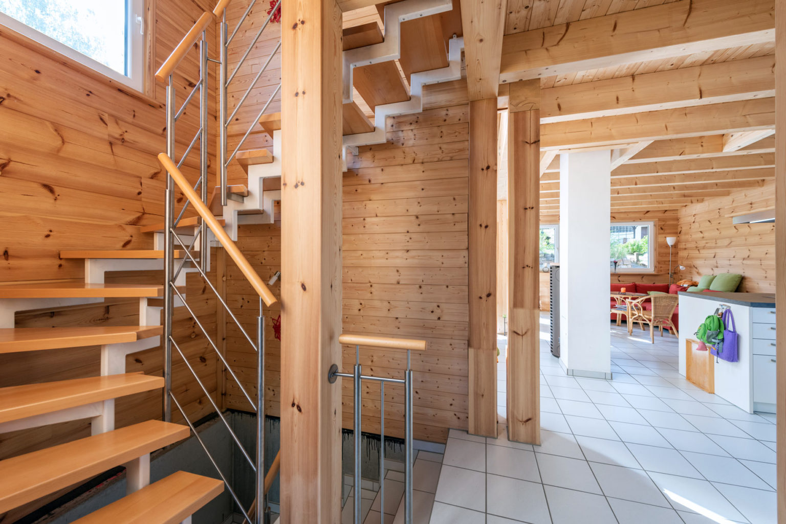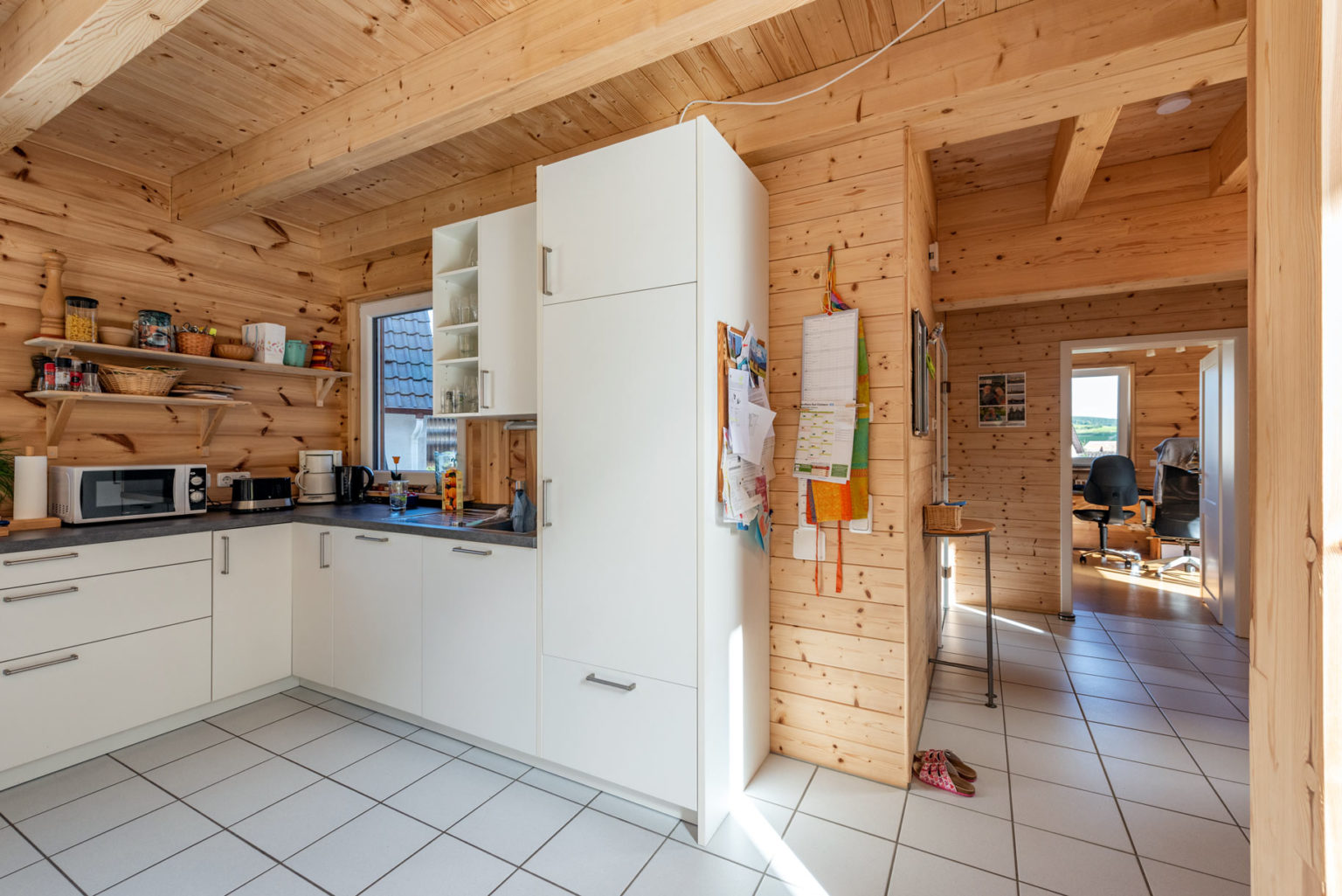 Ungewöhnlich an Holzhaus „an der Haardt“ ist auch, dass das Dach zwei verschiedene Neigungswinkel besitzt: zur Gartenseite sind es 38 Grad und zur Straßenseite steilere 41 Grad. Daraus ergeben sich zwei unterschiedliche Kniestockhöhen, an der steileren Dachseite rund 92cm und unter der flacheren Dachhälfte etwa 30cm. Durch den leicht versetzten Hausgrundriss mit zwei Wandrücksprüngen ist diese charmante "Nicht-Symmetrie" mit bloßem Auge nicht erkennbar und es ergeben sich ein windgeschützter Hauseingang (Straßenaufgang) sowie winkelförmiger Freisitz (Gartenterrasse). Die Polarkiefernholzwände messen 20cm und sind komplett einschalig, also ohne Dämmschicht. Außen wurden sie mit einer etwas dunkleren Wetterschutzlasur gegen Vergrauung behandelt und innen mit durchsichtigem UV-Schutz gegen Nachdunkeln lasiert. Die weißen Fensterrahmen, Rollladenkästen und Haustüre bilden einen schönen Kontrast zur Holzfarbe und zu den anthrazitenen Dachziegeln. Drinnen sind die Kiefernwände naturhell, also heller als außen. Die Eigentümer haben innen komplett auf Holzoptik gesetzt und die Trennwände (leichte Ständebauweise) mit Fichtenholz verschalt. Lediglich in den Nassräumen wurden Wandfliesen als Spritzschutz kombiniert. Weiße Zimmertüren und Bodenfliesen harmonieren mit den Fensterrahmen. Um möglichst helle Räume mit viel natürlichem Lichteinfall zu haben, ließen die Hauseigentümer überall sehr viele Fenster einbauen, zum Garten hin auch bodentiefe. Die chemisch unbehandelten Blockwände verströmen einen zarten Kiefernduft und zaubern Behaglichkeit und ein wohlig warmes Ambiente. Sie sind trotz ihrer nachgewiesenen winddichte „atmungsaktiv“ und bewirken ein wohngesundes Raumklima. Zudem dämmen sie hervorragend, in der Praxis sogar besser als in der Theorie, und zusammen mit der Dachdämmung und den Wärmeschutzfenstern ergibt sich eine wärmeeffiziente Situation. Auch der nachgewiesene psychologische Effekt der höher gefühlten Raumtemperatur in Holzhäusern wirkt sich senkend auf den Heizenergieverbrauch aus. Beheizt wird das Holzhaus mit Fußbodenheizung und Wärmepumpe sowie Kaminofen im Wohnbereich. Ergänzend ist eine Photovoltaikanlage für "saubere" regenerative Energie und geringere Stromkosten im Einsatz.