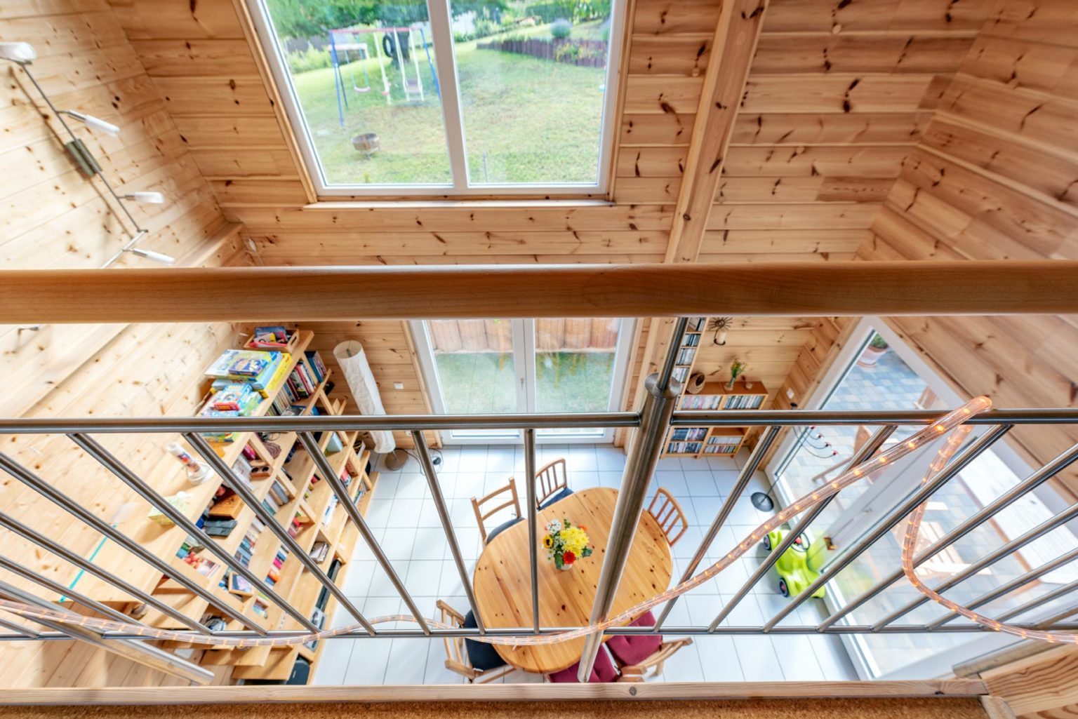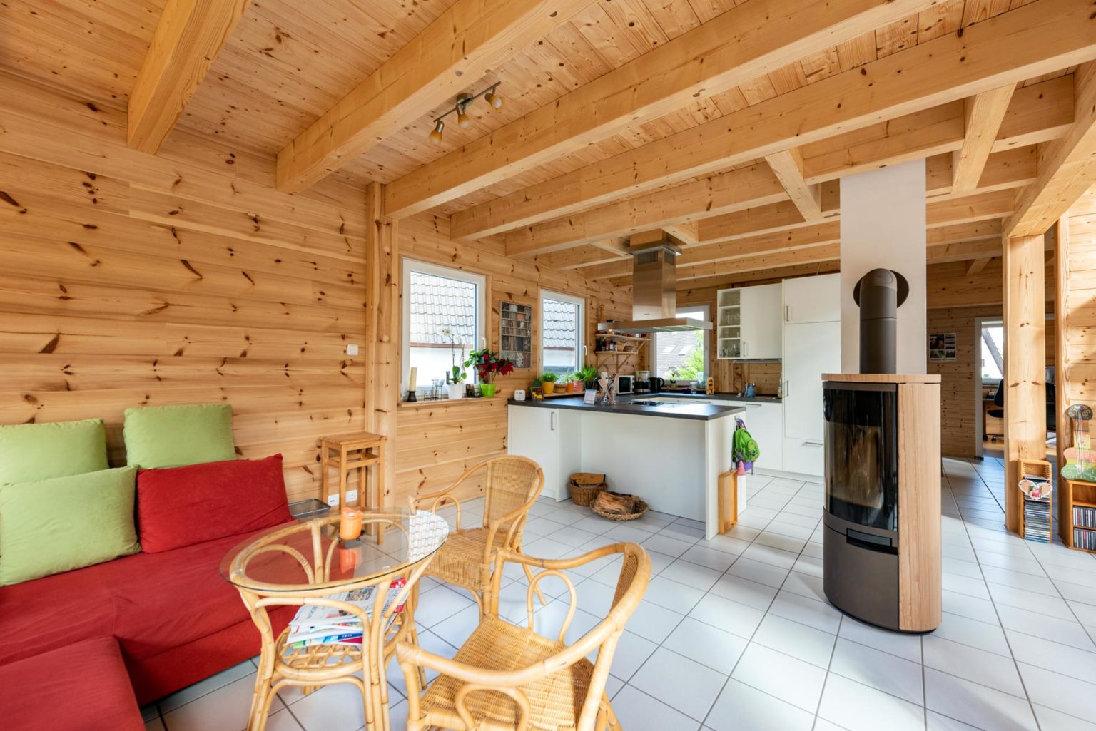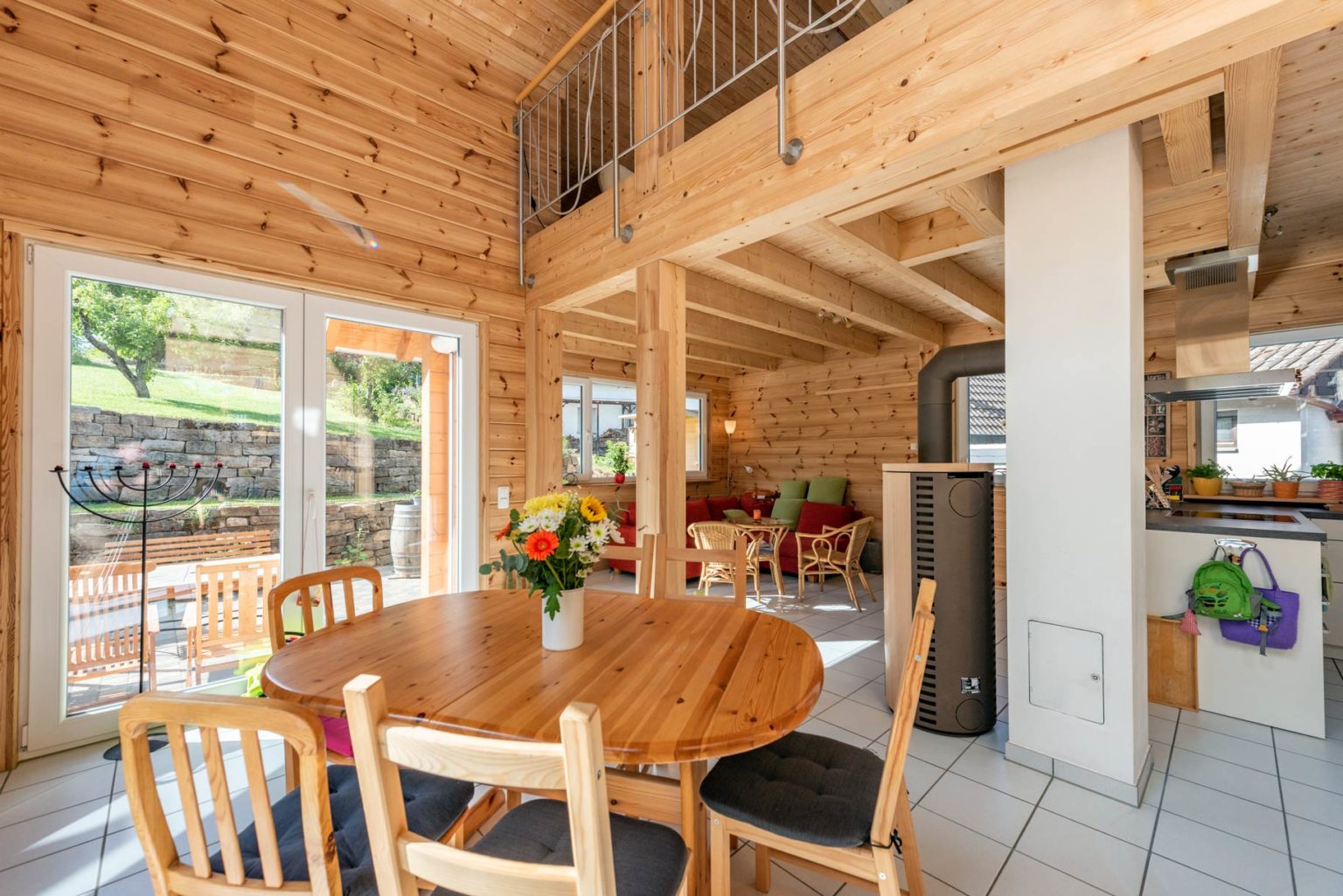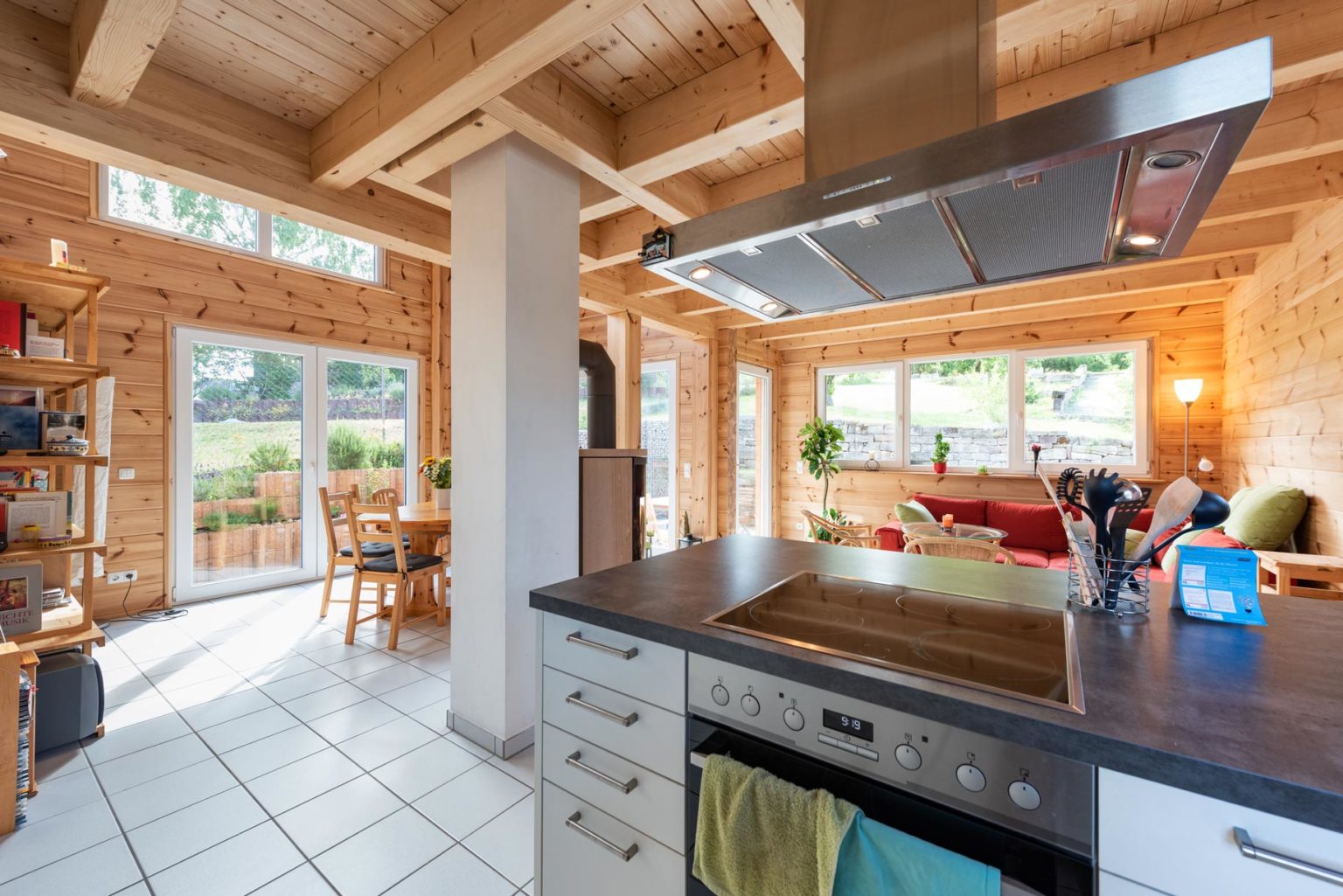 Ungewöhnlich an Holzhaus „an der Haardt“ ist auch, dass das Dach zwei verschiedene Neigungswinkel besitzt: zur Gartenseite sind es 38 Grad und zur Straßenseite steilere 41 Grad. Daraus ergeben sich zwei unterschiedliche Kniestockhöhen, an der steileren Dachseite rund 92cm und unter der flacheren Dachhälfte etwa 30cm. Durch den leicht versetzten Hausgrundriss mit zwei Wandrücksprüngen ist diese charmante "Nicht-Symmetrie" mit bloßem Auge nicht erkennbar und es ergeben sich ein windgeschützter Hauseingang (Straßenaufgang) sowie winkelförmiger Freisitz (Gartenterrasse). Die Polarkiefernholzwände messen 20cm und sind komplett einschalig, also ohne Dämmschicht. Außen wurden sie mit einer etwas dunkleren Wetterschutzlasur gegen Vergrauung behandelt und innen mit durchsichtigem UV-Schutz gegen Nachdunkeln lasiert. Die weißen Fensterrahmen, Rollladenkästen und Haustüre bilden einen schönen Kontrast zur Holzfarbe und zu den anthrazitenen Dachziegeln. Drinnen sind die Kiefernwände naturhell, also heller als außen. Die Eigentümer haben innen komplett auf Holzoptik gesetzt und die Trennwände (leichte Ständebauweise) mit Fichtenholz verschalt. Lediglich in den Nassräumen wurden Wandfliesen als Spritzschutz kombiniert. Weiße Zimmertüren und Bodenfliesen harmonieren mit den Fensterrahmen. Um möglichst helle Räume mit viel natürlichem Lichteinfall zu haben, ließen die Hauseigentümer überall sehr viele Fenster einbauen, zum Garten hin auch bodentiefe. Die chemisch unbehandelten Blockwände verströmen einen zarten Kiefernduft und zaubern Behaglichkeit und ein wohlig warmes Ambiente. Sie sind trotz ihrer nachgewiesenen winddichte „atmungsaktiv“ und bewirken ein wohngesundes Raumklima. Zudem dämmen sie hervorragend, in der Praxis sogar besser als in der Theorie, und zusammen mit der Dachdämmung und den Wärmeschutzfenstern ergibt sich eine wärmeeffiziente Situation. Auch der nachgewiesene psychologische Effekt der höher gefühlten Raumtemperatur in Holzhäusern wirkt sich senkend auf den Heizenergieverbrauch aus. Beheizt wird das Holzhaus mit Fußbodenheizung und Wärmepumpe sowie Kaminofen im Wohnbereich. Ergänzend ist eine Photovoltaikanlage für "saubere" regenerative Energie und geringere Stromkosten im Einsatz.