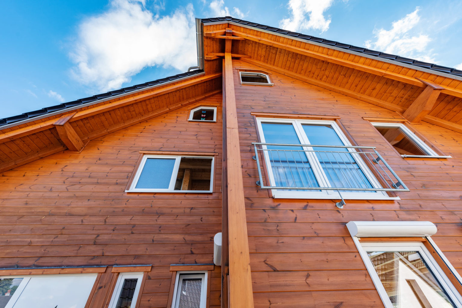 Holzhaus mit Satteldach & unterschiedlichen Neigungswinkeln