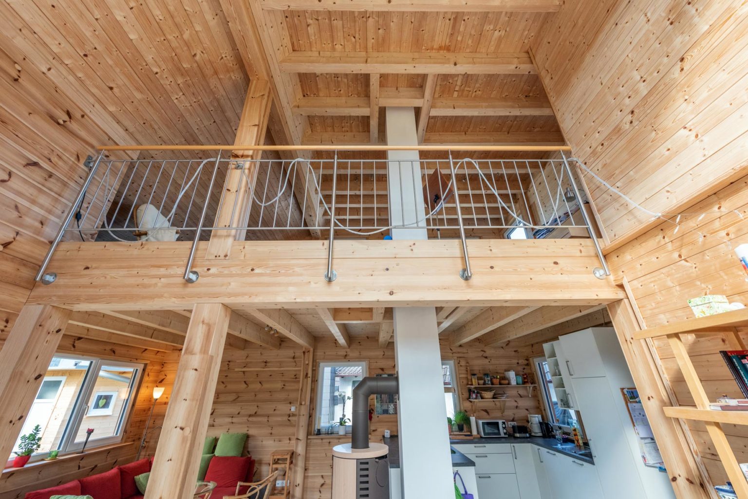 Holzhaus „an der Haardt“ besitzt drei Wohnebenen plus ein betoniertes Untergeschoss mit Garage, auf dem der massive Holzkörper ruht. Ein weitläufiger, in Terrassen angelegter Garten schließt sich an. Strenggenommen hat das Holzhaus eineinhalb Geschosse: Erdgeschoss und Dachgeschoss. Dazu kommt aber noch ein ausgebauter Spitzboden. Auf diese Flächen verteilen sich im Erdgeschoss ein offener Wohnbereich mit Küche, Ess- und Wohnzimmer, ein Gästezimmer, ein Gäste-WC und eine Diele; im Dachgeschoss ein Schlafzimmer, ein Badezimmer und eine große Galerie zum Musizieren; auf dem Spitzboden ein verwinkeltes Kinderzimmer. Die Außenmaße (13,50m x 7,00m) sind aufgrund des Grundstücks und Bebauungsplans ungewöhnlich aber optimal geplant. Über dem Essbereich im Erdgeschoss öffnet sich ein imposanter Luftraum bis zur sichtbaren Mittelpfette (in über 7,40m Höhe), der ein sehr „luftiges“ Raumgefühl mit luxuriöser Kopffreiheit bewirkt und die eindrucksvollen Dachschrägen freilegt. Alle anderen Bereiche und Räume im Holzhaus verfügen über offene Balkendecken mit Raumhöhen von circa 2,70m, die Höhen unter den Schrägen im Dachgeschoss sind natürlich niedriger. Im Kinderzimmer beträgt die maximale lichte Höhe unter der Firstpfette 2,80m.