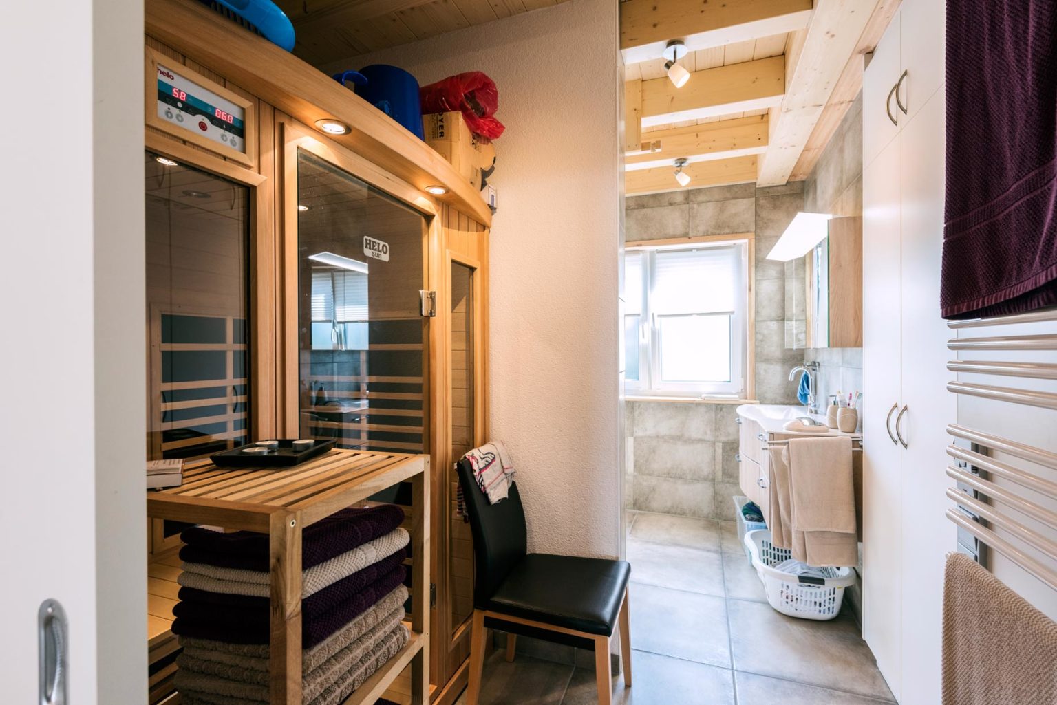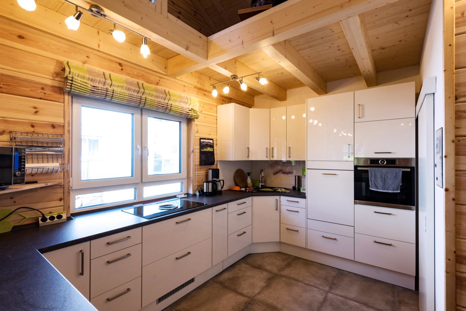 Da der Hauseigentümer auf die Hilfe einer Haushälterin angewiesen ist, besitzt er keine Rollstuhlgerechte Küche mit unterfahrbarem Herd. Trotzdem kann er sich in der Küche bedienen und die Arbeitsplatten benutzen. Was er täglich braucht befindet sich in den Unterschränken. Die (Schiebe-) Türen sind natürlich alle breit genug um flüssig hindurch rollen zu können, ohne sich die Hände einzuklemmen, und das Dusch-Bad ist ganz auf die Bedürfnisse des Hausherrn abgestimmt. Auf die Galerie führt eine senkrechte Sprossenleiter, die aber nur von schwindelfreien Gästen erklommen wird. Musik und Bücher befinden sich oben, sowie Zimmerpflanzen, die von der Haushaltshilfe gegossen werden. Musik hört der Hausbewohner sowieso nur noch über den Computer und liest auch am Bildschirm. Der Technikraum ist sowohl von außen (Carport) als auch von der Toilette zu betreten. Der Abstellraum ist der Küche angeschlossen und bietet Platz für Getränkekästen, Vorräte und unansehnliche aber notwendige Gegenstände. Alle Böden sind mit den gleichen, pflegeleichten und abriebfesten Fliesen ausgestattet. Dank seiner großflächigen, solaren Photovoltaikanlage mit 6 KW Akkuspeicher ist Holzhaus "an der Jagst" unabhängig von schwankenden Energiepreisen und erzeugt selbst grünen Strom für die Luft/Wärmepumpe und sämtliche benötigte Elektrogeräte. Neben der Fußbodenheizung, die von der Wärmepumpe abhängt, kommt auch ein dekorativer Pelletsofen im Wohnbereich zum Einsatz. Seine Strahlungswärme ist besonders behaglich und in den Übergangszeiten schnell verfügbar. Die sehr gut dämmenden Blockwände von Holzhaus an der Jagst wärmen aber auch so, da sie eine gefühlt höhere Temperatur bewirken. Die 2-3 Grad höher gefühlte Raumtemperatur spart Heizenergie und reduziert auch auf diese Weise die Betriebskosten. Die Kiefernwände (aus skandinavischem Polarkiefernholz) sind setzungsfrei, also wartungsfrei, und absolut winddicht. Ihre schlichte, glatte, naturhelle Optik gefällt dem Hausbesitzer besonders gut, und wenn es um das angenehme Raumklima seines Hauses und den zart wahrnehmbaren Kiefernduft geht, gerät er voll und ganz ins Schwärmen. Damit die Wände naturhell bleiben, wurden sie mit UV-Schutz vorm Nachdunkeln bewahrt und außen wetterschützend lasiert.