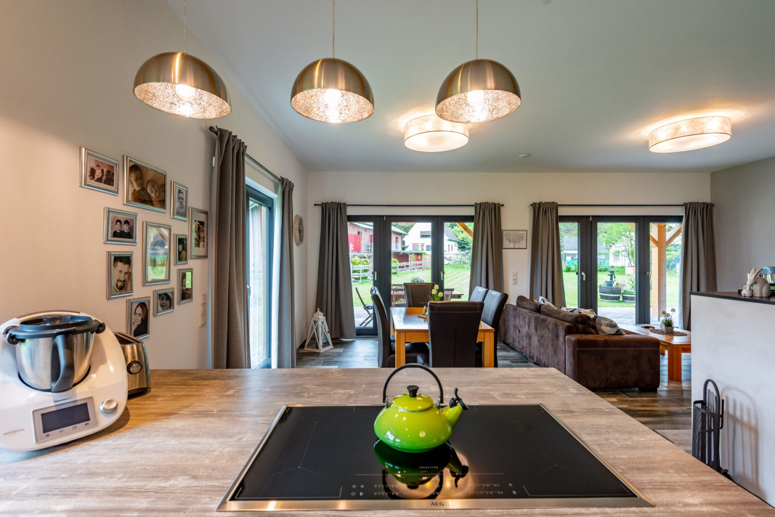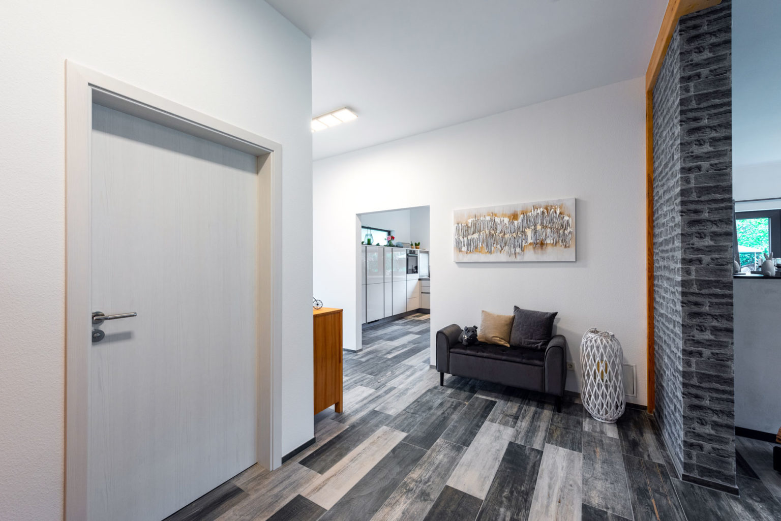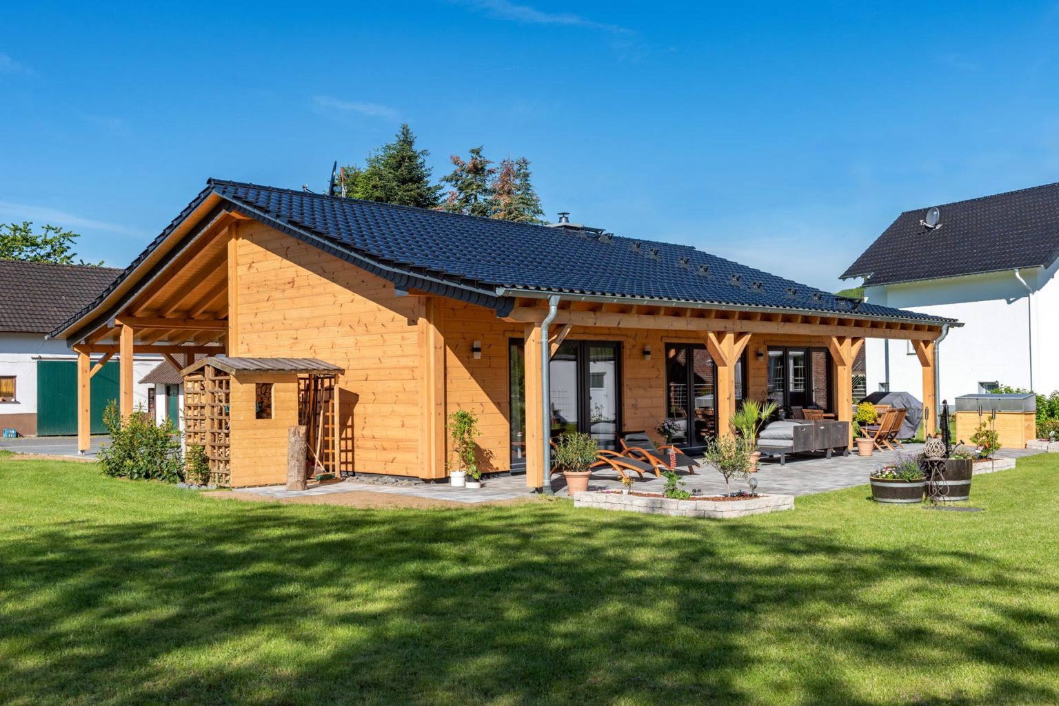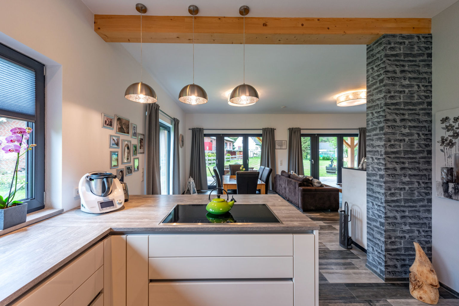 „Da unser erwachsener Sohn schon ausgezogen ist, haben wir unseren Bungalow für zwei Personen geplant. Neben einem großen, offenen Wohnbereich ist uns Barrierefreiheit sehr wichtig, denn wir werden auch nicht jünger.“, umreißt die Hausherrin grob das Konzept. Außerdem sollte Holzhaus „an der Siegschleife“ äußerlich an ein Holzhaus im amerikanischen Farmhouse-Stil erinnern, innen aber fast ohne Holz auskommen. Das relativ flach geneigte Satteldach ist auf beiden Traufseiten weit abgeschleppt und dient als Schattenspender. An der Straßenfront befindet sich eine mit Holz umzäunte Veranda, während zum Garten eine offene Terrasse verwirklicht wurde. Auf beiden lässt es sich auch bei Sommerregen geschützt sitzen. Passend zu den anthrazitfarbenen Tondachziegeln suchten die Hauseigentümer Fensterrahmen und Haustüre in identischer Farbe aus. Der gut 100m² Wohnfläche umfassende Hausgrundriss entspricht der Form eines Rechtecks mit überdachter Aussparung für einen Carport an der Nord-Ost Ecke. Von dort geht es direkt in den Hauswirtschaftsraum, so dass man immer trockenen Fußes vom Auto ins Haus gelangt und kurze Wege zum Transport von Einkäufen hat. Der eigentliche Hauseingang befindet sich auf der Veranda (Nordseite) und führt in eine geräumige, zum Wohnbereich hin offene, L-förmige Diele. Von hier geht es in drei separierte Räume (Badezimmer, Hauswirtschaftsraum und Schlafzimmer) und je ein Durchgang führt links in die Küche und geradeaus ins Wohnzimmer. Zusammen mit dem Essbereich bilden diese den ebenfalls L-förmigen Wohnbereich.