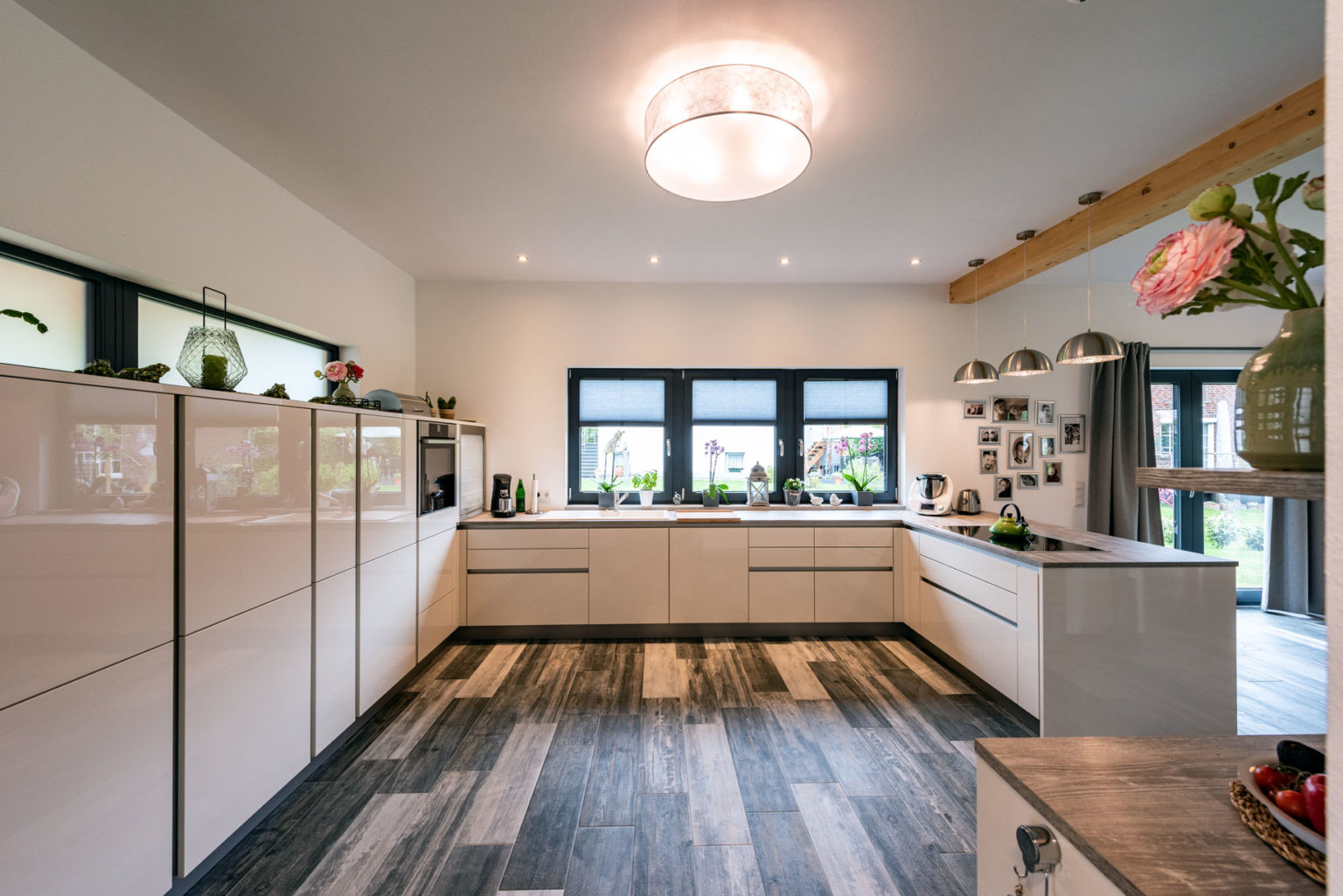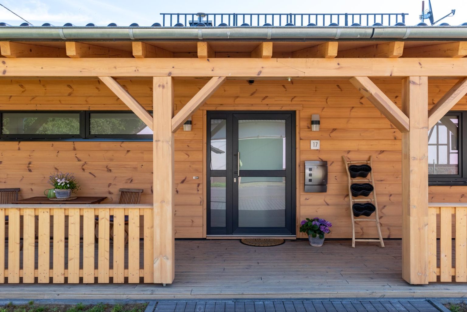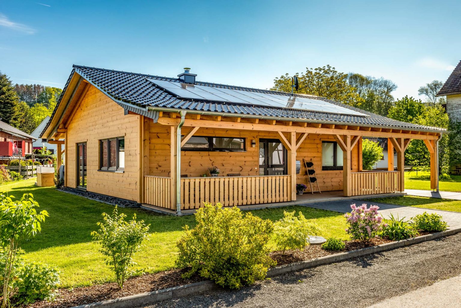 „Da unser erwachsener Sohn schon ausgezogen ist, haben wir unseren Bungalow für zwei Personen geplant. Neben einem großen, offenen Wohnbereich ist uns Barrierefreiheit sehr wichtig, denn wir werden auch nicht jünger.“, umreißt die Hausherrin grob das Konzept. Außerdem sollte Holzhaus „an der Siegschleife“ äußerlich an ein Holzhaus im amerikanischen Farmhouse-Stil erinnern, innen aber fast ohne Holz auskommen. Das relativ flach geneigte Satteldach ist auf beiden Traufseiten weit abgeschleppt und dient als Schattenspender. An der Straßenfront befindet sich eine mit Holz umzäunte Veranda, während zum Garten eine offene Terrasse verwirklicht wurde. Auf beiden lässt es sich auch bei Sommerregen geschützt sitzen. Passend zu den anthrazitfarbenen Tondachziegeln suchten die Hauseigentümer Fensterrahmen und Haustüre in identischer Farbe aus. Der gut 100m² Wohnfläche umfassende Hausgrundriss entspricht der Form eines Rechtecks mit überdachter Aussparung für einen Carport an der Nord-Ost Ecke. Von dort geht es direkt in den Hauswirtschaftsraum, so dass man immer trockenen Fußes vom Auto ins Haus gelangt und kurze Wege zum Transport von Einkäufen hat. Der eigentliche Hauseingang befindet sich auf der Veranda (Nordseite) und führt in eine geräumige, zum Wohnbereich hin offene, L-förmige Diele. Von hier geht es in drei separierte Räume (Badezimmer, Hauswirtschaftsraum und Schlafzimmer) und je ein Durchgang führt links in die Küche und geradeaus ins Wohnzimmer. Zusammen mit dem Essbereich bilden diese den ebenfalls L-förmigen Wohnbereich.