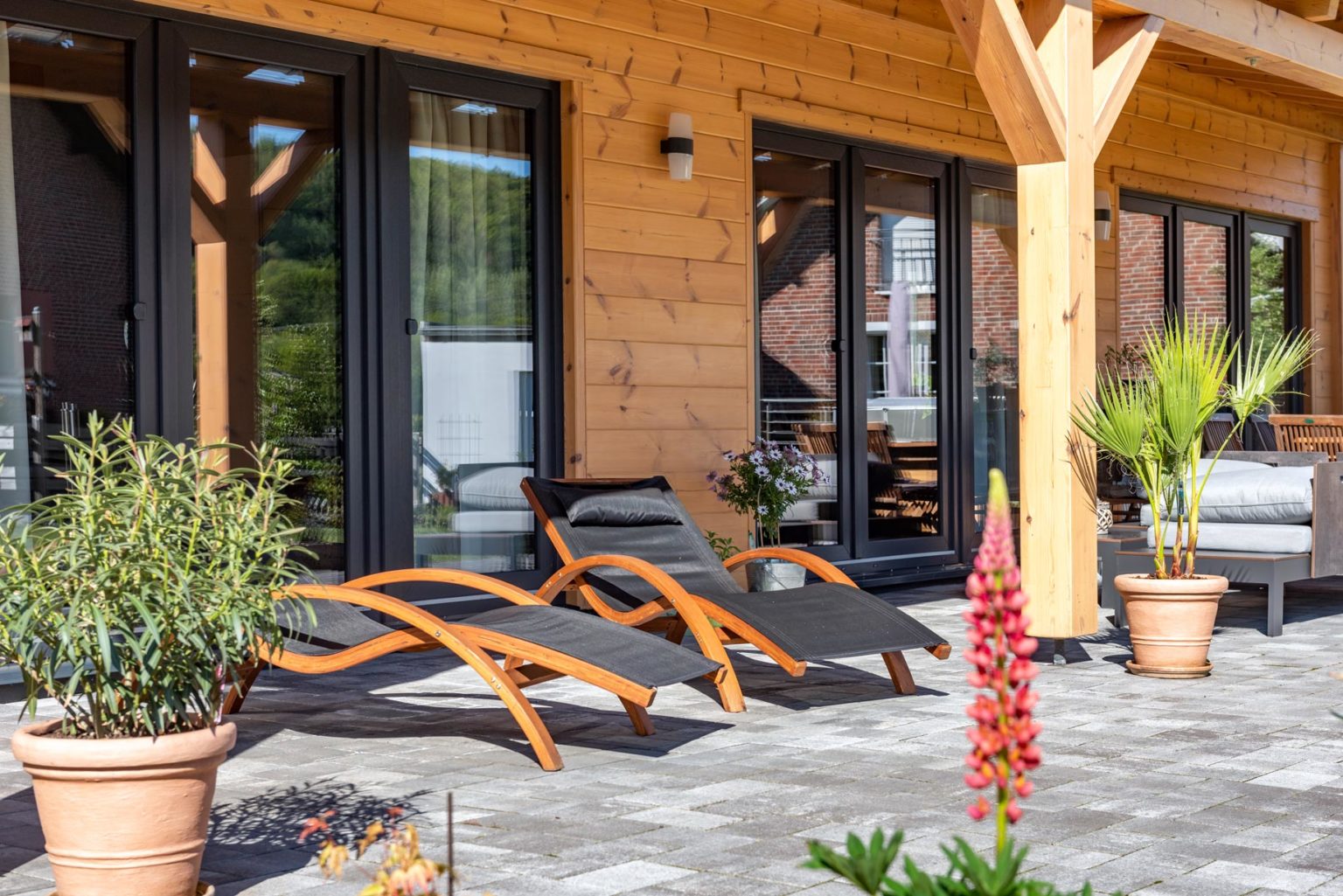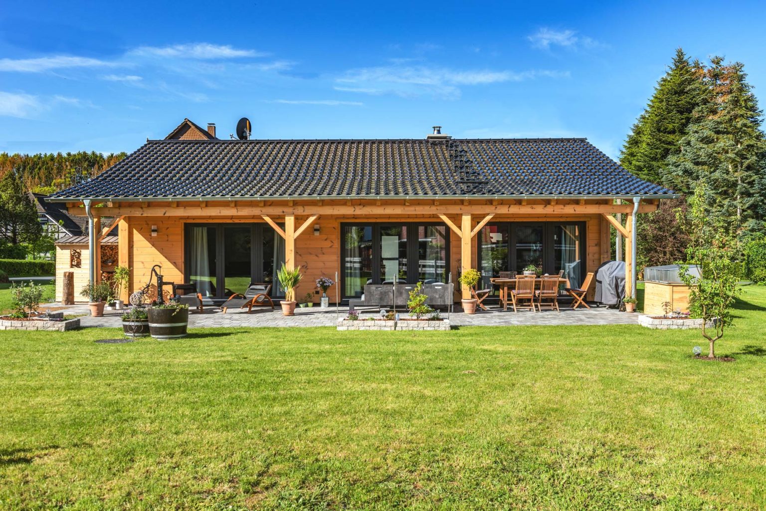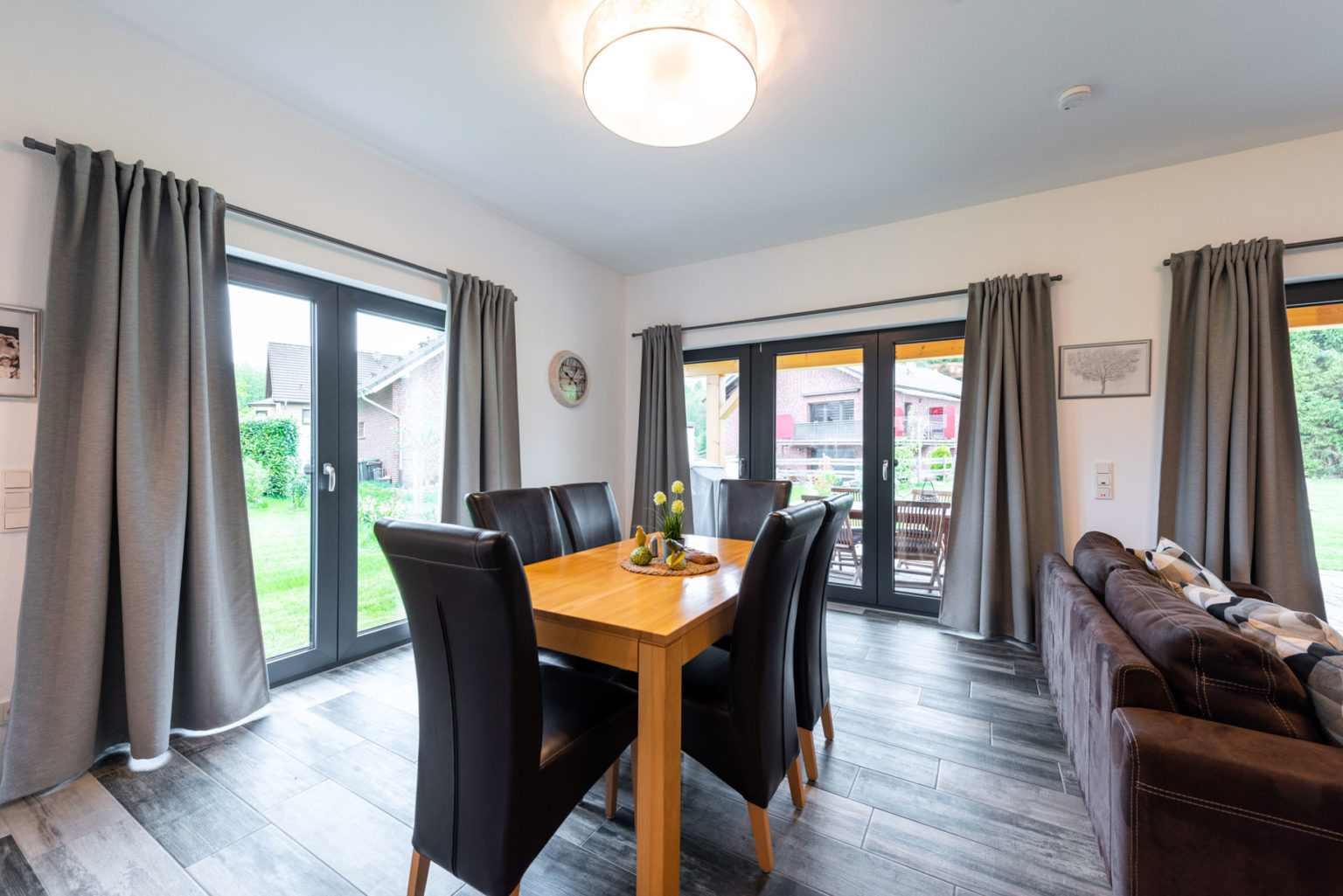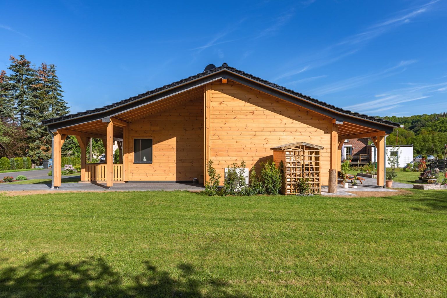 „Da unser erwachsener Sohn schon ausgezogen ist, haben wir unseren Bungalow für zwei Personen geplant. Neben einem großen, offenen Wohnbereich ist uns Barrierefreiheit sehr wichtig, denn wir werden auch nicht jünger.“, umreißt die Hausherrin grob das Konzept. Außerdem sollte Holzhaus „an der Siegschleife“ äußerlich an ein Holzhaus im amerikanischen Farmhouse-Stil erinnern, innen aber fast ohne Holz auskommen. Das relativ flach geneigte Satteldach ist auf beiden Traufseiten weit abgeschleppt und dient als Schattenspender. An der Straßenfront befindet sich eine mit Holz umzäunte Veranda, während zum Garten eine offene Terrasse verwirklicht wurde. Auf beiden lässt es sich auch bei Sommerregen geschützt sitzen. Passend zu den anthrazitfarbenen Tondachziegeln suchten die Hauseigentümer Fensterrahmen und Haustüre in identischer Farbe aus. Der gut 100m² Wohnfläche umfassende Hausgrundriss entspricht der Form eines Rechtecks mit überdachter Aussparung für einen Carport an der Nord-Ost Ecke. Von dort geht es direkt in den Hauswirtschaftsraum, so dass man immer trockenen Fußes vom Auto ins Haus gelangt und kurze Wege zum Transport von Einkäufen hat. Der eigentliche Hauseingang befindet sich auf der Veranda (Nordseite) und führt in eine geräumige, zum Wohnbereich hin offene, L-förmige Diele. Von hier geht es in drei separierte Räume (Badezimmer, Hauswirtschaftsraum und Schlafzimmer) und je ein Durchgang führt links in die Küche und geradeaus ins Wohnzimmer. Zusammen mit dem Essbereich bilden diese den ebenfalls L-förmigen Wohnbereich.