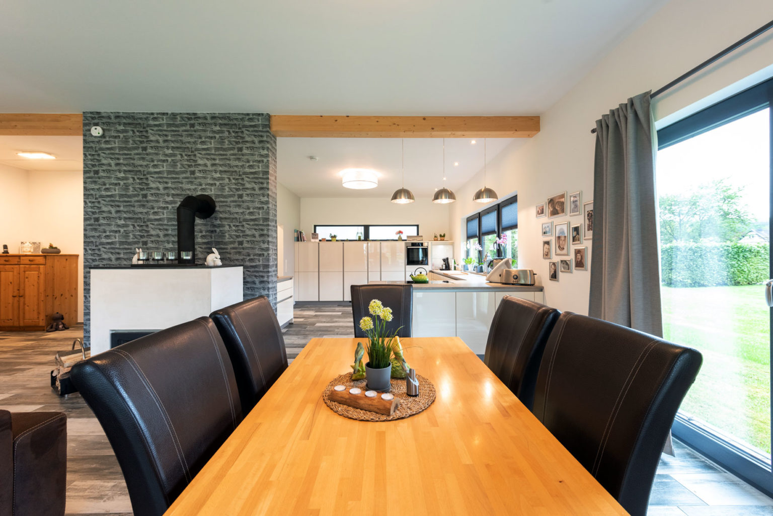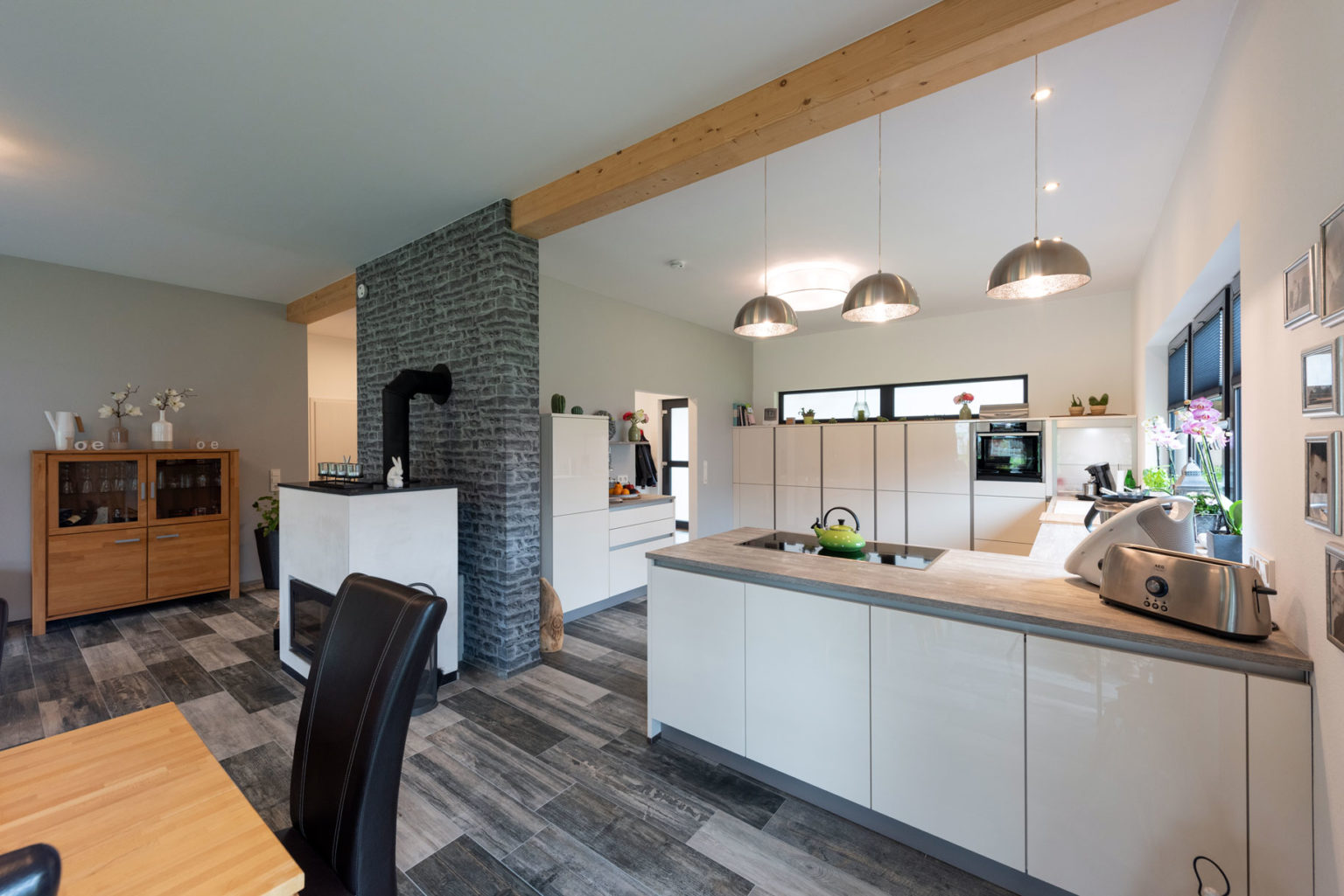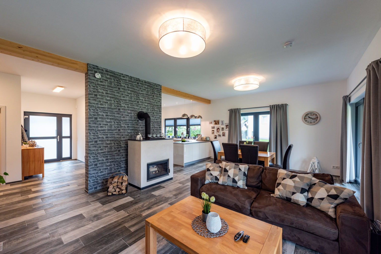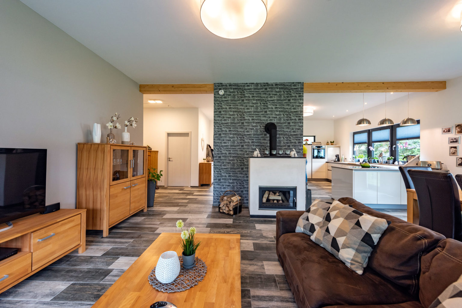Bis auf einen mittig unterm First über die gesamte Hauslänge verlaufenden Deckenbalken und einige Möbel wurde auf sichtbares Holz im Haus verzichtet. Weiß oder hellgrau gestrichene Wände, weiß gestrichene Zimmerdecken, eine grau verklinkerte Kaminwand und grau-weiße Bodenfliesen dominieren das Hausinnere. Zahlreiche, größtenteils bodentiefe Fenster lassen reichlich natürliches Licht herein und sorgen für ein sehr helles Ambiente. „Wir heizen zu 90 Prozent mit unserem Grundofen, den wir mit Holzscheiten füttern. Der speichert bis zu 24 Stunden nach. Unsere Fußbodenheizung nutzen wir hauptsächlich für schnelle Wärme. Sie wird mit einer modernen Wärmepumpe betrieben.“, erklärt Diana Lüttger. Außerdem verfügt Holzhaus „an der Siegschleife“ über eine Photovoltaikanlage mit Stromspeicher (Batterie), die den gesamten Strombedarf des Gebäudes erzeugt. Anfallender Überschuss wird einfach ins Netz gespeist. Darüber hinaus gibt es eine Regenwasserzisterne, die derzeit noch ausschließlich den Garten mit Wasser versorgt, jedoch bereits zur Hausnutzung (WC und Waschmaschine) vorbereitet ist. „Wir merken sowohl vom Wohnklima als auch von der Wärmedämmung einen erheblichen Unterschied zu dem Steinhaus, in dem wir vorher wohnten! Hier kühlt es im Winter drinnen nie ganz aus und auch die Sommerhitze hat keine Chance alles aufzuheizen.“, schwärmen Diana und Frank Lüttger.