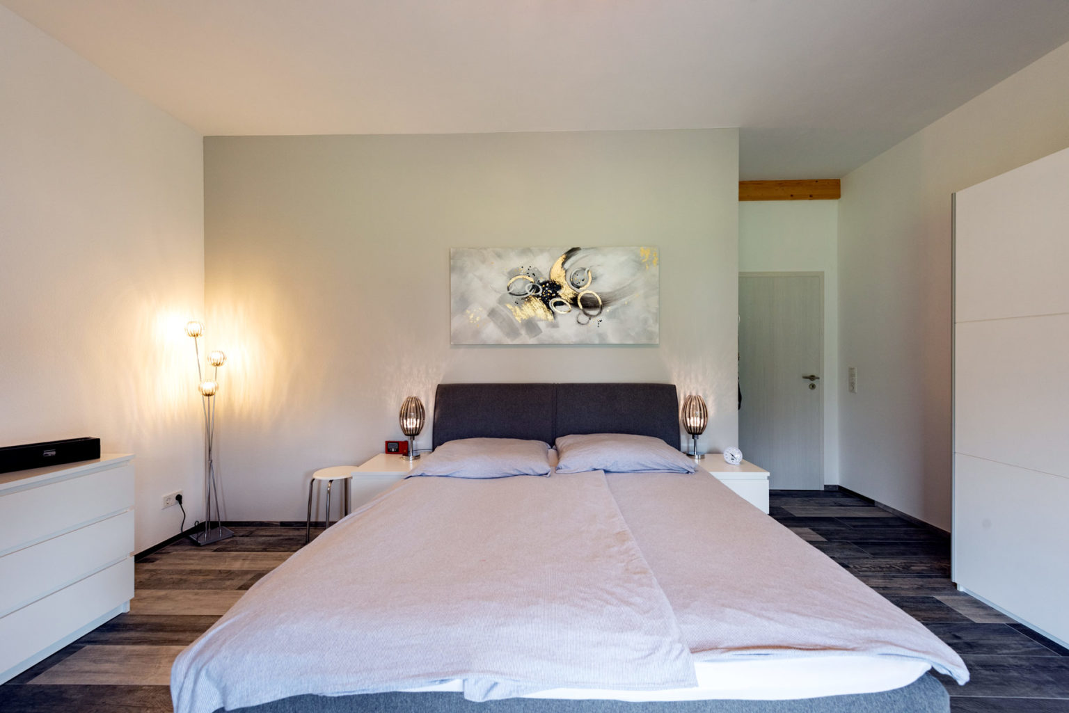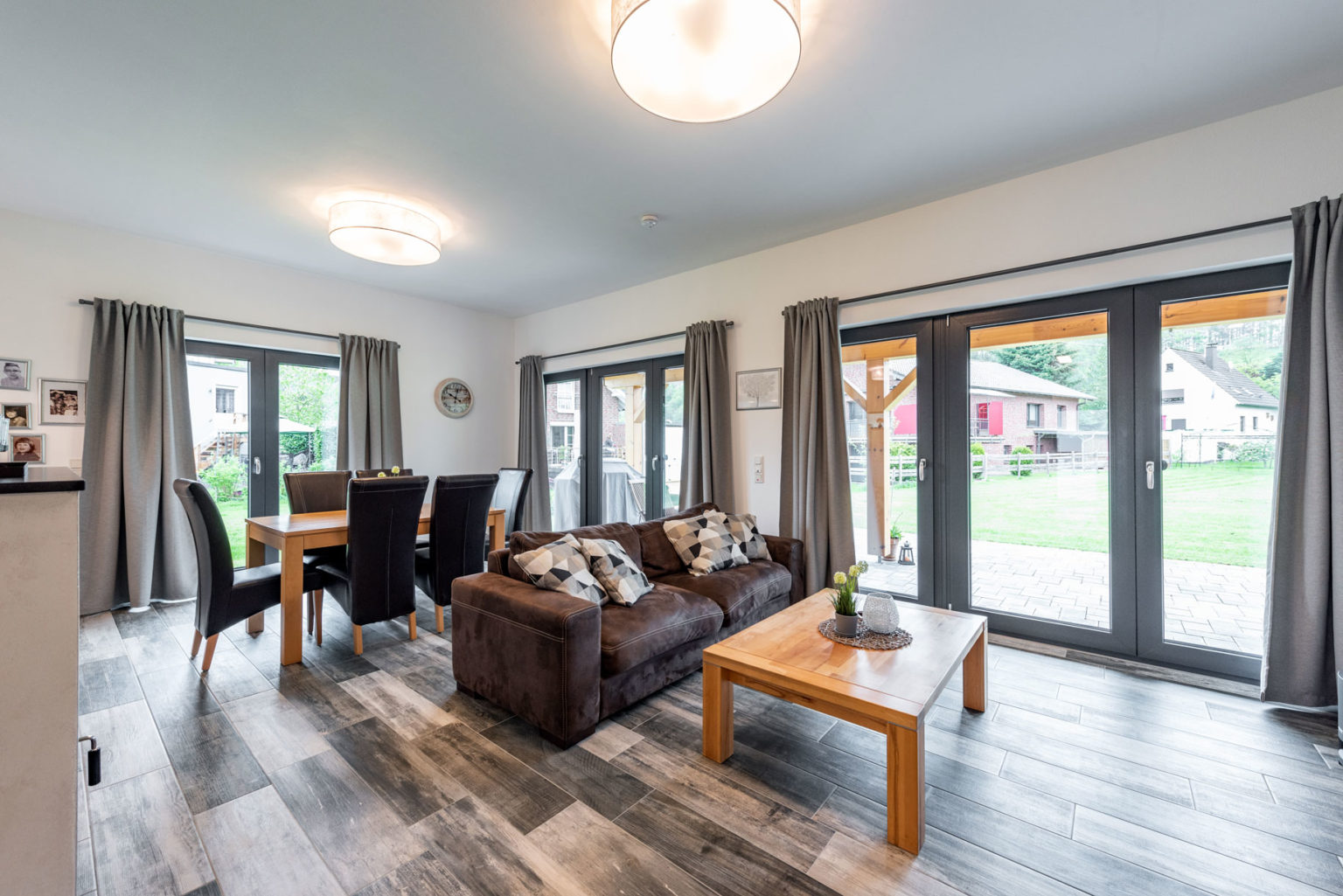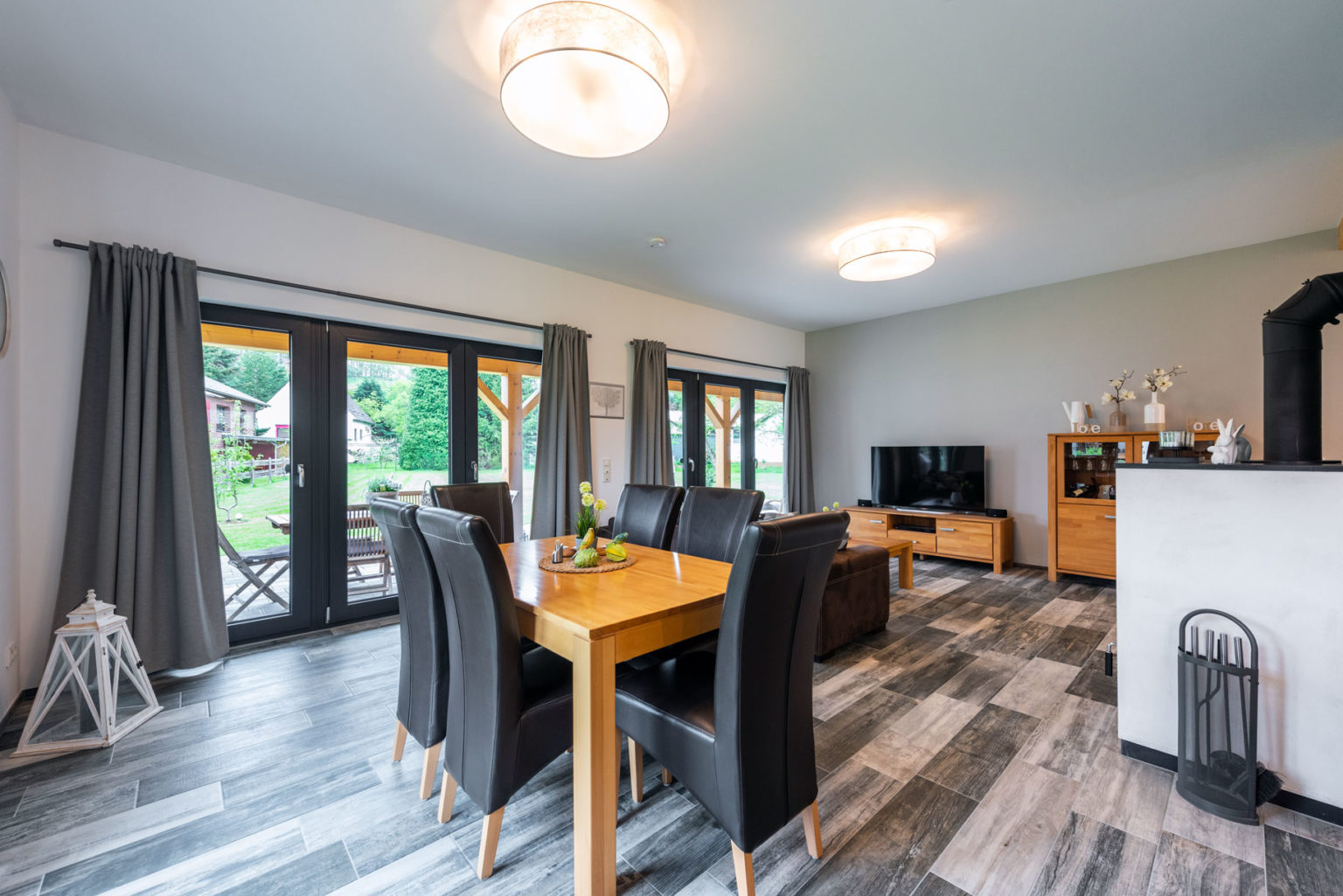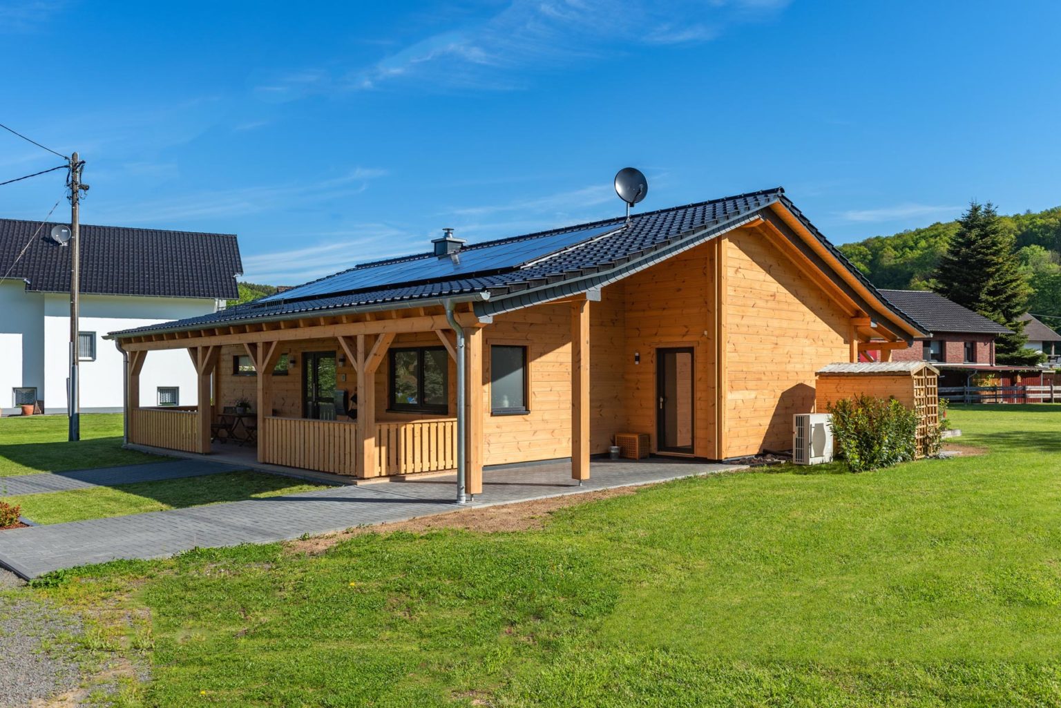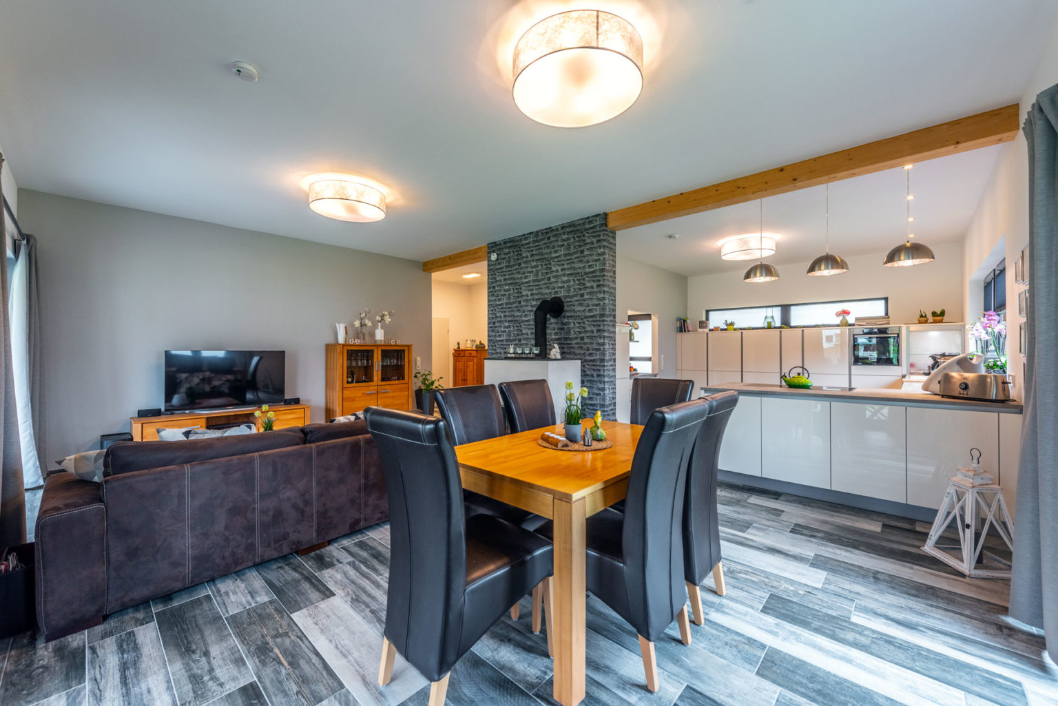 Bis auf einen mittig unterm First über die gesamte Hauslänge verlaufenden Deckenbalken und einige Möbel wurde auf sichtbares Holz im Haus verzichtet. Weiß oder hellgrau gestrichene Wände, weiß gestrichene Zimmerdecken, eine grau verklinkerte Kaminwand und grau-weiße Bodenfliesen dominieren das Hausinnere. Zahlreiche, größtenteils bodentiefe Fenster lassen reichlich natürliches Licht herein und sorgen für ein sehr helles Ambiente. „Wir heizen zu 90 Prozent mit unserem Grundofen, den wir mit Holzscheiten füttern. Der speichert bis zu 24 Stunden nach. Unsere Fußbodenheizung nutzen wir hauptsächlich für schnelle Wärme. Sie wird mit einer modernen Wärmepumpe betrieben.“, erklärt Diana Lüttger. Außerdem verfügt Holzhaus „an der Siegschleife“ über eine Photovoltaikanlage mit Stromspeicher (Batterie), die den gesamten Strombedarf des Gebäudes erzeugt. Anfallender Überschuss wird einfach ins Netz gespeist. Darüber hinaus gibt es eine Regenwasserzisterne, die derzeit noch ausschließlich den Garten mit Wasser versorgt, jedoch bereits zur Hausnutzung (WC und Waschmaschine) vorbereitet ist. „Wir merken sowohl vom Wohnklima als auch von der Wärmedämmung einen erheblichen Unterschied zu dem Steinhaus, in dem wir vorher wohnten! Hier kühlt es im Winter drinnen nie ganz aus und auch die Sommerhitze hat keine Chance alles aufzuheizen.“, schwärmen Diana und Frank Lüttger.