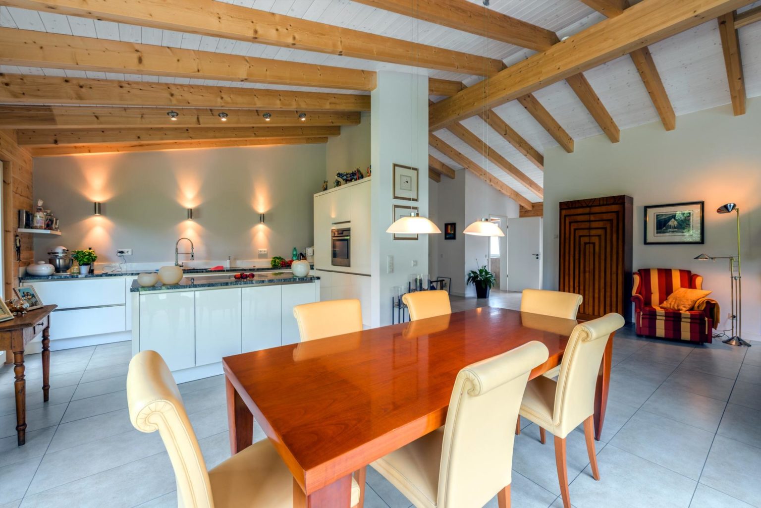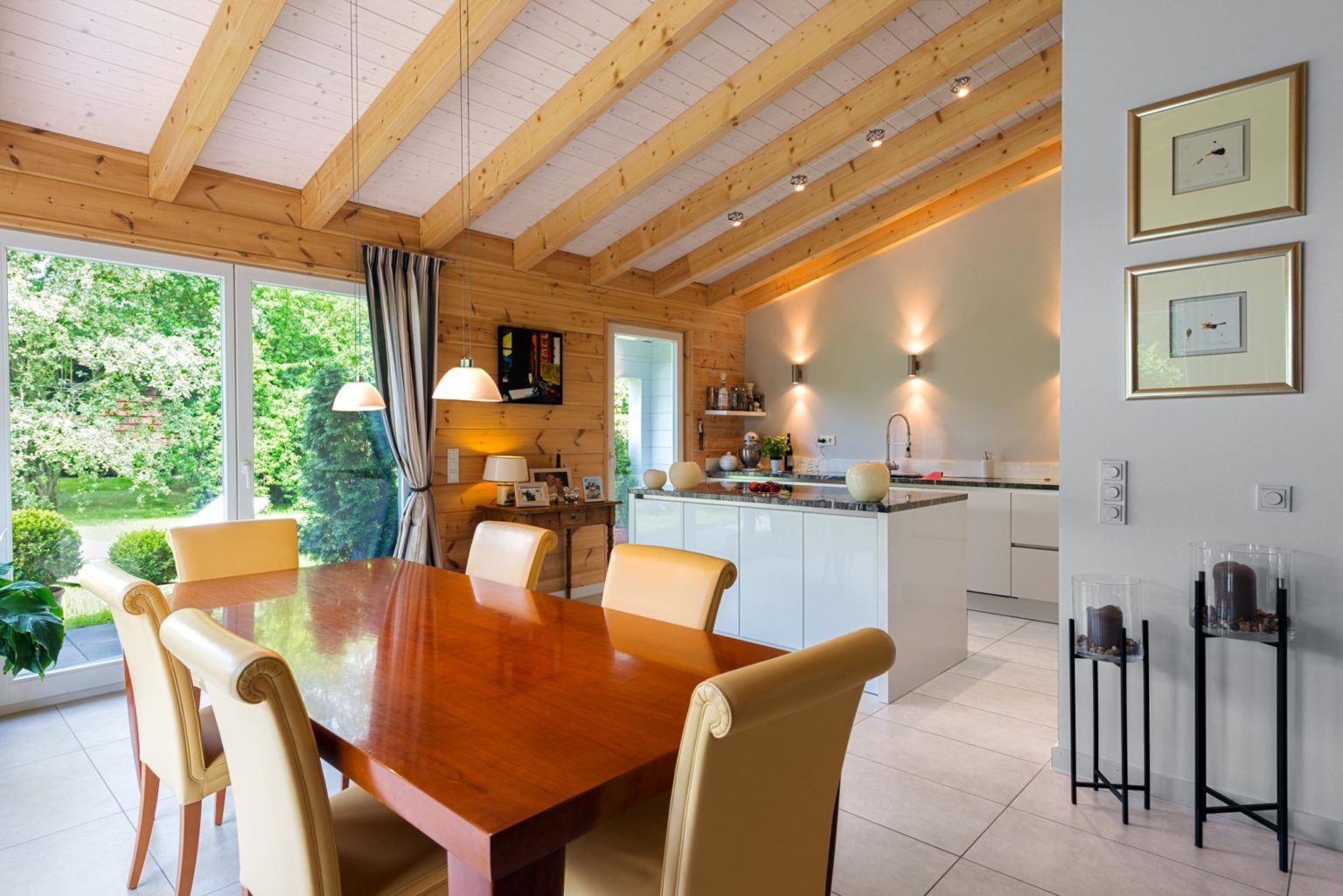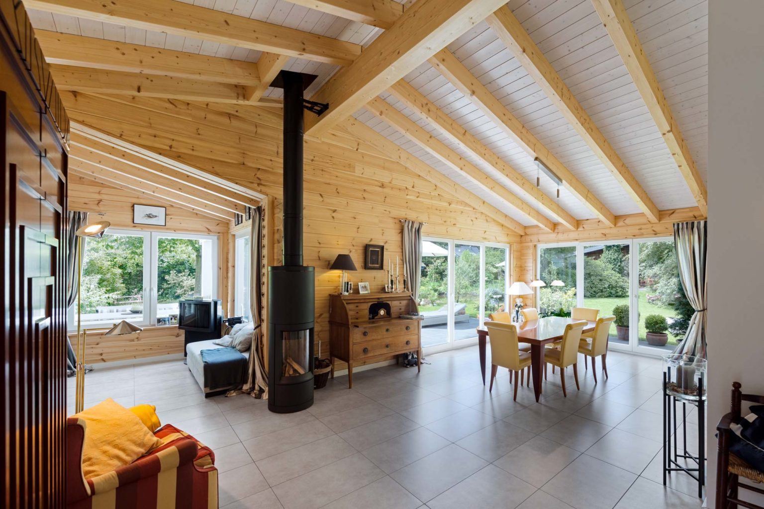 Um ein großzügiges Wohngefühl mit ungehinderter Kommunikation zu erreichen, planten die Hauseigentümer zusammen mit Fullwood einen offenen Wohnbereich, in dem Eingangsbereich, Küche, Esszimmer und Wohnzimmer fließend ineinander übergehen und nur HWR, Gäste-WC, Gästezimmer, Schlafzimmer und Bad separiert sind. Auch der Austritt in den Garten wirkt offen und übergangslos, was besonders für die Dame des Hauses – die sich als „Gartenmensch“ bezeichnet – wichtig ist. Großzügig und „luftig“ wirkt Holzhaus „an der Sülz“ nicht zuletzt dank seiner Raumhöhe, die größer als üblich ist. „Eigentlich wollten wir noch höhere Hauswände, aber unser Fullwood-Berater riet uns dringend davon ab, da der offene Dachstuhl mit den Sichtbalken sonst viel zu hoch gewesen wäre, was schnell ungemütlich sein kann. Wir sind froh, dass wir auf ihn gehört haben.“, sagt der Hausherr. Durch die geschickte Grundrissplanung des Architekten wirkt der weitläufige, offene Wohnbereich dennoch gemütlich, da die einzelnen Bereiche optisch voneinander getrennt und leicht versetzt sind. Im ganzen Holzhaus wurden die gleichen hellen Bodenfliesen verlegt, was die Größe der Gesamtfläche betont und auch optisch ungehinderten Bewegungsfluss zulässt.