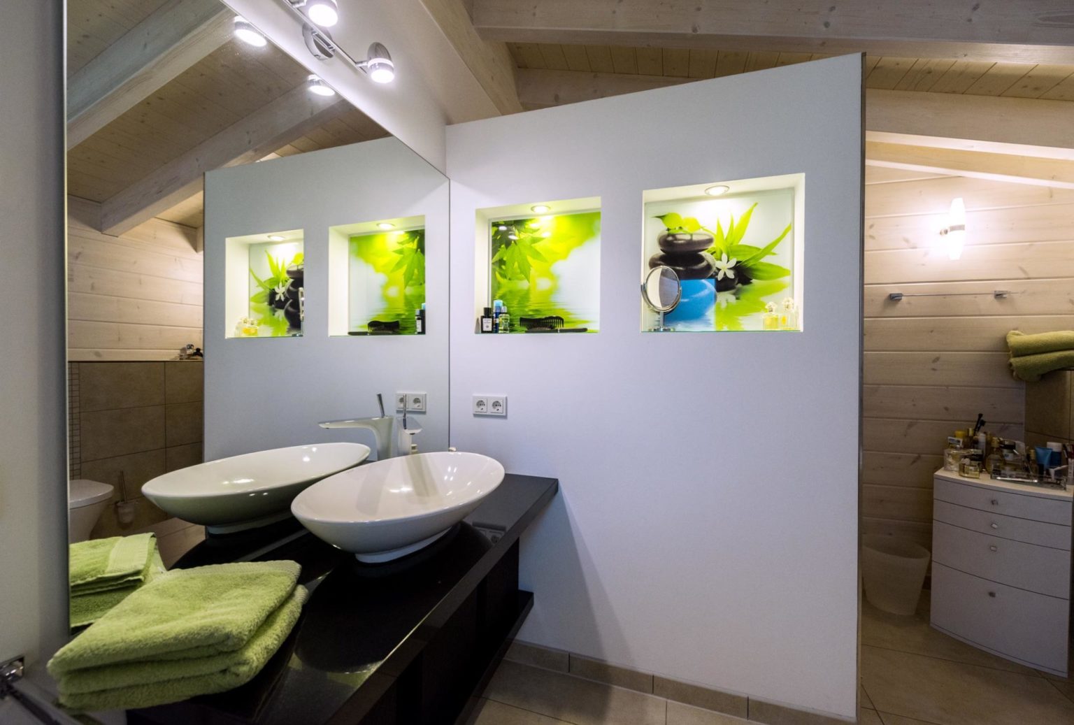 Unter dem Motto „Wohnen für Fortgeschrittene“ bauten Ursula und Hans Unterbusch ihr drittes - und letztes - Haus für den aktuellen Lebensabschnitt, der von den heutigen, sehr aktiven „Golden Agers“ gerne als „Unruhestand“ bezeichnet wird. Mit Vernunft und Blick auf alles, was da noch kommen mag, plante das eingeschworene Ehe-Team einen komplett barrierefreien und rollstuhlgerechten massiven Holzhaus Bungalow auf einem idyllischen Gartengrundstück in überschaubarer Größe. „Mich von unserem großen Haus zu trennen, ist mir nicht leicht gefallen, aber nachdem unsere Kinder ausgezogen waren, stand so viel leer und die Arbeit im riesigen Garten wird später auch nicht leichter.“, erzählt Ursula Unterbusch. Vorübergehend hatte das Paar sich in einer angemieteten Penthousewohnung niedergelassen, aber das behagte den beiden, die immer Haus und Garten gewohnt waren, dann doch nicht. Warum also nicht noch einmal bauen? „Auf ein modernes Holzhaus kamen wir, weil uns das Wohnklima und die Wärmewerte darin überzeugten, und wir auf unseren Bergwanderungen immer vom Holzduft in den Hütten und Almen begeistert sind. „Ökos“ sind wir aber keine.“, erklärt Hans Unterbusch. Entsprechend durfte das Holzhaus bloß keinen „Sauna-Charakter“ besitzen, sondern sollte möglichst hell und luftig sein. Das erreichte das Ehepaar, indem es zu den 20cm starken, naturhellen Kieferwänden weiß oder hellgrau gestrichene Trennwände (Ständerbau) kombinierte, die offene Holzbalkendecke hell lasieren ließ, reichlich bodentiefe Fenster mit weißen Rahmen einbauen ließ und einen Außenanstrich in sehr hellem grau wählte. Der Eindruck eines Sommerhauses auf Long Island liegt nahe.