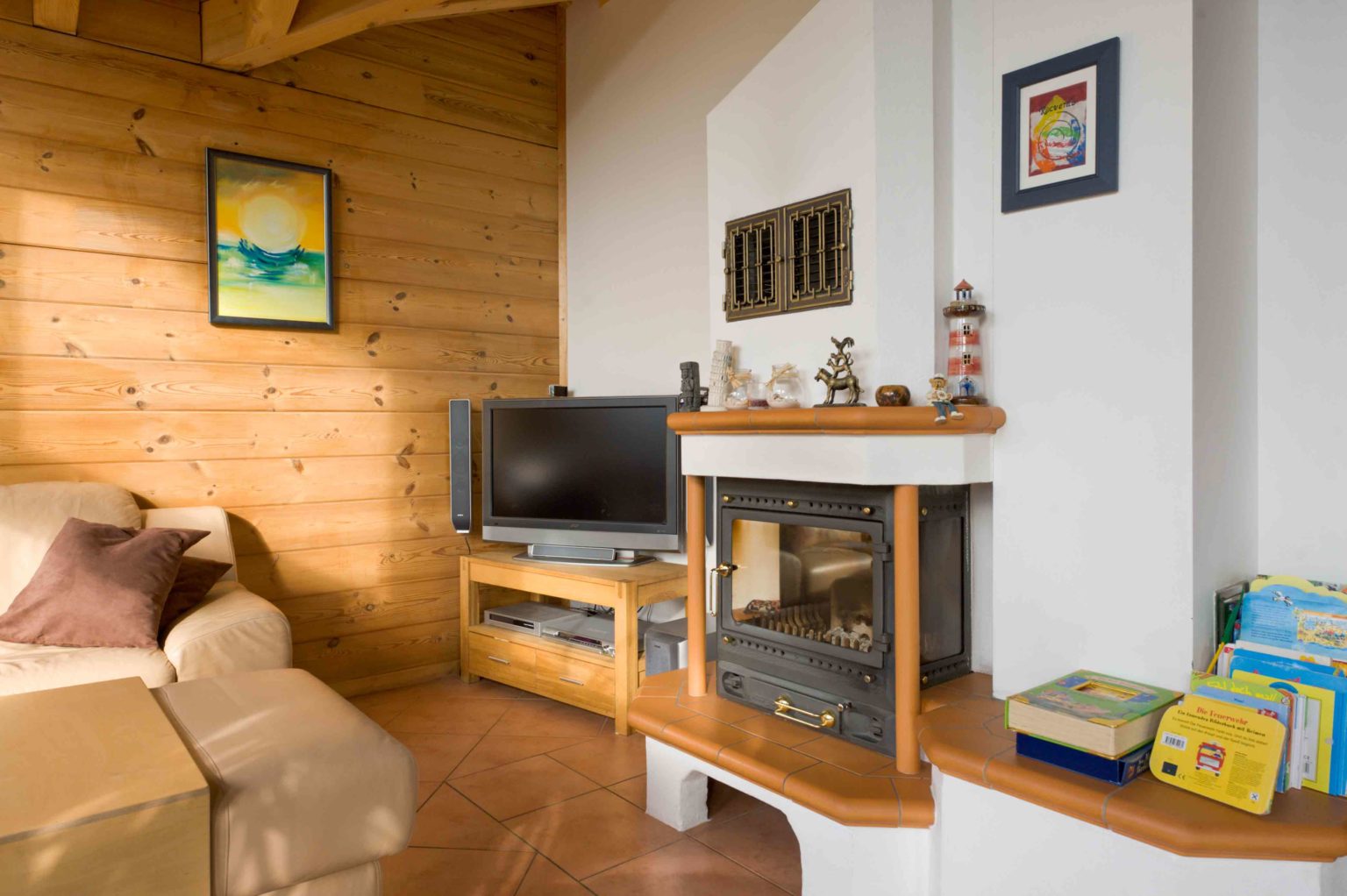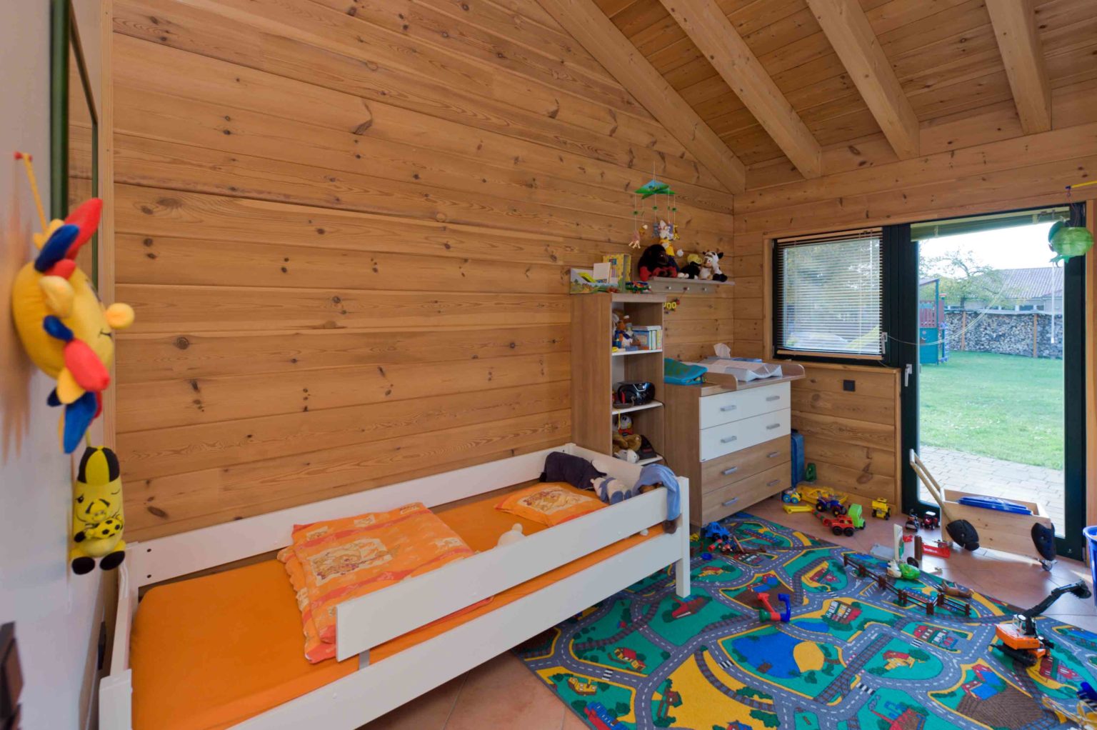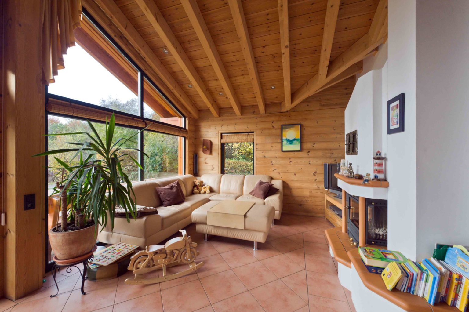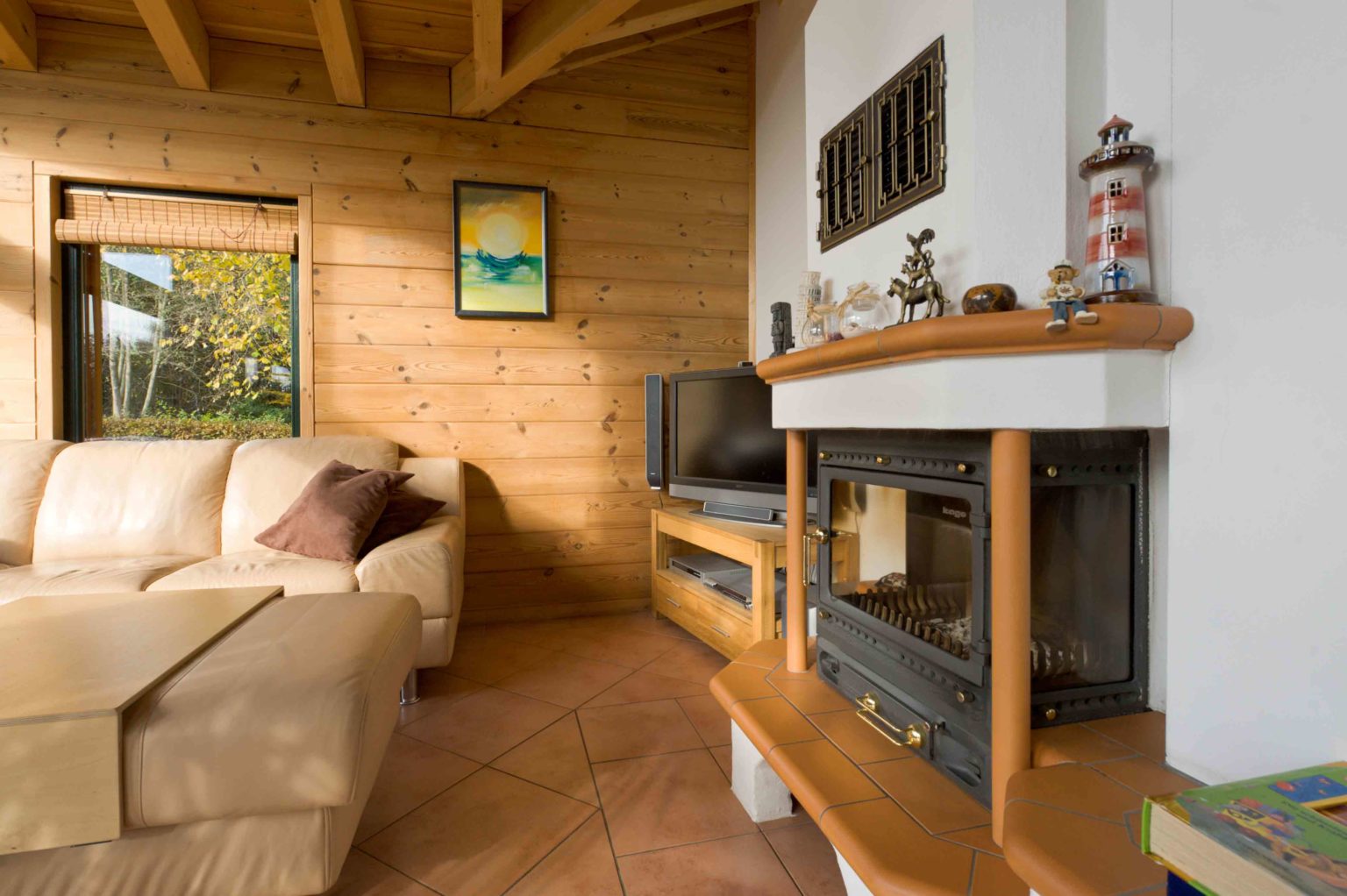 Während die Massivholzwände drinnen nicht behandelt wurden und etwas nachdunkeln dürfen, bekamen sie außen einen gegen Vergrauung vorbeugenden Anstrich im Farbton „Kiefer“. Da Hausherr Frank das „Basteln“ und Werkeln im und am Holzhaus übernommen hatte, strich Ehefrau Manuela im Gegenzug die Holzwände - echtes Teamwork eben. Durch die vor und zurück springenden Wandteile der Hausfassade, entstanden Wind geschützte Sonnenecken an der Gartenseite, und sowohl die Kinderzimmer als auch das Schlafzimmer der Eltern haben, neben dem Wohnzimmer, eigene Zugänge zur ums Haus laufenden Gartenterrasse. Die solaren Anlagen auf dem Hausdach erzeugen Strom und Warmwasser, und fallen optisch auf den dunklen Tonziegeln kaum auf. Das solar gewärmte Wasser speist neben Küche und Bad auch die Fußbodenheizung. Wenn der Winter gar zu dunkel und kalt ist, und die Strahlungswärme des Kaminofens im Wohnbereich die Schlafzimmer am anderen Hausende nicht erreicht, wird die Fußbodenheizung mit Hilfe einer Wärmepumpe betrieben. Der „grün“ erzeugte Strom aus der Photovoltaik-Anlage senkt die Kosten des gesamten Stromverbrauchs enorm. Die speziellen, winddichten und setzungsfreien Kiefernwände des Holzhausherstellers halten ohne zusätzliche Dämmung die Wärme gut drinnen. „Massivholzhäuser besitzen einen wissenschaftlich bestätigten, psychologischen Effekt: Man fühlt sich in ihnen schon bei 2-3 Grad niedrigeren Temperaturen behaglich. Das spart Heizenergie, senkt somit die Betriebskosten, und verhindert überheizte Räume, die der Gesundheit nicht zuträglich sind.“, erklärt Manuela Hamacher. „Im Sommer wirken die Wände sogar wie eine natürliche Klimaanlage und schützen die Räume vor Überhitzung. Und die Feuchtigkeit ausgleichende Eigenschaft von Holz bewirkt insgesamt ein sehr gesundes Raumklima, das selbst Allergikern wohltut.“, fährt sie fort.