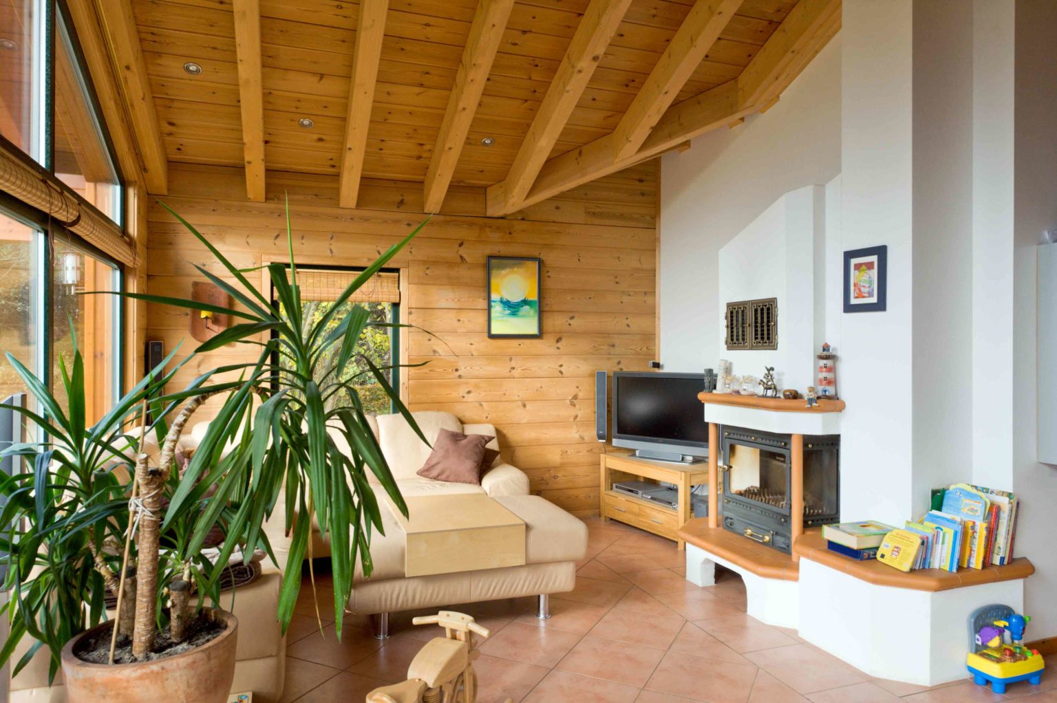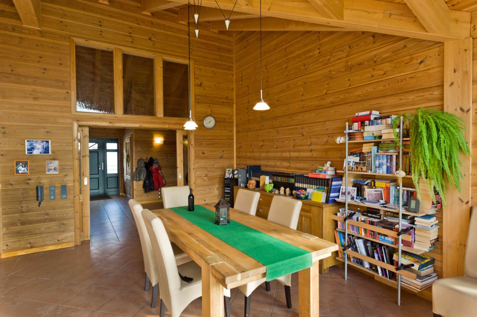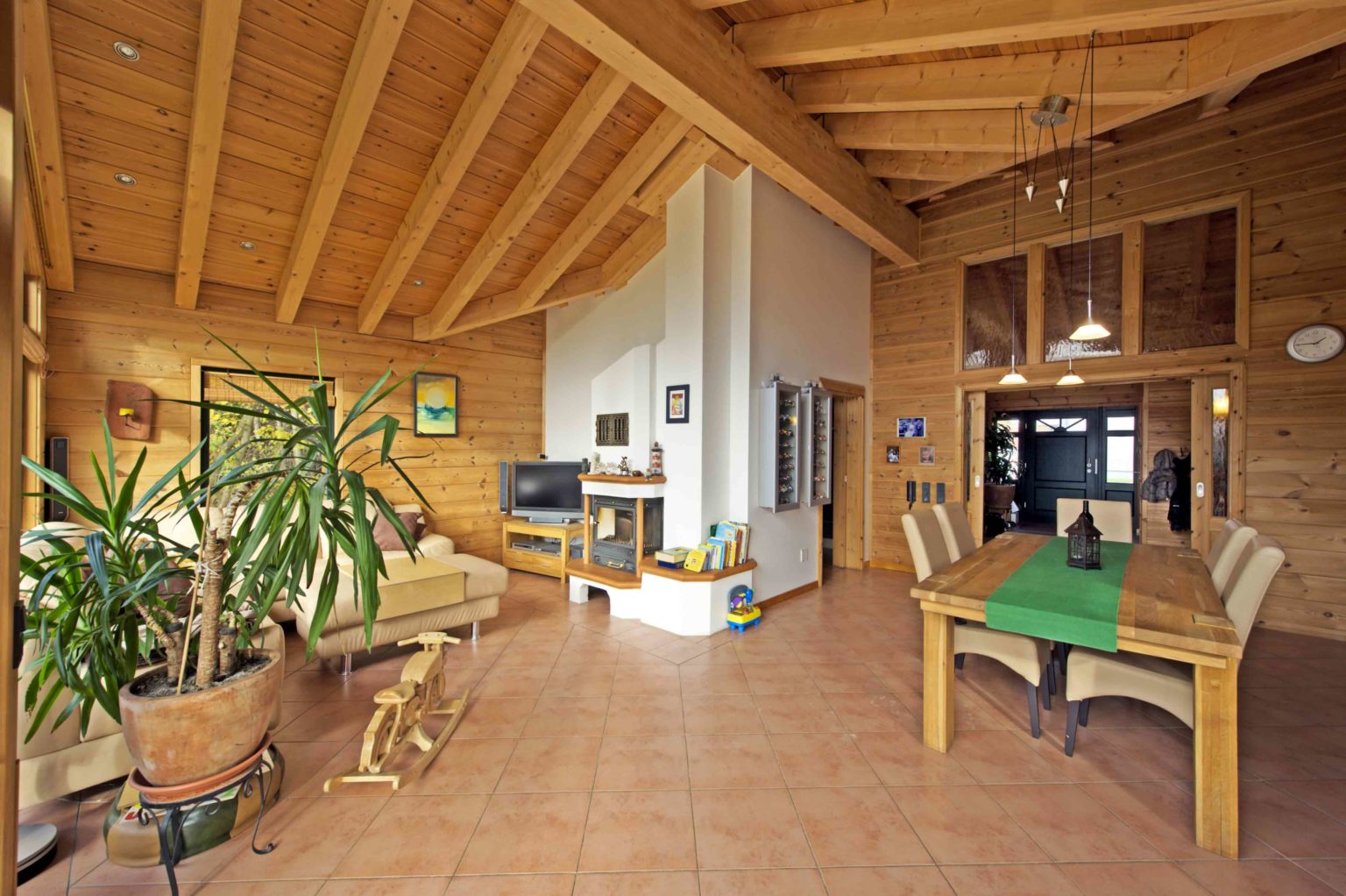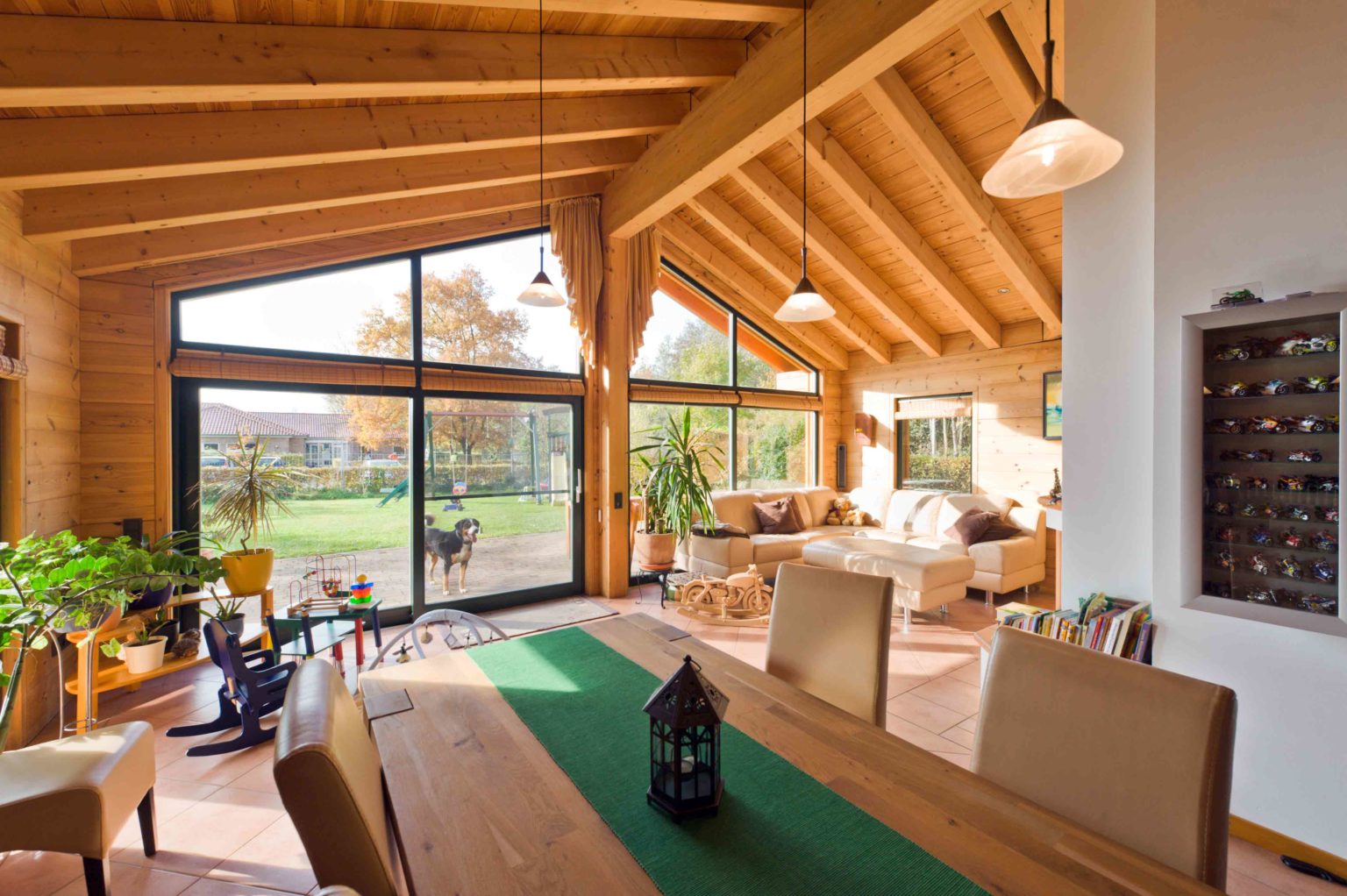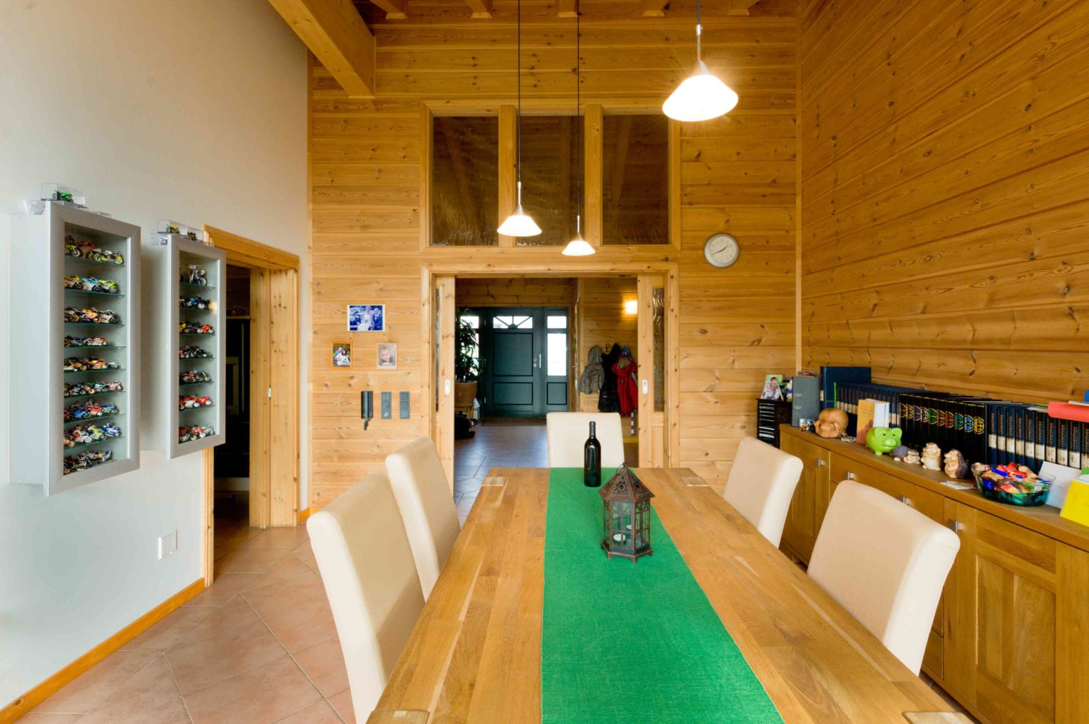 Der auf den ersten Blick verschachtelt wirkende Grundriss ist ein musterhaftes Beispiel für barrierefreies Bauen: ebenerdig, großräumig und Rollstuhlgerecht. Das heißt: Alle Türen sind breiter als gewöhnlich; die Schwellen an den Außentüren sind extrem niedrig; sämtliche Fenster sind niedriger als üblich, ebenso die Tür- und Fenstergriffe sowie die Lichtschalter; die Dusche ist extra breit; und die gesamte Küche ist „unterfahrbar“. Vom Abstellraum neben der Küche führt ein Aufzug in den Keller, außerdem gelangt man vom Abstellraum bequem und trockenen Fußes in die geräumige Garage. Die im Holzhaus installierte Staubsauger-Anlage mit Einkehrdüse in der Küche erleichtert die Hausarbeit. Die Räume im Bungalow sind klassisch in einen öffentlichen Bereich (für Bewohner und Gäste) und einen privaten Bereich (nur für die Bewohner) unterteilt. Betritt man das Holzhaus durch die Eingangstüre, gelangt man zuerst in eine geräumige Diele. Linker Hand befindet sich sofort die Tür zum Gäste-WC, ein paar Schritt weiter gelangt man links in den Privattrakt mit Flur, zwei Kinderzimmern, dem Schlafzimmer und dem Wohnbad. Geradeaus öffnet sich der Wohn-Ess-Koch-Bereich, der durch eine zweiflügelige Schiebetür verschließbar ist. Diese schützt vor Zugluft aus dem Eingangsbereich, lässt aber, dank großer Glasscheiben, Licht in die ansonsten Fensterlose Diele. Auch die hohe Wand über der Schiebetüre ist deshalb verglast. Die L-Form des Wohnbereichs trennt optisch in Essbereich und gemütliche Sofa-Kaminofen-Ecke. In die separate Küche geht es vor dem Esstisch rechts. Die enorme Deckenhöhe bis zum offenen First unterstreicht das großzügige Raumgefühl und die offene Balkendecke verleiht dem modernen Holzhaus bodenständigen Charakter. Die Trennwände bestehen aus Ständerwerk, das teilweise weiß verputzt wurde, um zusätzliche Helligkeit ins Holzhaus zu bringen. Das üppig durch die großen Fensterflächen in den Wohnbereich hereinfließend Tageslicht lässt die Massivholzwände leuchten und wird strahlend von den weißen Wandflächen reflektiert.