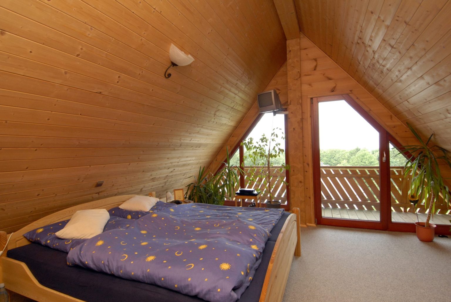 Die sich an der Nordostseite des Gebäudes befindende Eingangstür führt in eine geräumige Diele. Von dort erreicht man über das Treppenhaus sowohl die oberen als auch das untere Geschoss, oder geht geradeaus am Gäste WC vorbei, um das Wohnzimmer zu betreten. Dieses öffnet sich, ohne trennende Wand, nach links zu Essbereich und Küche hin. Eine Fensterschiebetür gewährt Zutritt zu Terrasse, Balkon und Garten. Rundherum können die Hausbewohner von innen wie außen die herrliche Aussicht über Täler und Hügel genießen. Eine weitere Tür führt von der Küche durch einen kleinen Flur in die angebaute Garage, so dass man trockenen Fußes vom Auto ins Holzhaus gelangen kann. Nachträglich angebaut wurde ein Hauswirtschaftsraum, der durch besagten Flur erreichbar ist. So wurde die ursprüngliche Außenwand zur Innenwand. Im geräumigen Wohnbereich des Erdgeschosses spielt sich das turbulente Familienleben um den großen weiß verputzten Kaminofen ab. Einige ebenfalls in Weiß verputze Wände tragen im ganzen Holzhaus zur Auflockerung bei. Mit viel Liebe zum Detail dekoriert die Hausherrin immer wieder der Jahreszeit entsprechend ihr Holzhaus um. Ein besonderer Hingucker ist die alte Holzbank auf dem Balkon, die Jahrzehnte in einer Kirche zum Sitzen diente und nun als geschmackvoll dekoriertes Stillleben das Holzhaus schmückt. Eine weitere ungewöhnliche Zier ist die antike französische Wanduhr im Essbereich. Im Obergeschoss befinden sich zwei Kinderzimmer, ein Gästezimmer und das große Familienbad. Die Wände sind verputzt, in den Kinderzimmern tapeziert und im Bad teilweise gefliest. Das Schlafzimmer im ausgebauten Spitzboden wird hingegen ganz von Holz dominiert. Der weiche Teppichboden macht den Raum zusätzlich kuschelig. Ein weiteres Duschbad mit Toilette komplettiert die elterliche Privatsphäre.